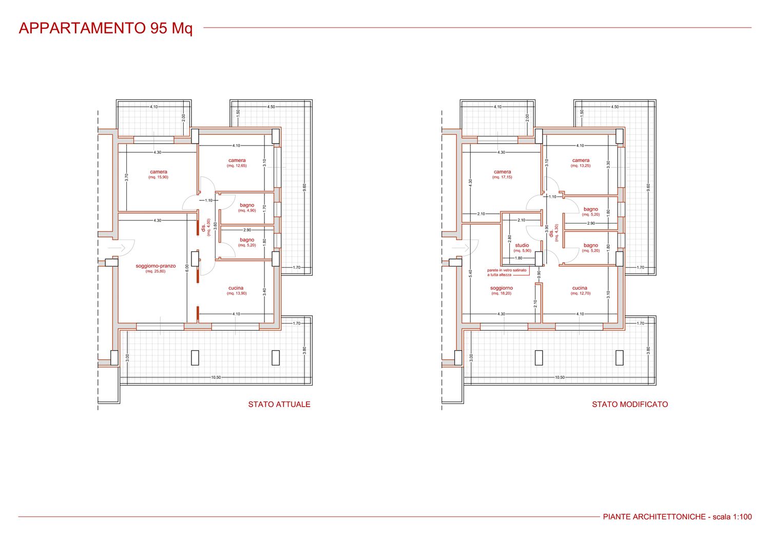 La soluzione progettuale presentata si prefigge di non stravolgere l’impostazione attuale mantenendo la destinazione d’uso degli ambienti nelle zone già previste onde evitare problemi di stravolgimento impiantistico. Pertanto si è agito con piccole modifiche agli spazi mediante un ridimensionamento delle due camere e della cucina, l’equiparazione dei due bagni e la creazione della stanza studio nella zona di ingresso dell’appartamento ed accessibile dal disimpegno esistente; la stessa sarà tamponata con una schermatura non opaca per permettere il passaggio diretto della luce proveniente dal finestrone del soggiorno e garantire una illuminazione naturale del nuovo spazio.
