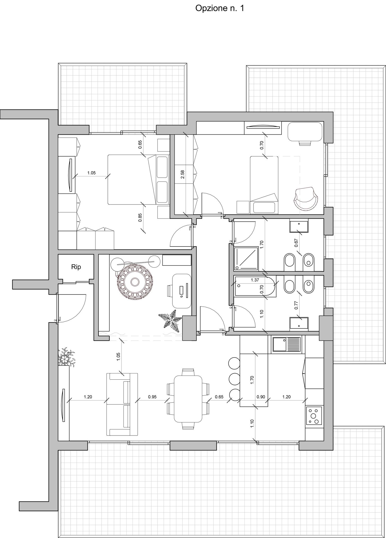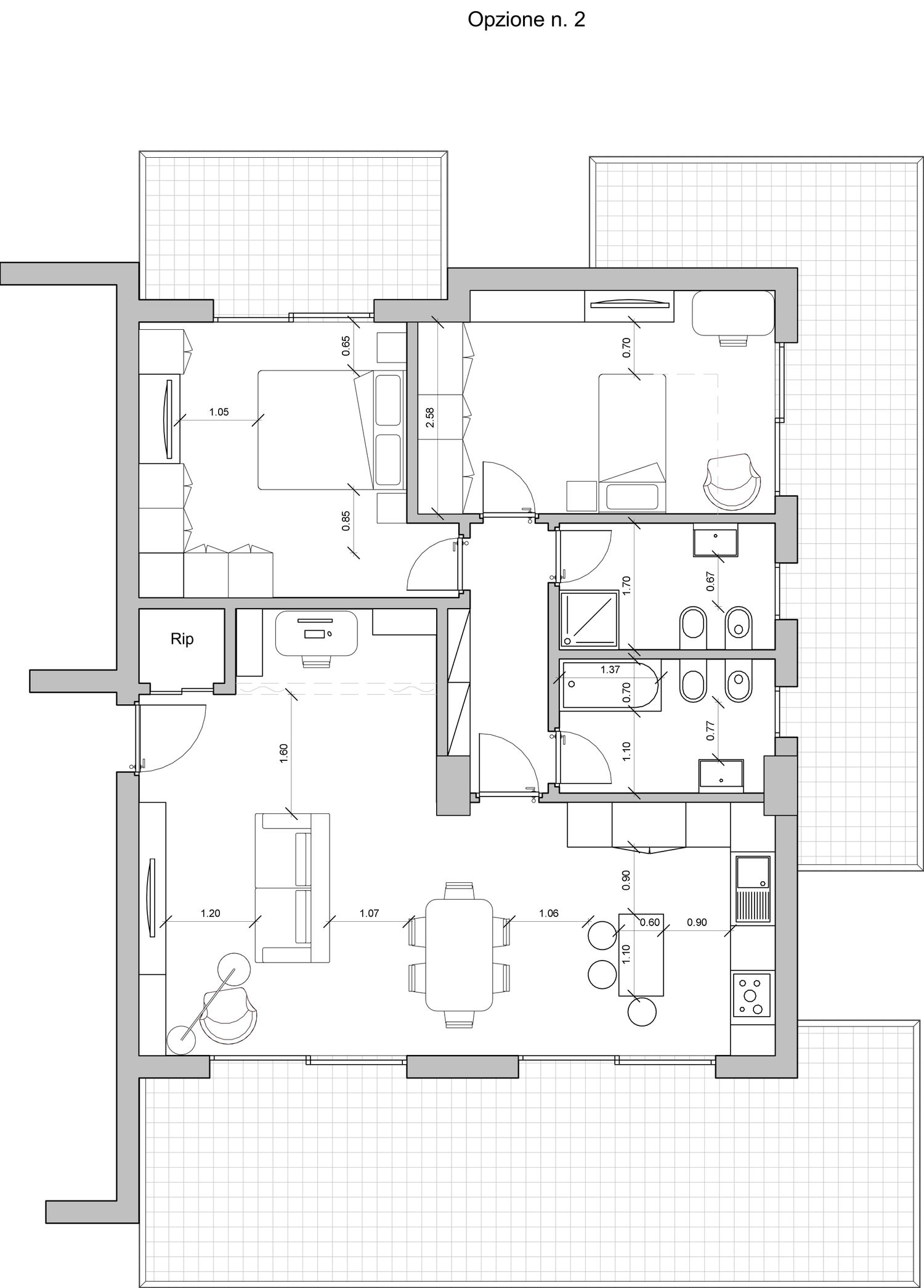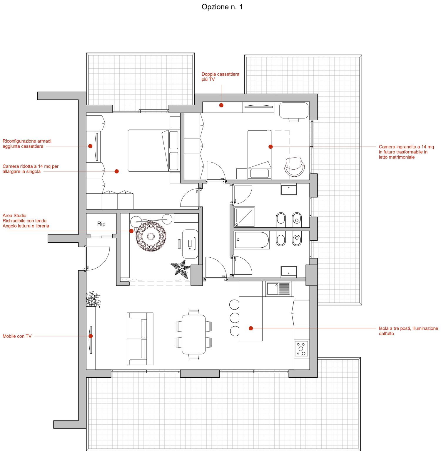 Il progetto propone tre alternative che rispondono alle esigenze espresse, nel rispetto della normativa vigente (evitando spazi chiusi non finestrati).