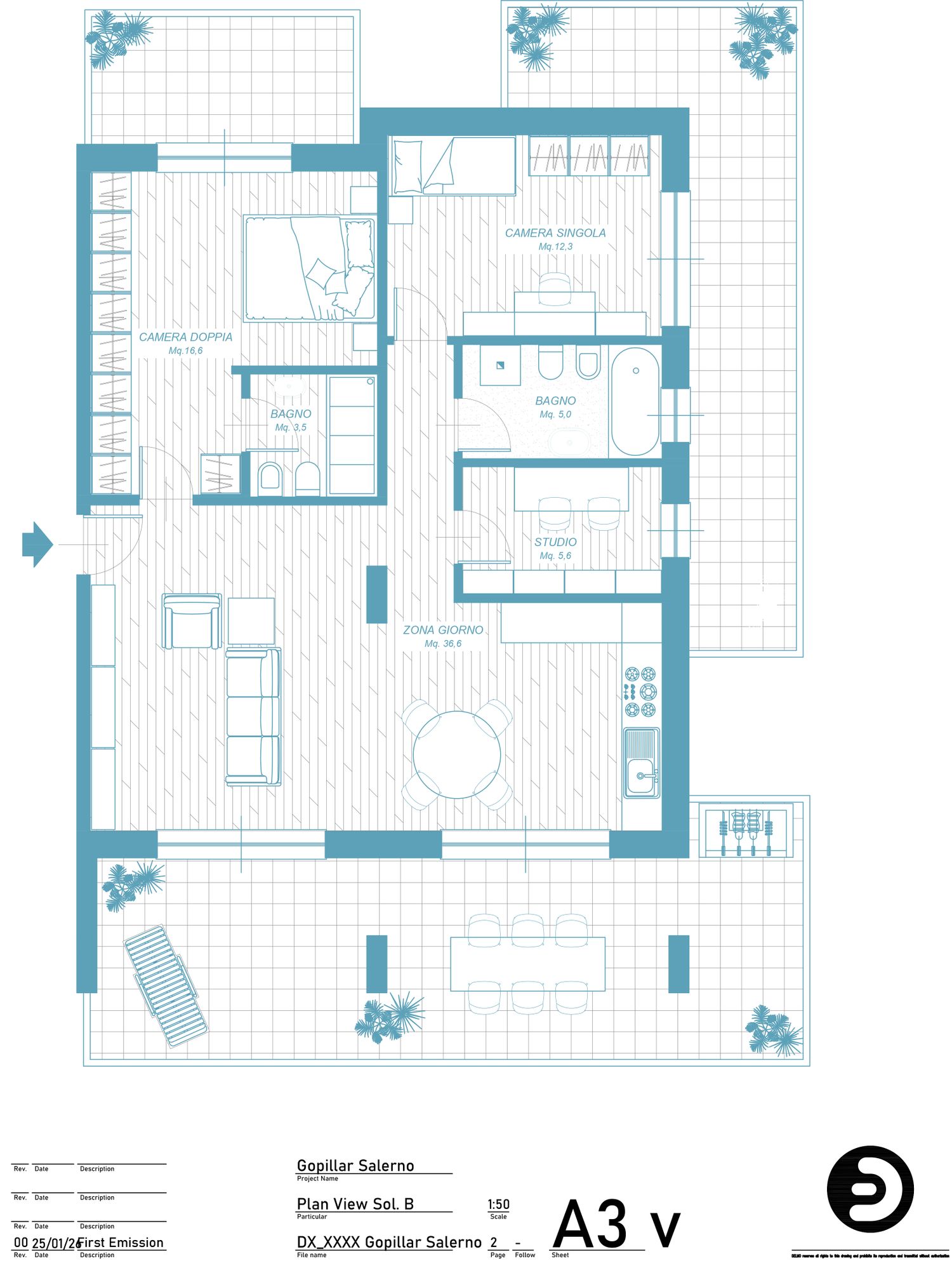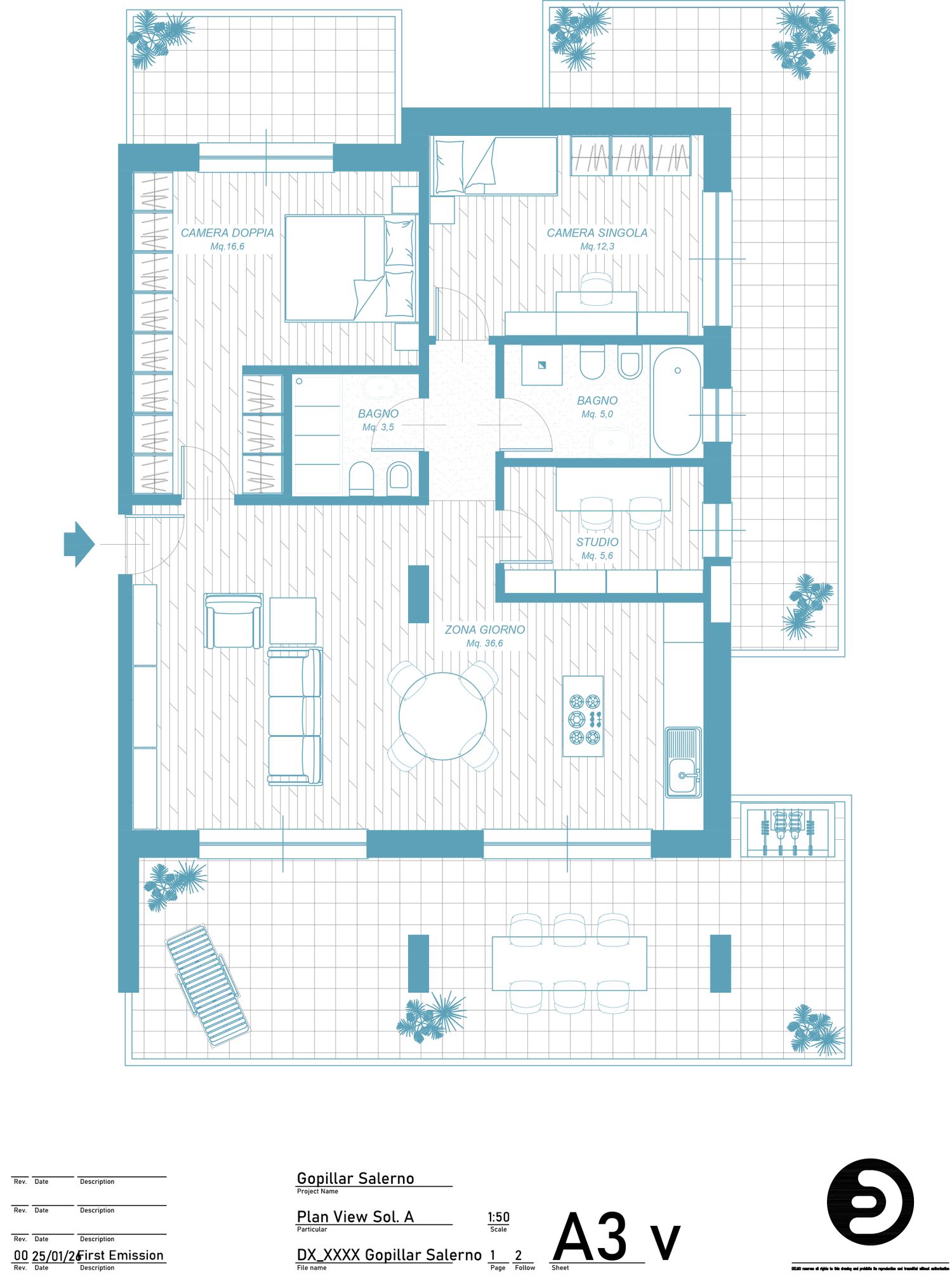 Buonasera, la soluzione proposta risponde alle richieste del brief, definendo: - una grande zona giorno 36 mq - due camere da letto - uno studio - due bagni, uno con doccia ed uno con vasca.