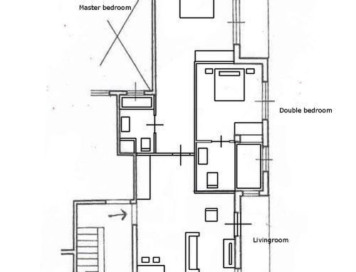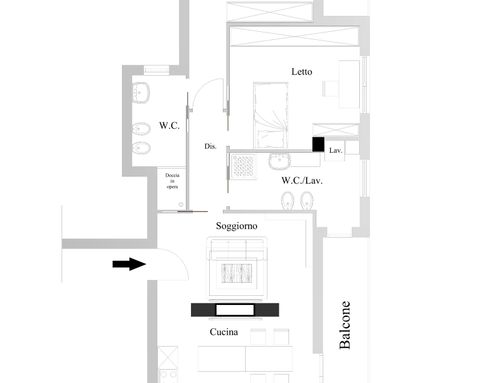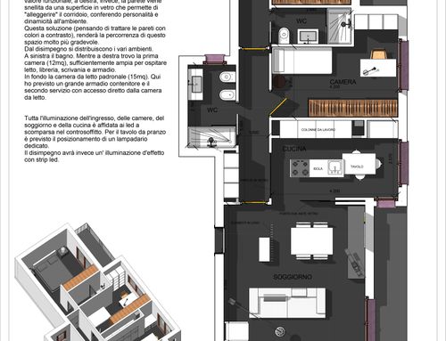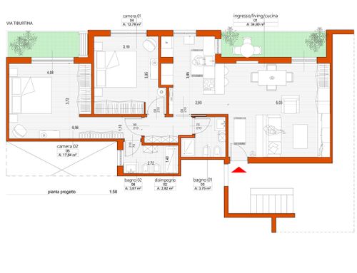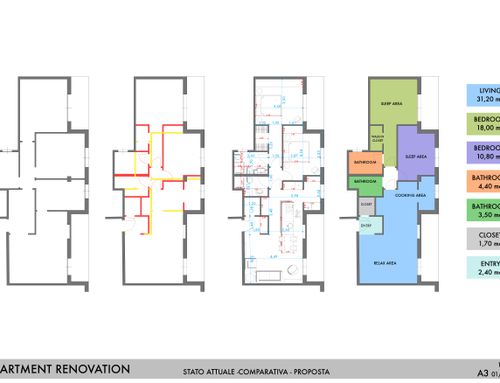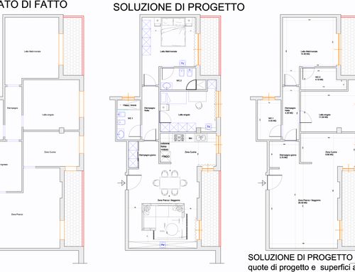 Desidero ristrutturare questo appartamento e cambiarne la disposizione. In particolare avrei bisogno di ricavare due camere da letto, una di non meno di 14 m2 e una se possibile di non meno di 12. Inoltre avrei bisogno di due bagni, di cui uno se possibile en suite nella camera matrimoniale.