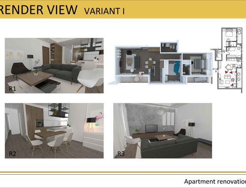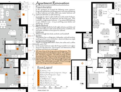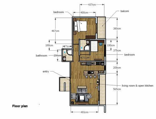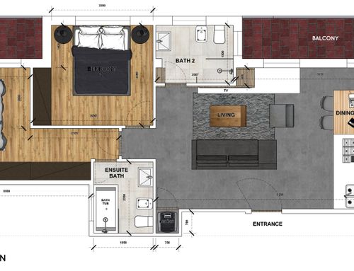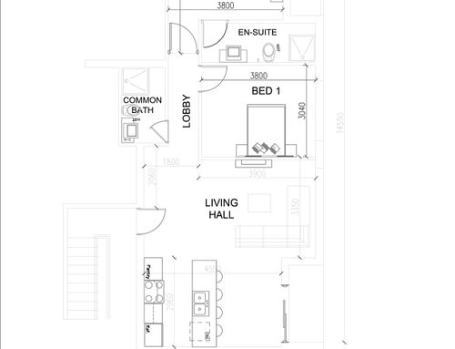 I’d like to redesign this apartment changing the internal disposition of the spaces. In particular I need to create two bedrooms, one should be at least of 14sqm and the other at least of 12 sqm if possible. Then I need two bathrooms, if possible I would like one to be en-suite in the master bedroom. I’d like the living-dining area to be open space with an American kitchen with island.
