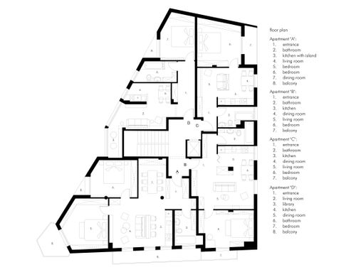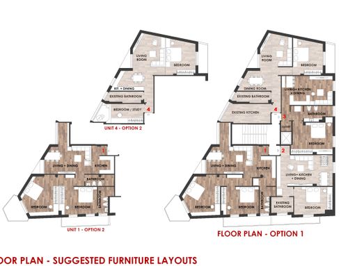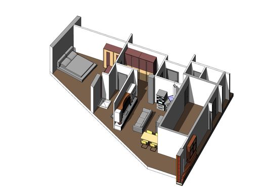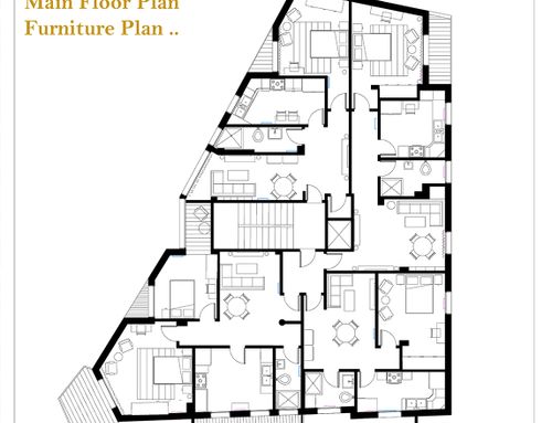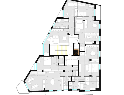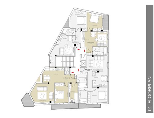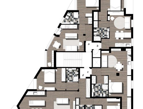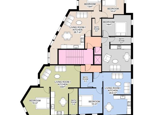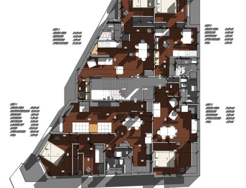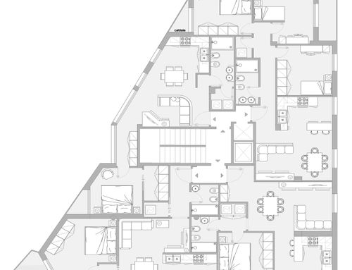 Se tienen que crear 4 soluciones diferentes: 1 apartamento de tres habitaciones y 3 apartamentos de dos habitaciones de 250 m²