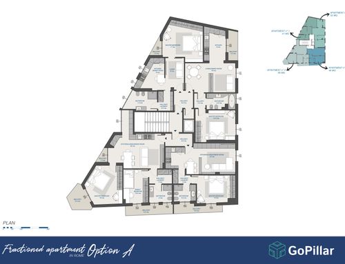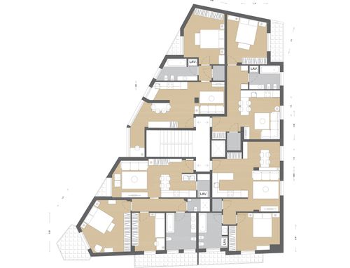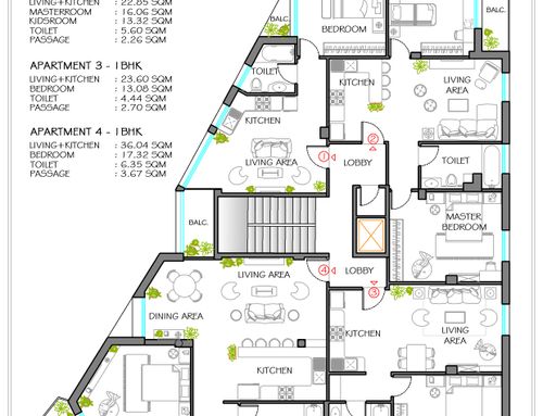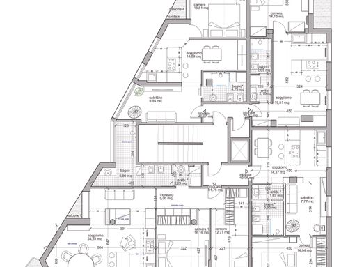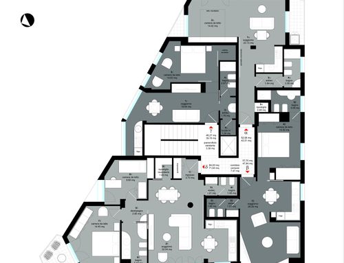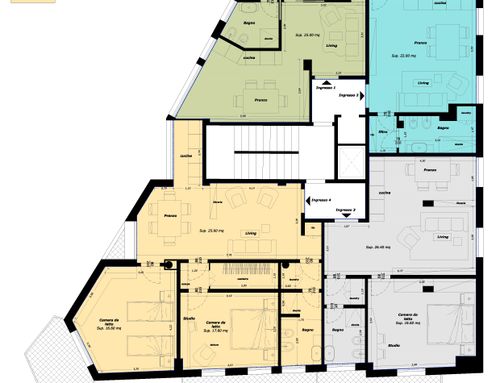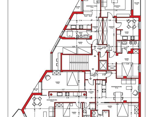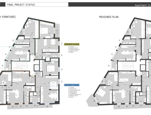 Please note about these details: all the double bedrooms must be at least 14 square meters and all the single bedrooms must be at least 9 square meters. The bathrooms cannot have direct access to the living room if they are not separated by the passageway. The living room need to have an open kitchen (not separated spaces). You will find attached the metric survey of the apartment.