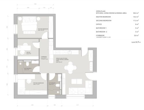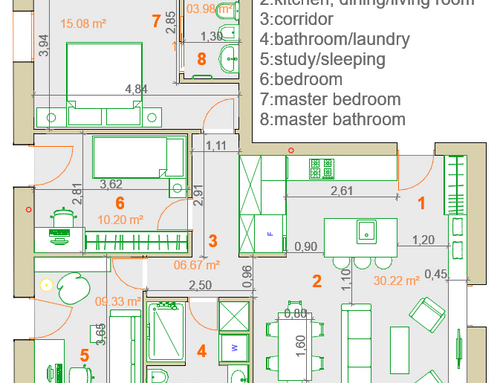 - a living area (living room-kitchen) as large as possible, however minimum 30 square meters