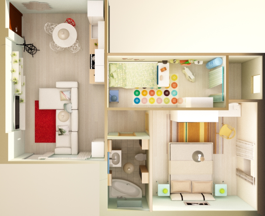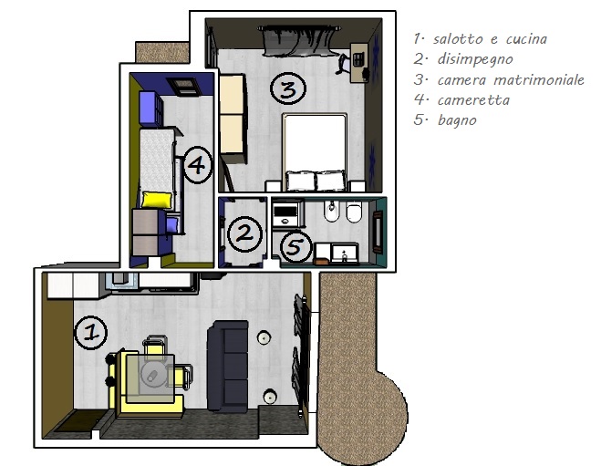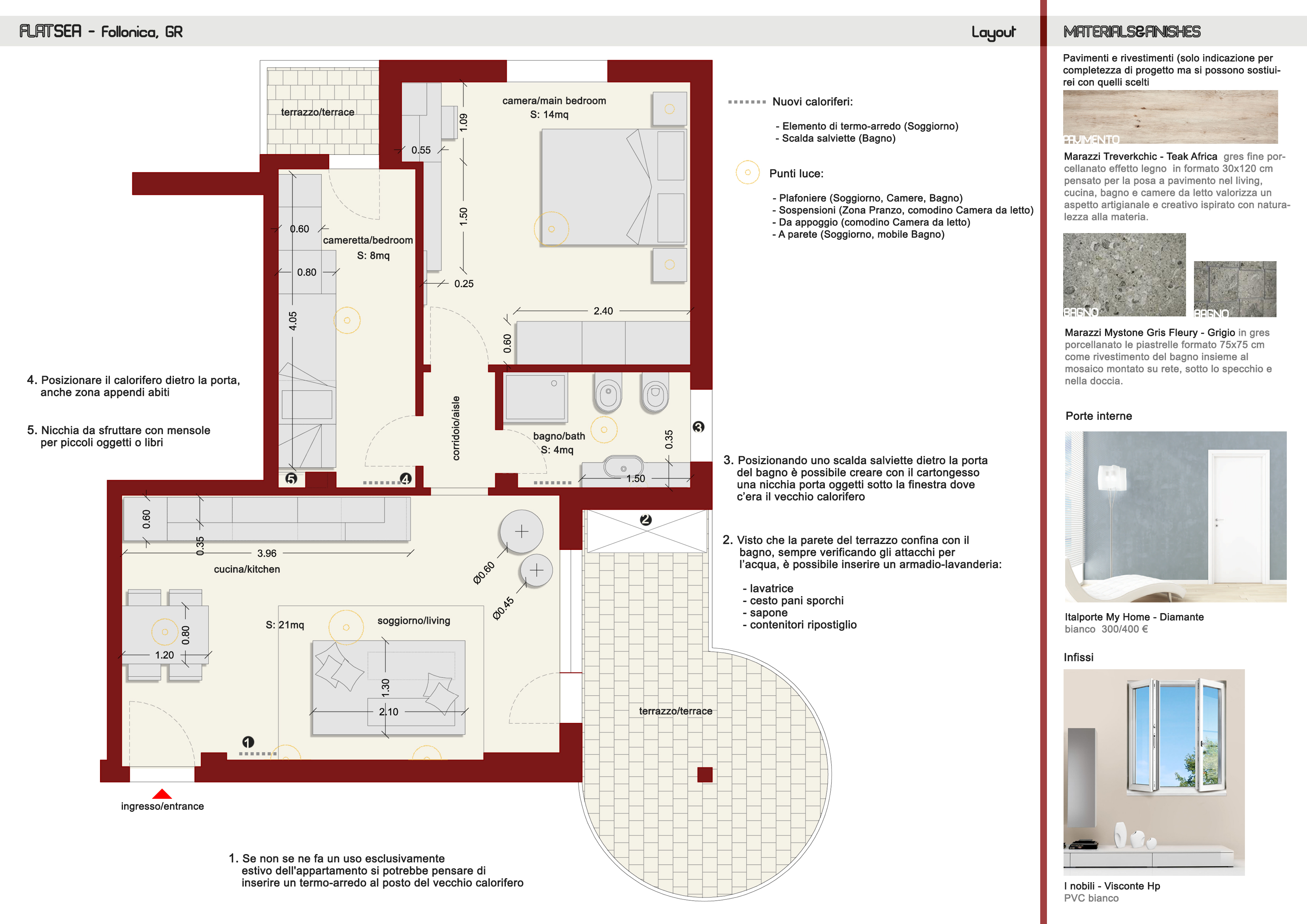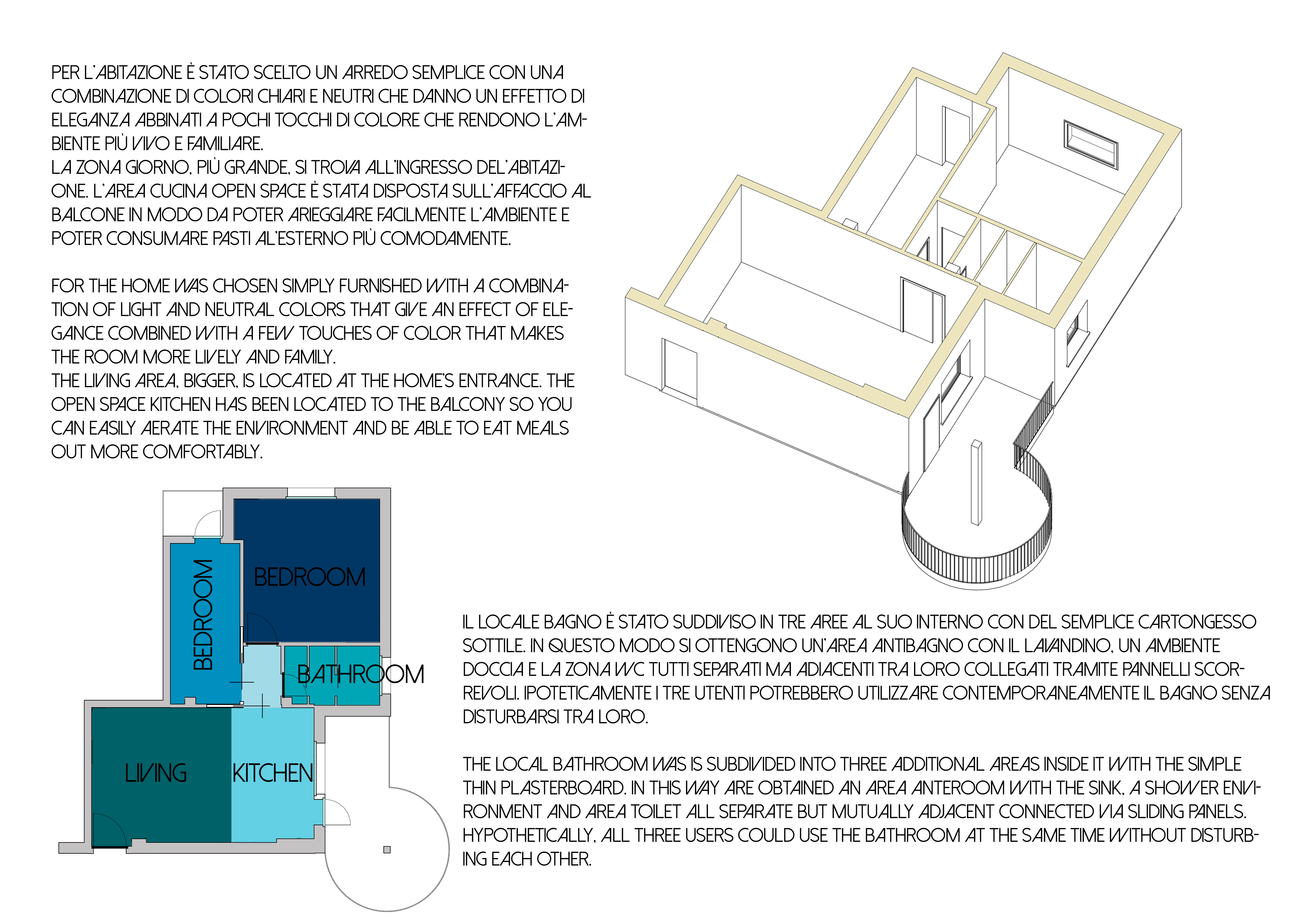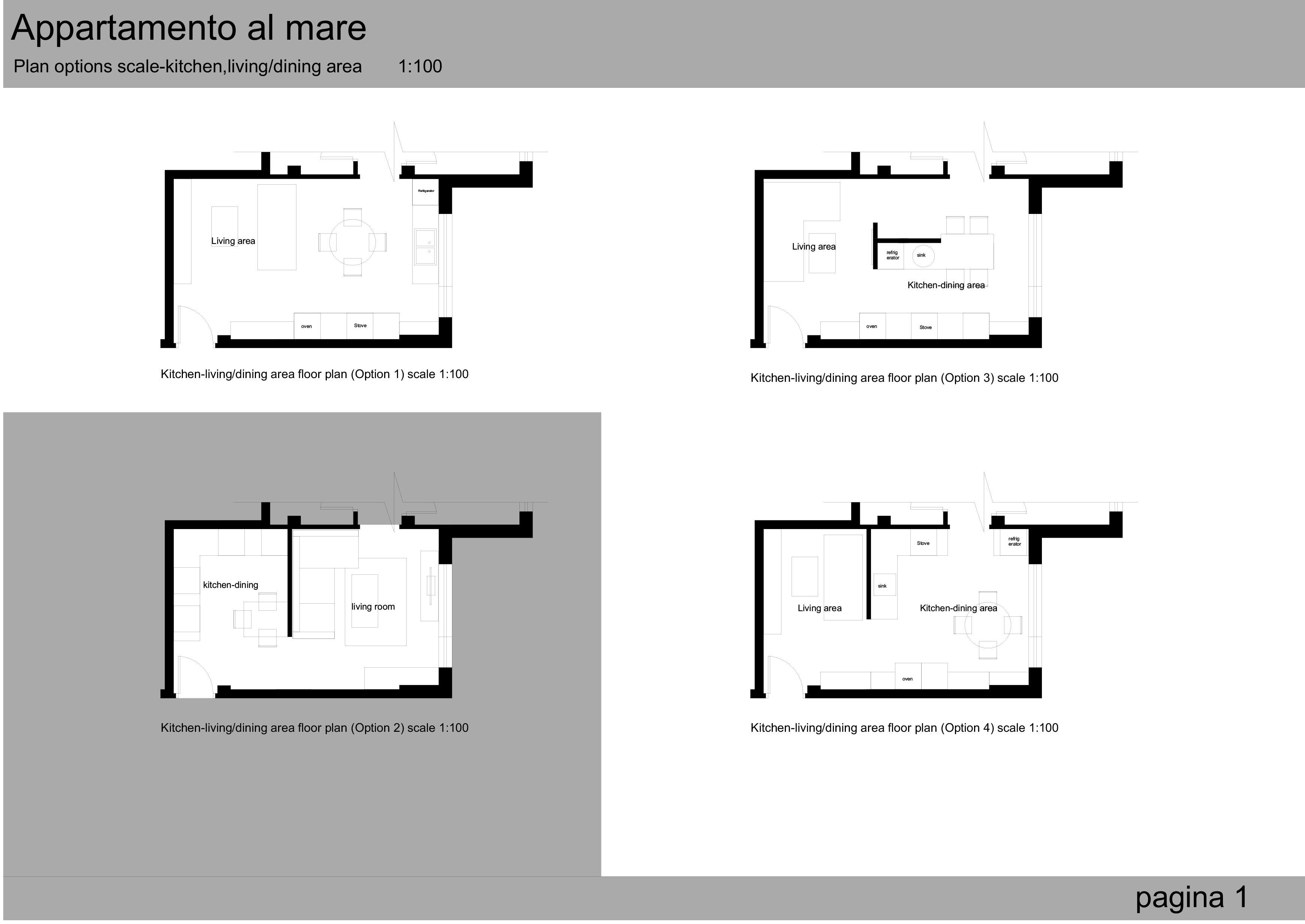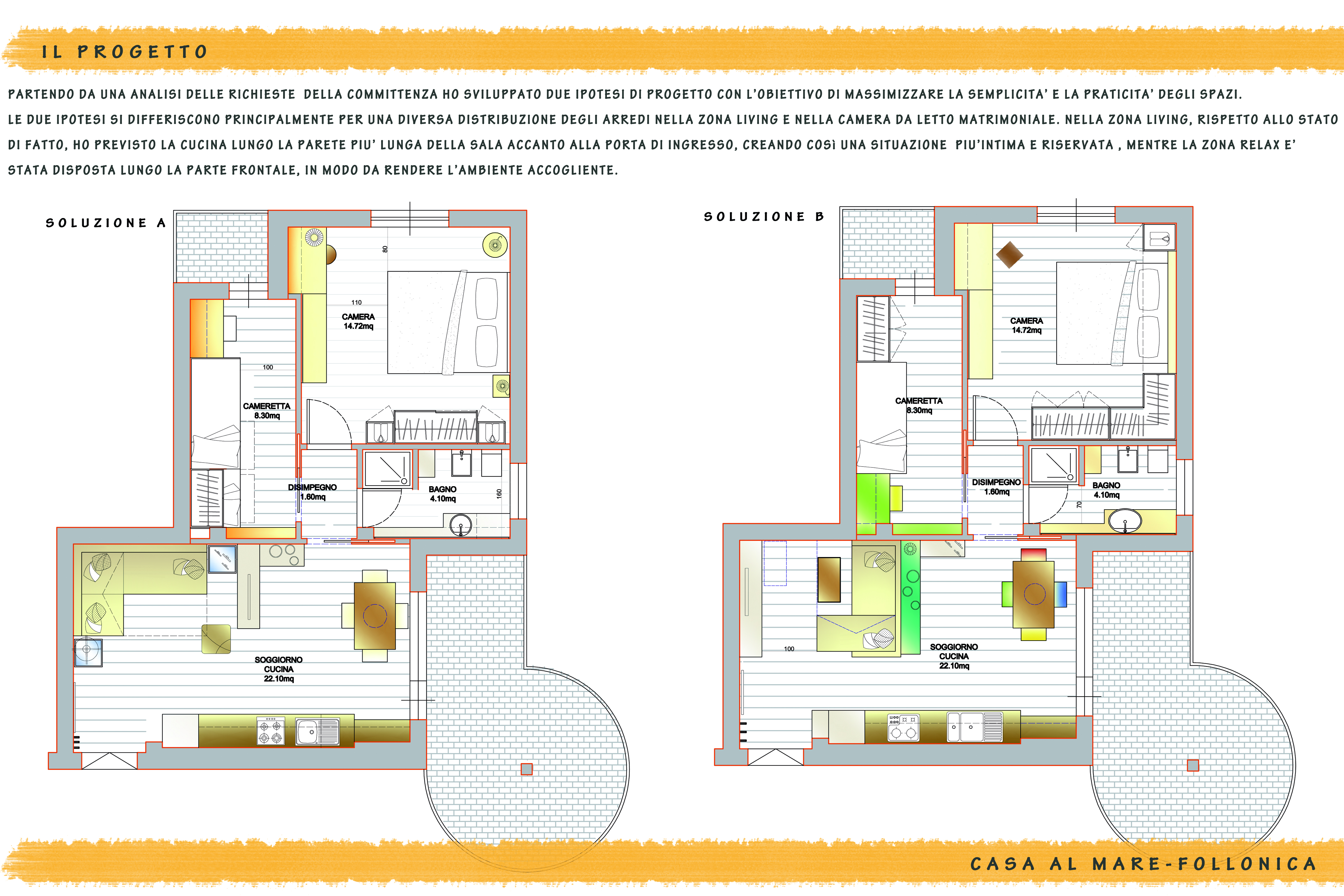 Dato che l’appartamento è di circa 55 mq, sarebbe interessante prevedere dei posti letto aggiuntivi (pensavamo ad un divano letto nella zona soggiorno). Dato l’utilizzo dell’appartamento, ci piacerebbe che all’interno della cucina soggiorno predominasse la zona relax-soggiorno, rispetto all’angolo cottura.