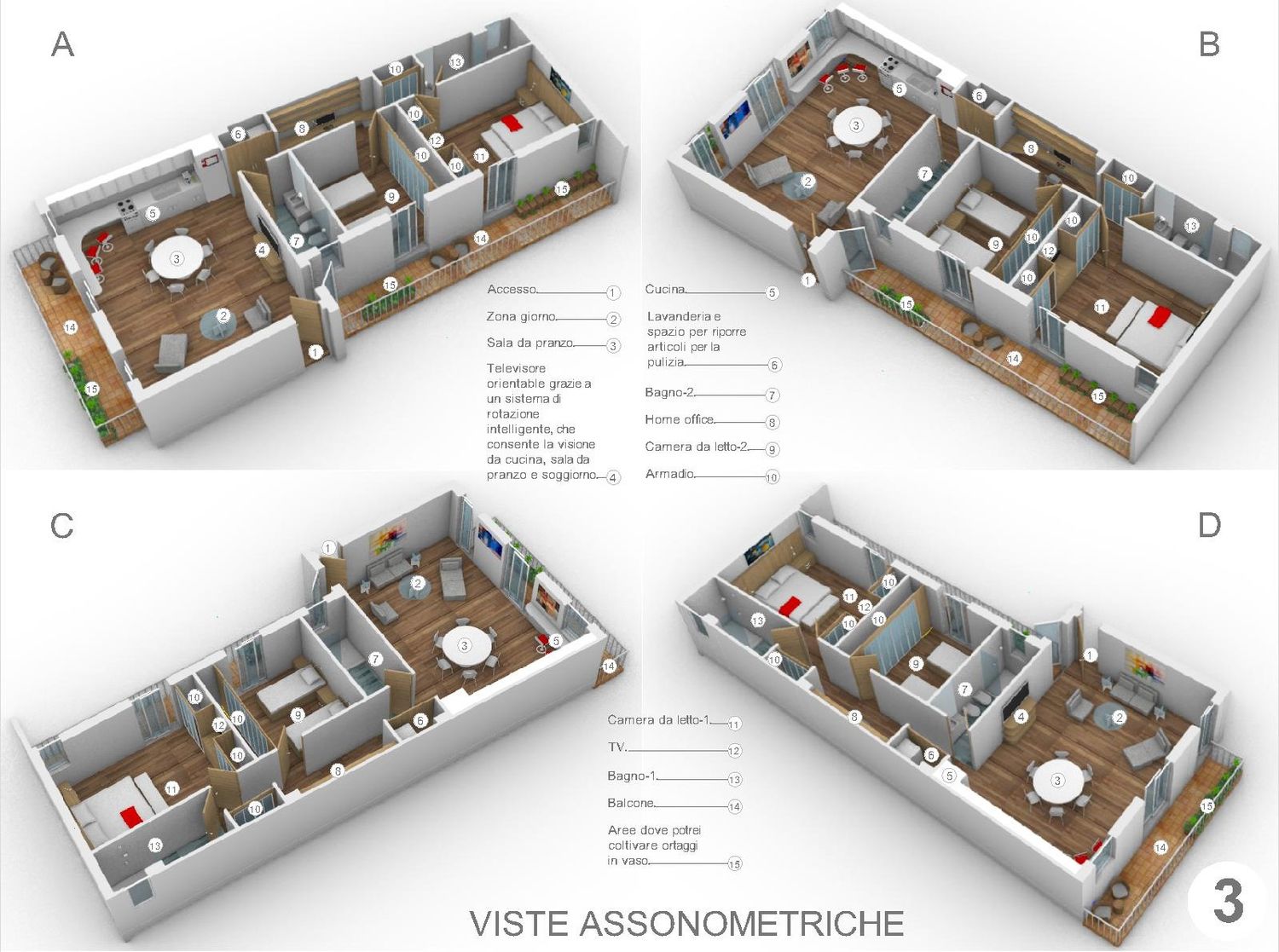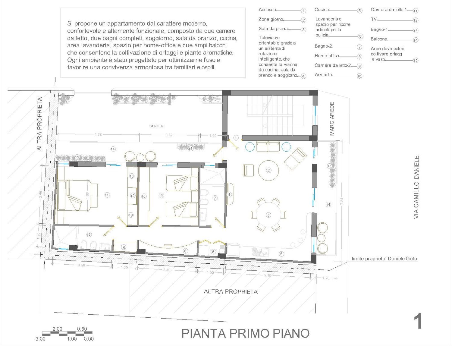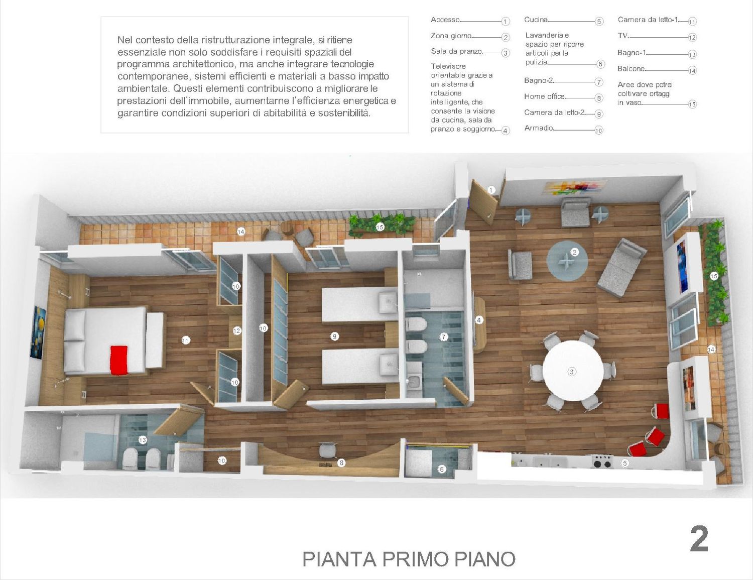 Si propone un appartamento dal carattere moderno, confortevole e altamente funzionale, composto da due camere da letto, due bagni completi, soggiorno, sala da pranzo, cucina, area lavanderia, spazio per home-office e due ampi balconi che consentono la coltivazione di ortaggi e piante aromatiche. Ogni ambiente è stato progettato per ottimizzarne l’uso e favorire una convivenza armoniosa tra familiari e ospiti.