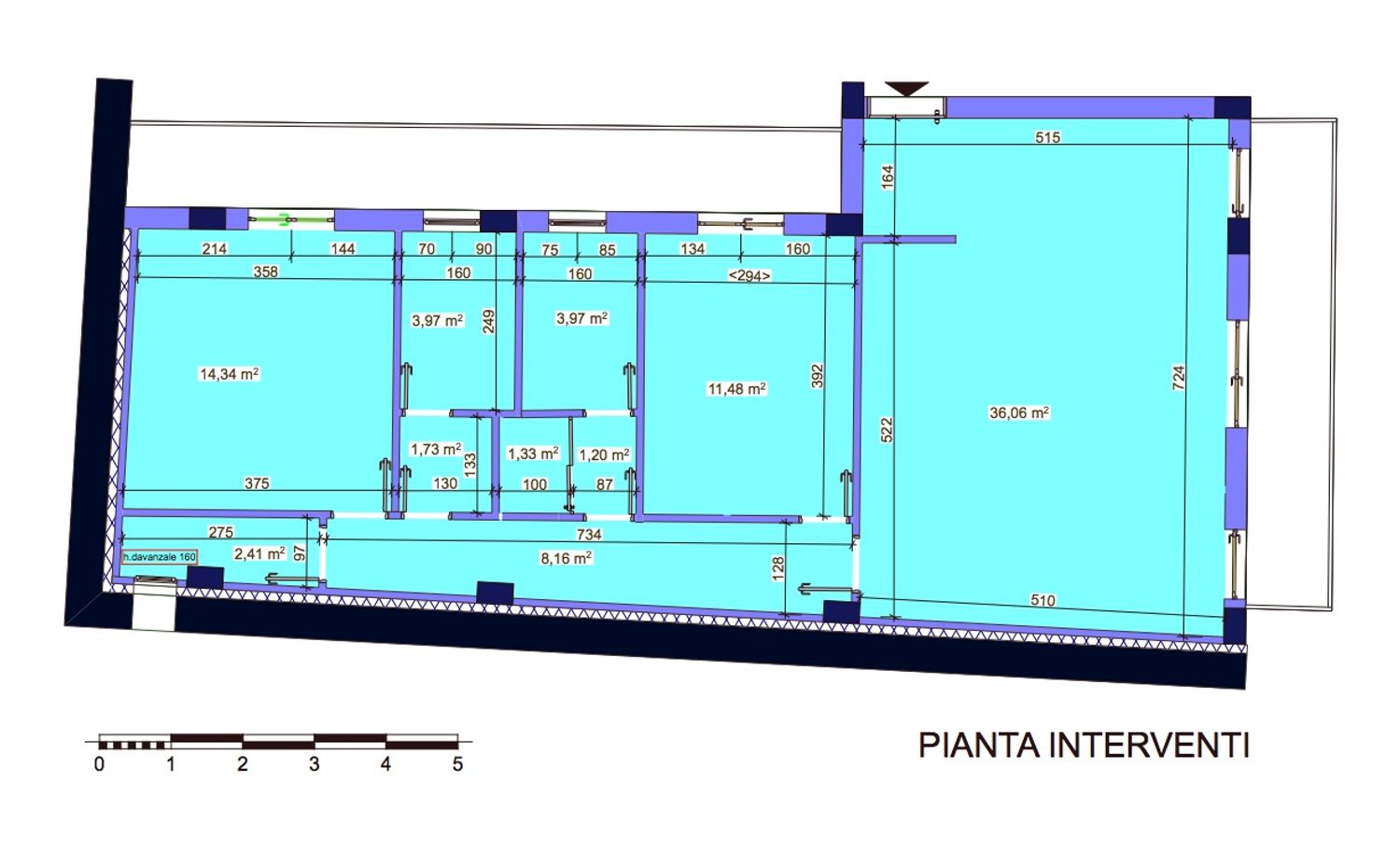 Poiché nel lato cortile le murature e gli impianti non sono ancora stati costruiti si pongono in questa posizione i due bagni, semplificando così la realizzazione dei relativi impianti.