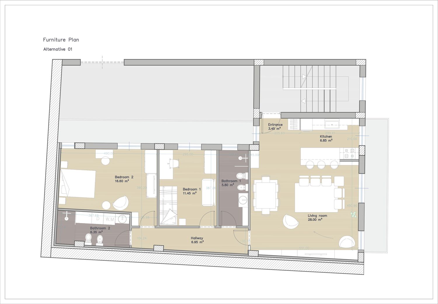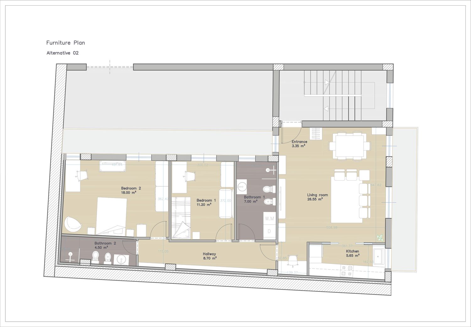 I prepared two design alternatives for you, each placing the kitchen in a different location. The other spaces remain roughly in their original positions, but with new layouts and revised proportions. Choosing between the two depends entirely on your preference.