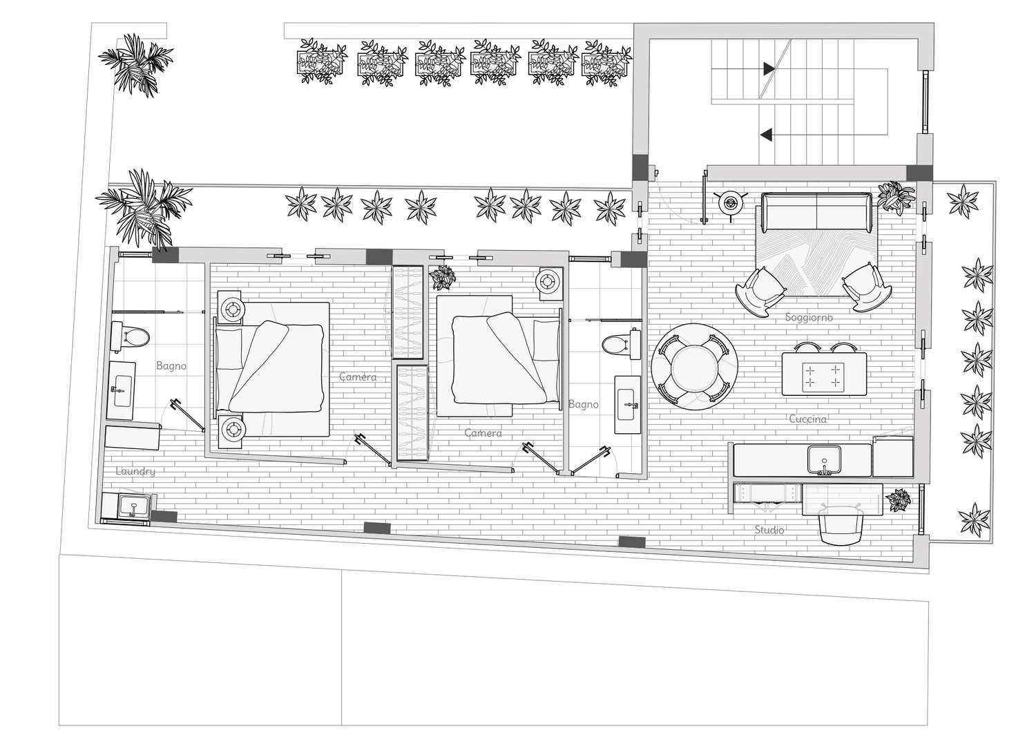 Ă previsto inoltre uno spazio indipendente destinato a studio, delimitato da una parete posta sul retro della cucina, che garantisce la necessaria privacy senza interferire con la dinamica dello spazio sociale.