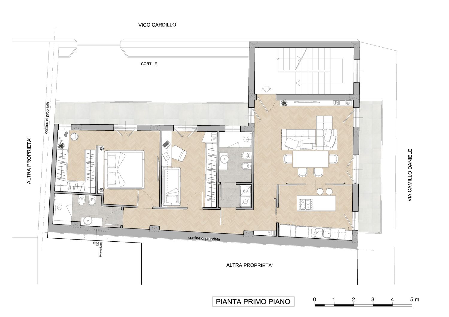 Abbiamo scelto inoltre colori chiari e finiture di gusto naturale (gres effetto legno e pietra) per dare all'ambiente freschezza e luminosità.