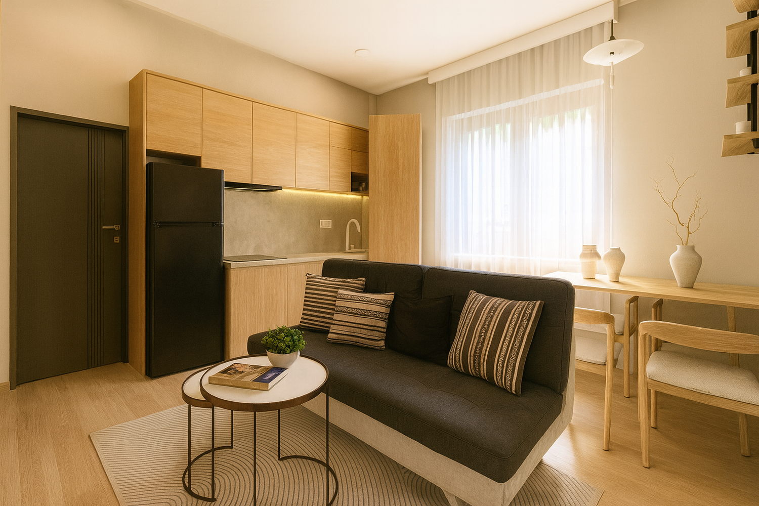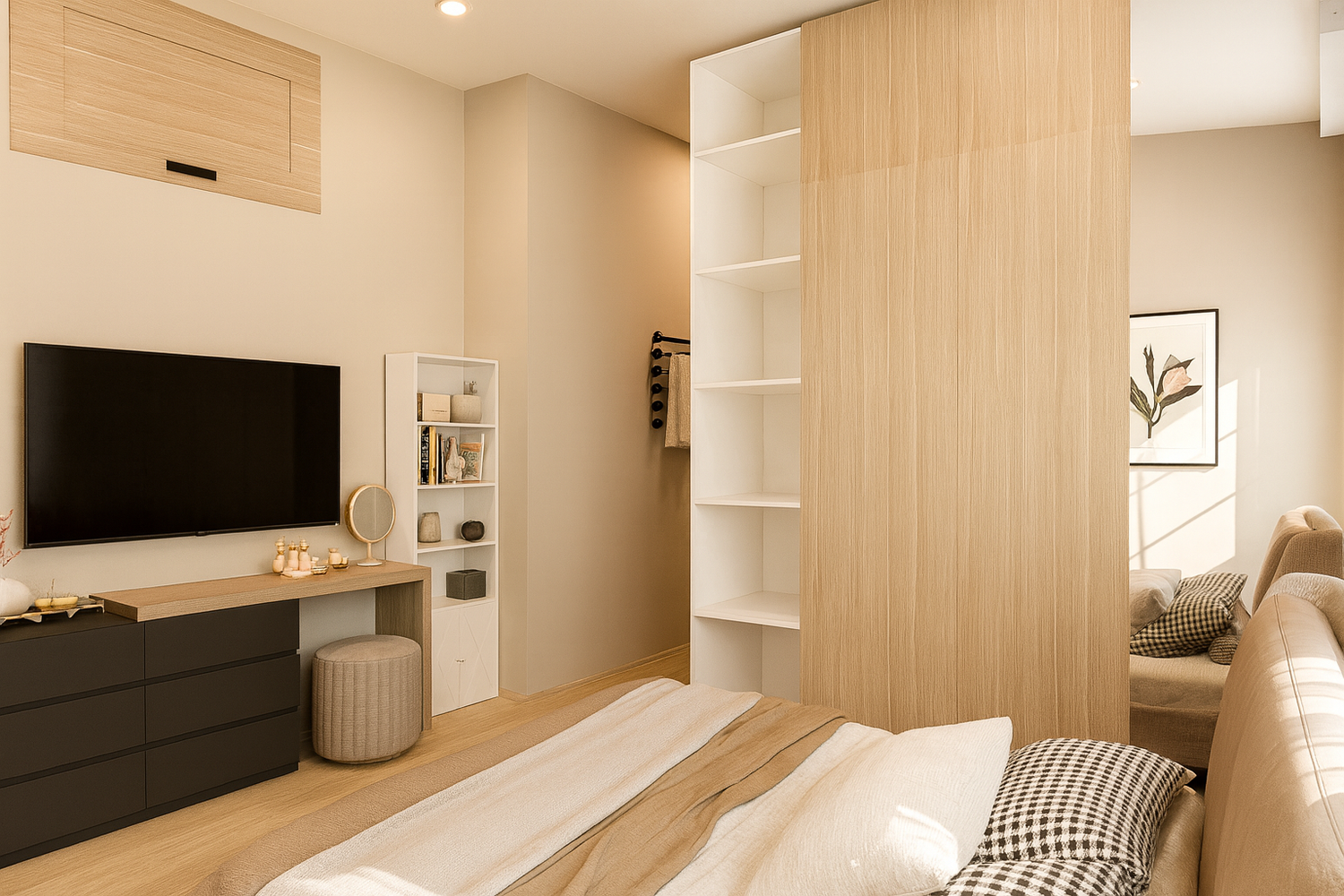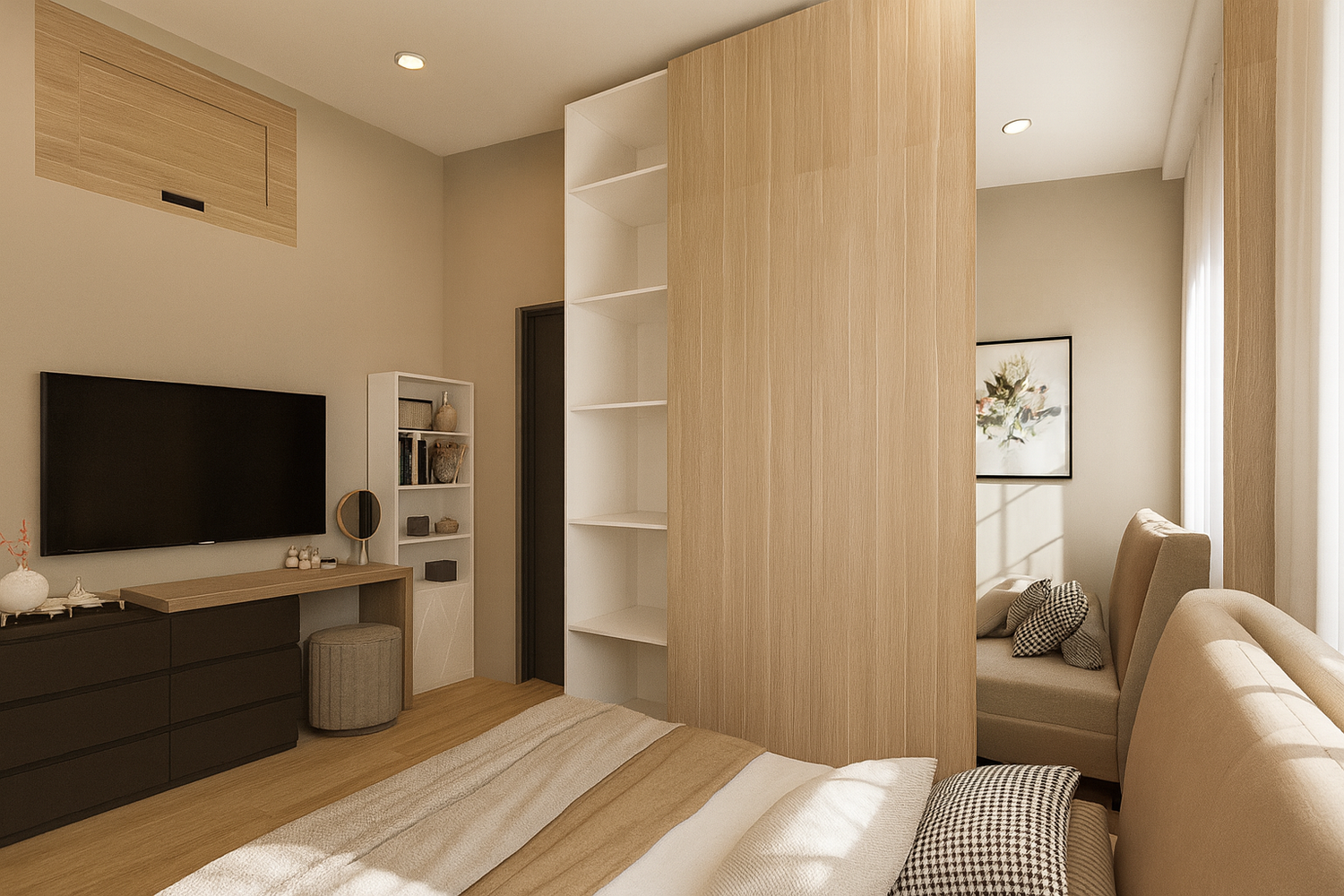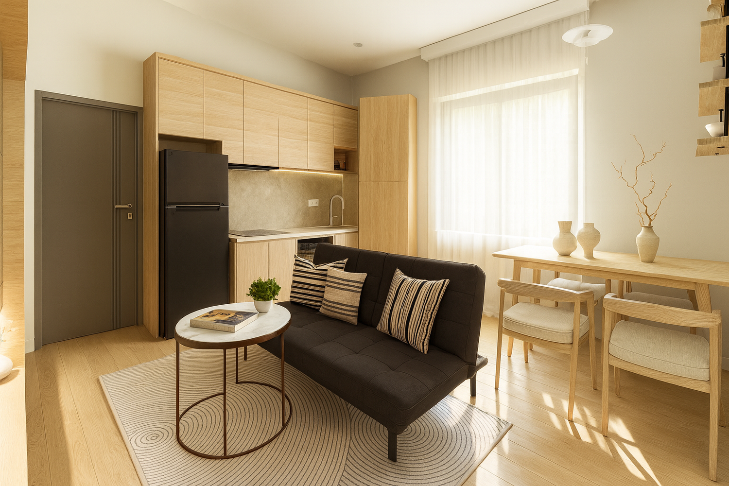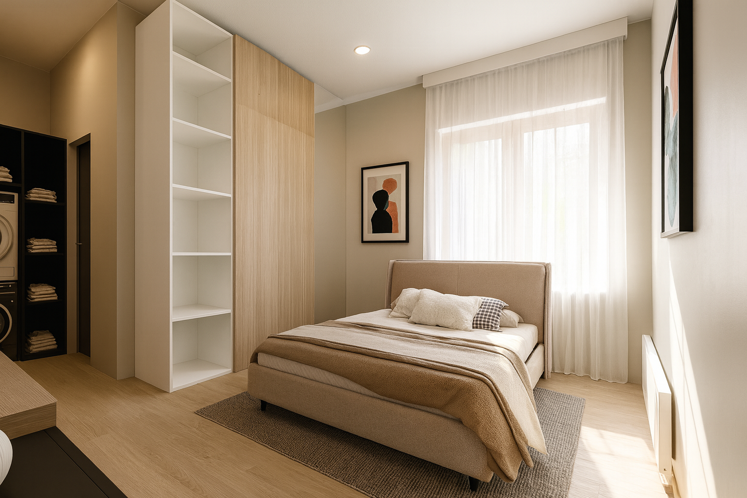 La zona giorno (soggiorno + zona pranzo + cucina) viene ottimizzata con arredi multifunzionali e un’organizzazione più fluida degli spazi.