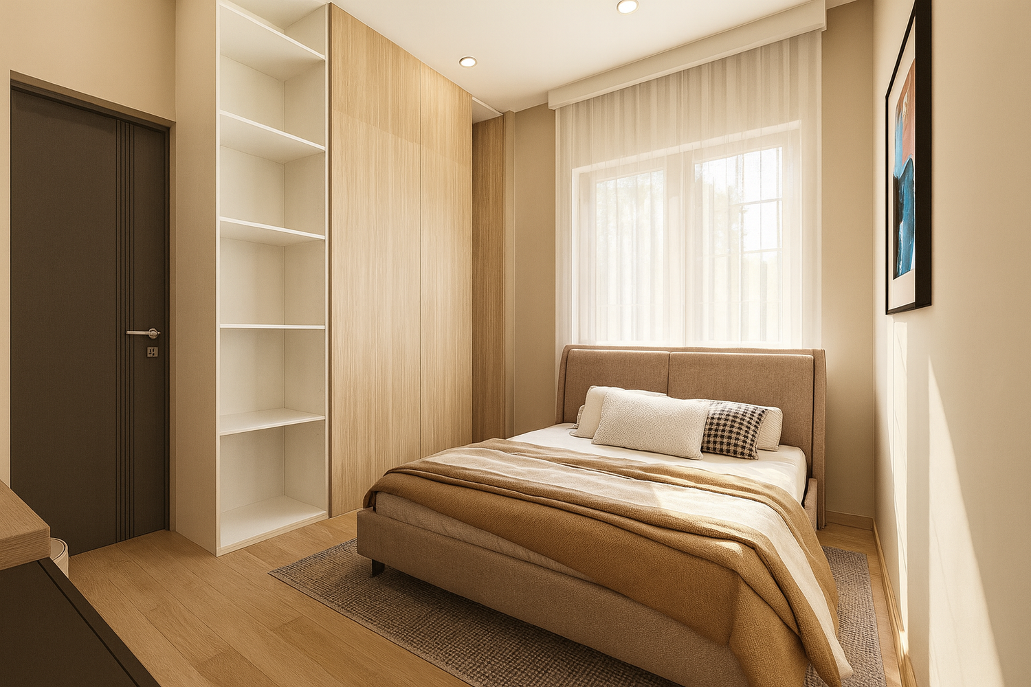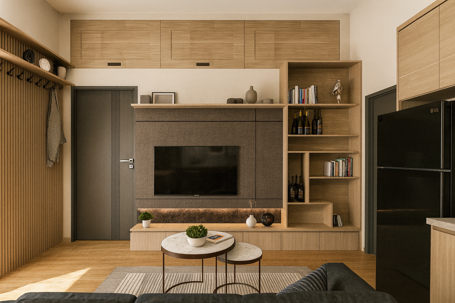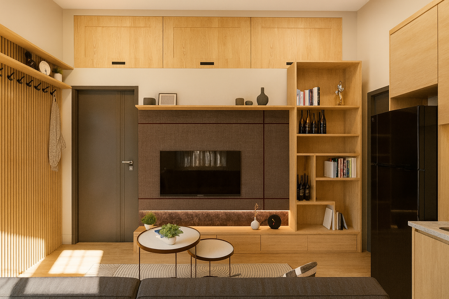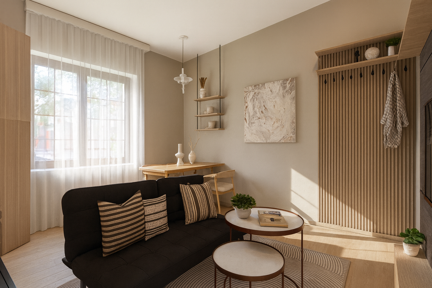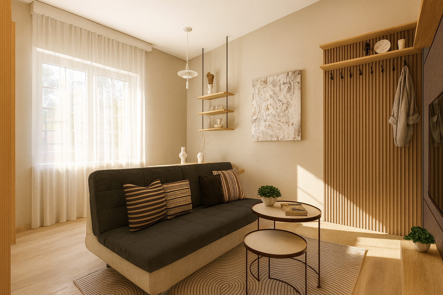 La zona giorno (soggiorno + zona pranzo + cucina) viene ottimizzata con arredi multifunzionali e un’organizzazione più fluida degli spazi.
