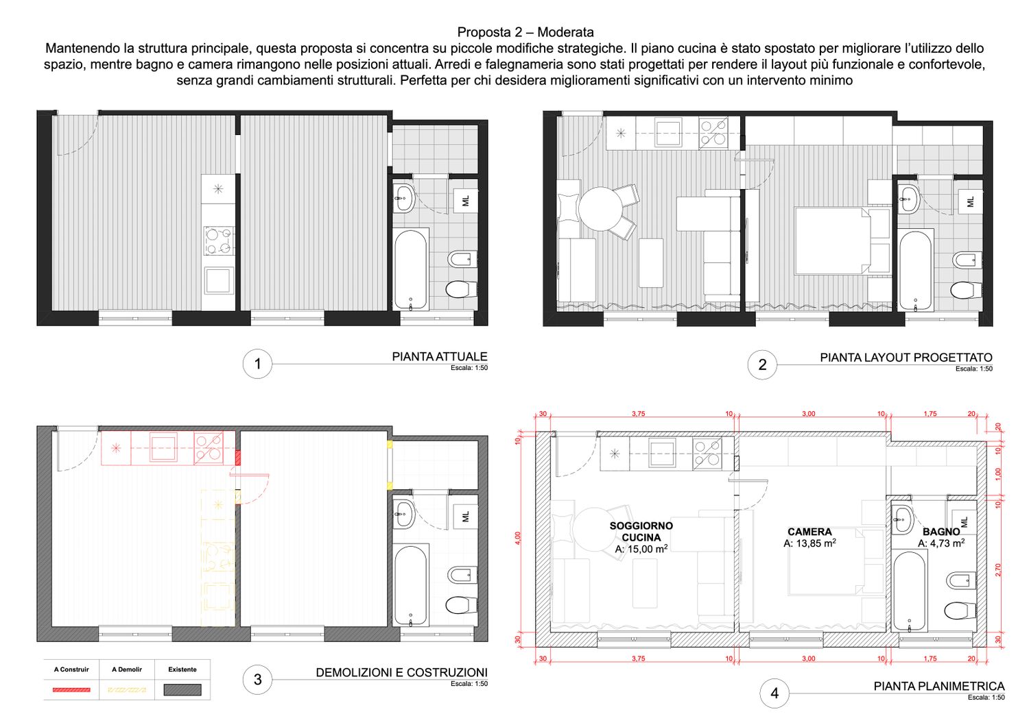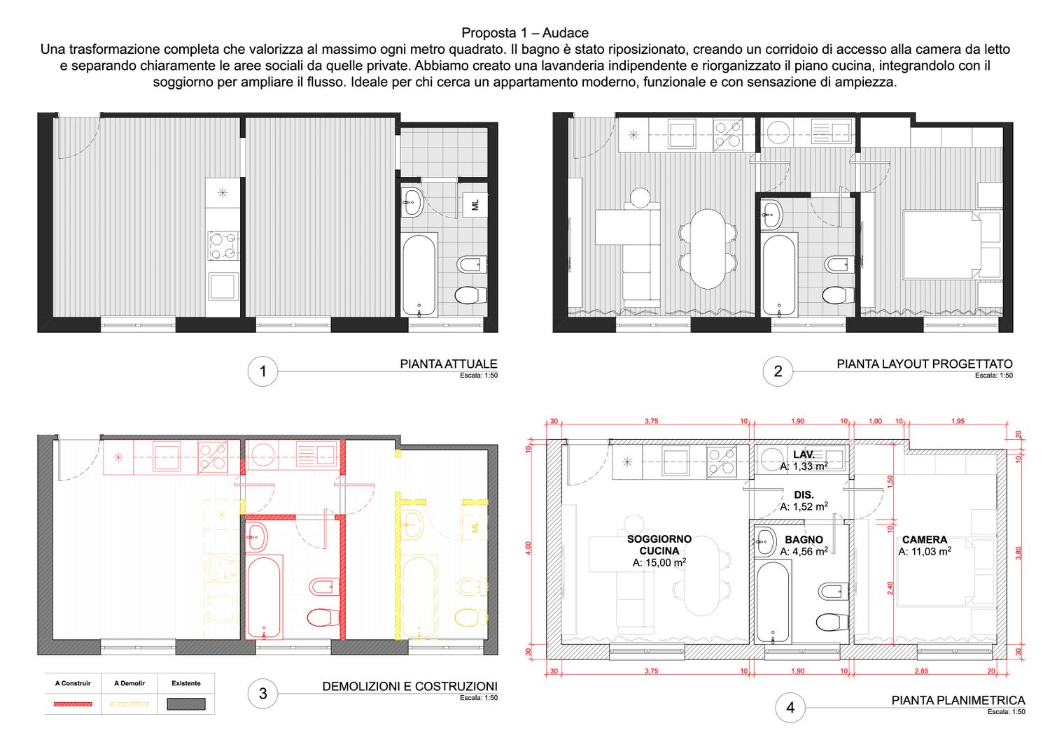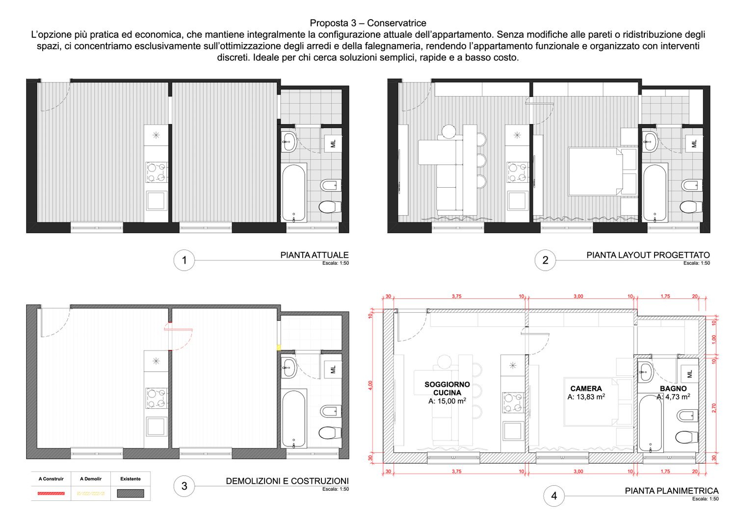 Per l’appartamento, abbiamo sviluppato tre alternative di ristrutturazione, pensando a diversi livelli di intervento e ottimizzazione dello spazio.