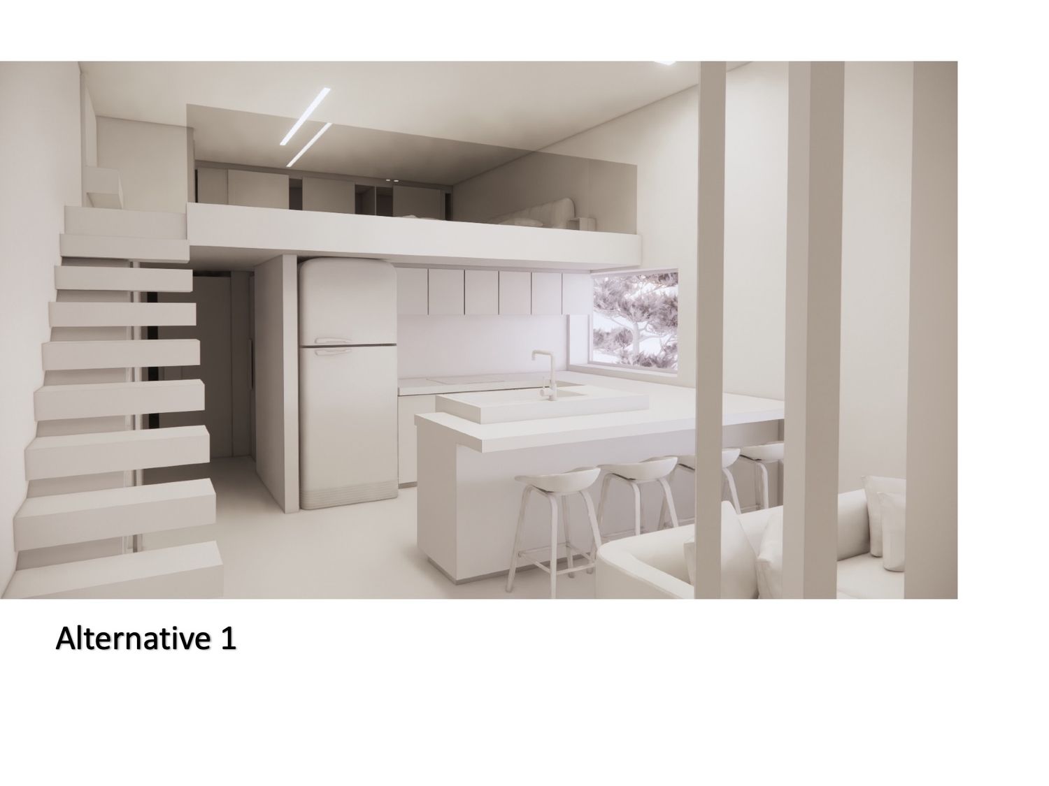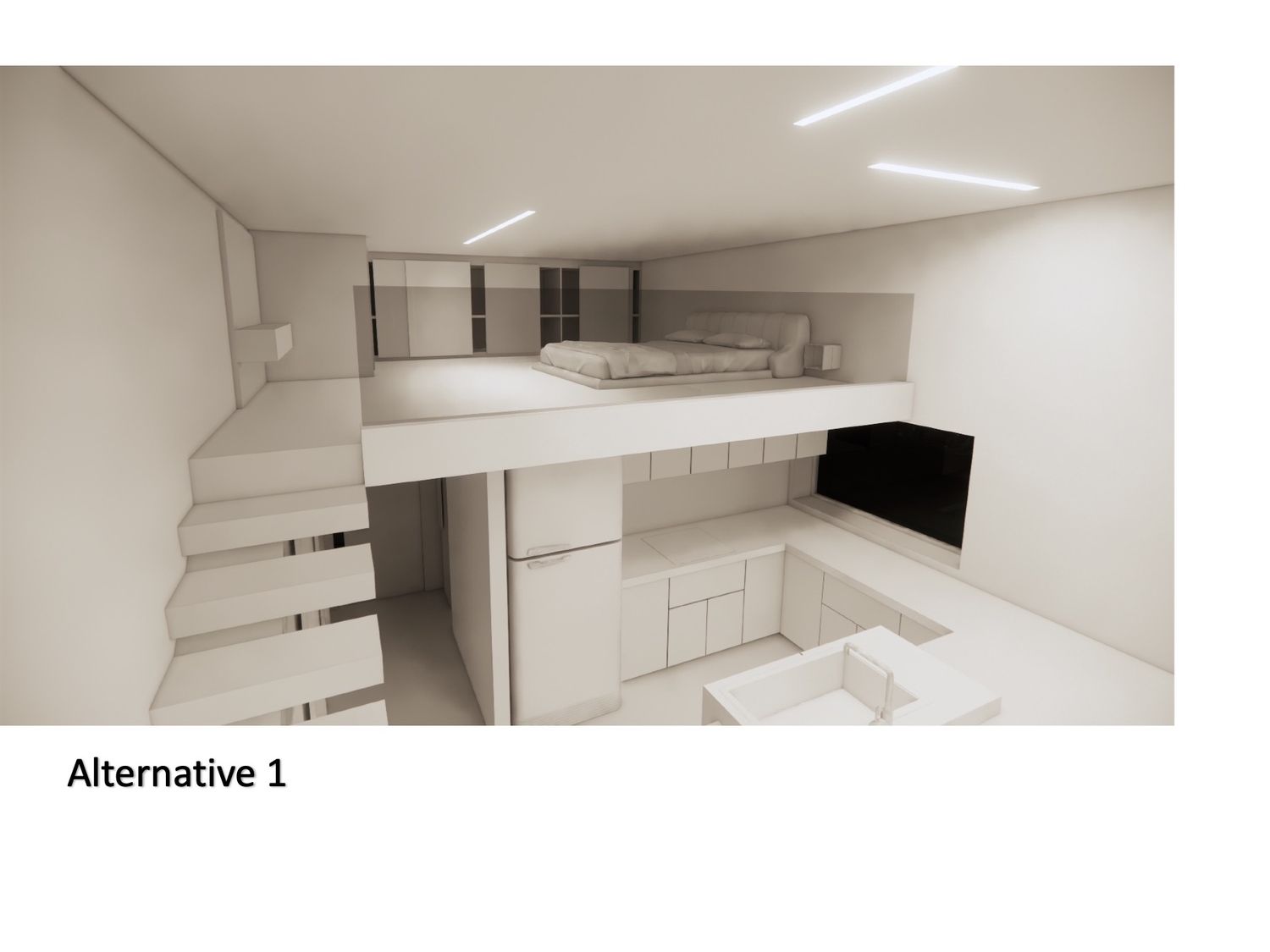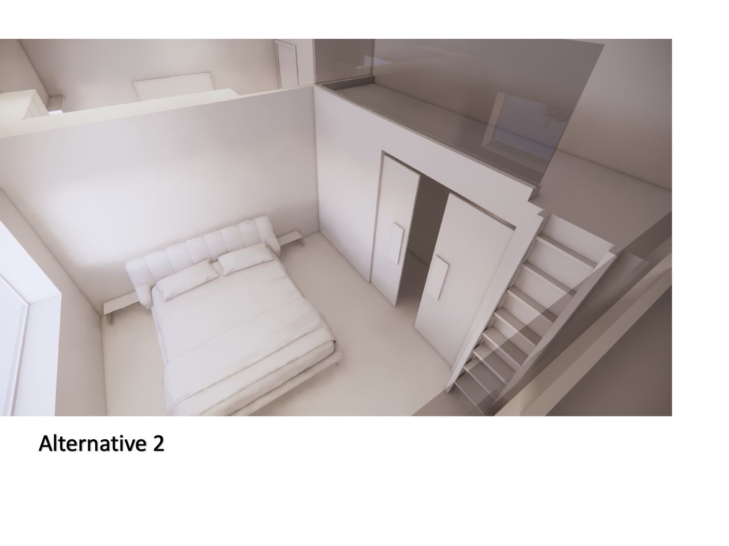 In the second option, to access the upper mezzanine, I added a ladder in the bedroom so you can keep the living area open and spacious.