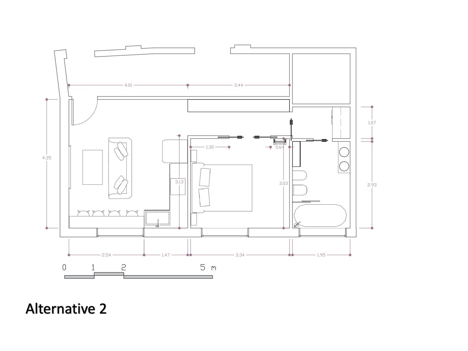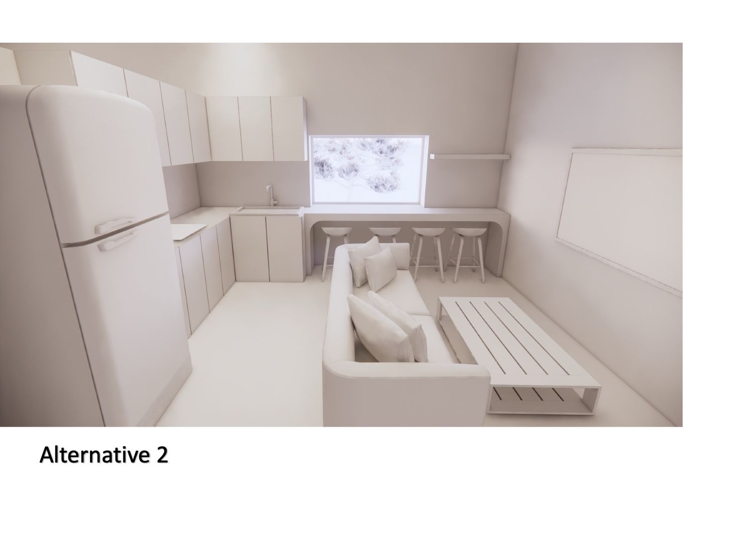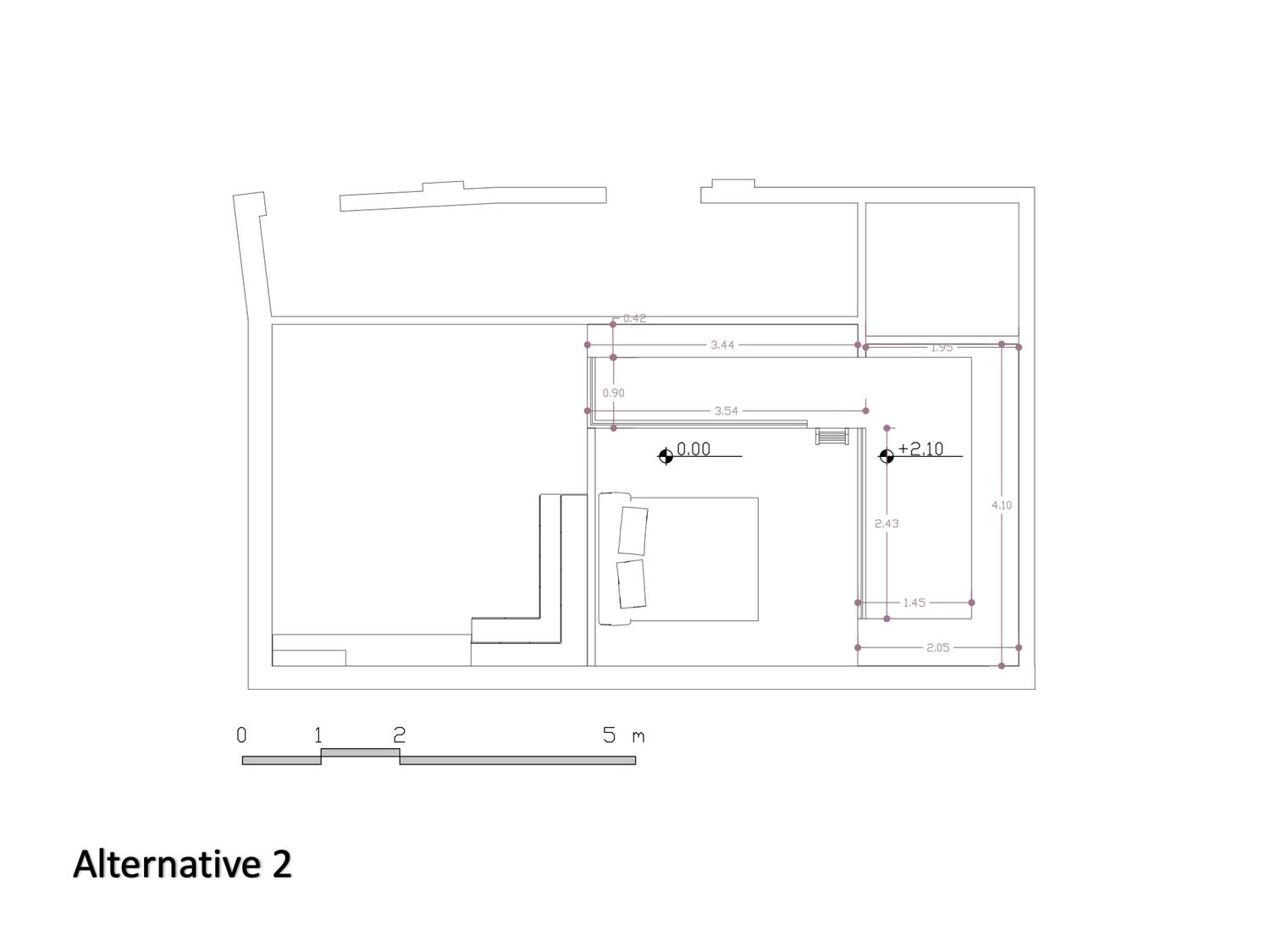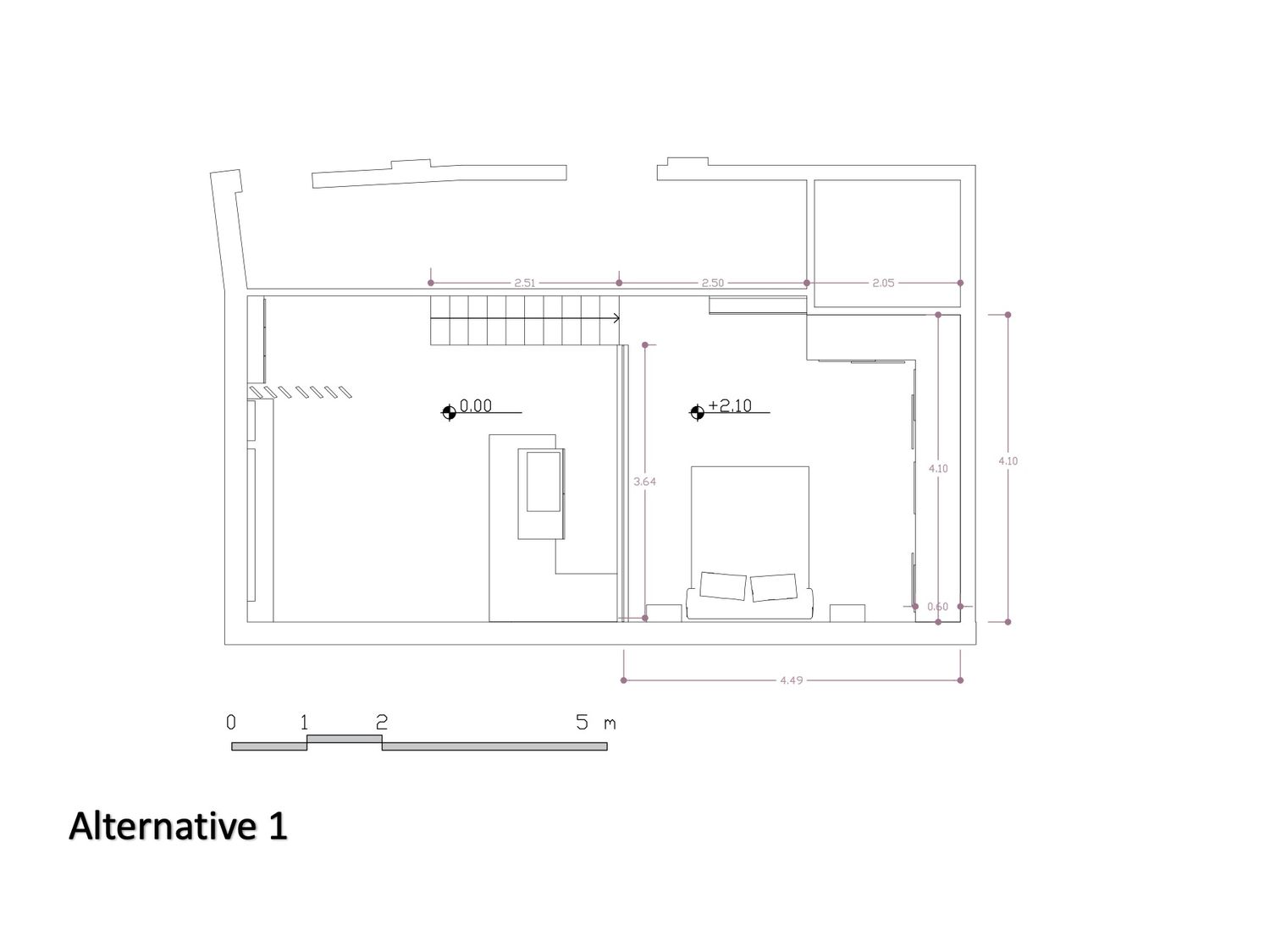 In the second option, to access the upper mezzanine, I added a ladder in the bedroom so you can keep the living area open and spacious.