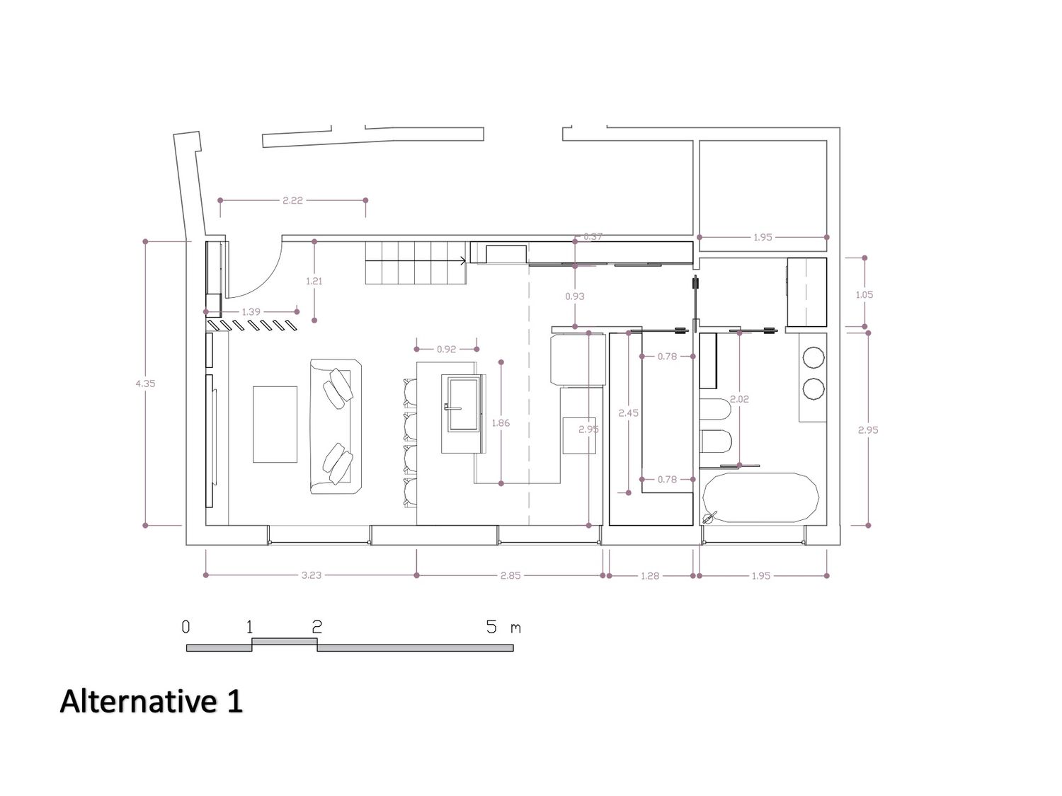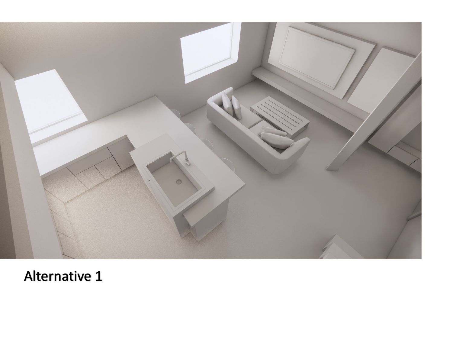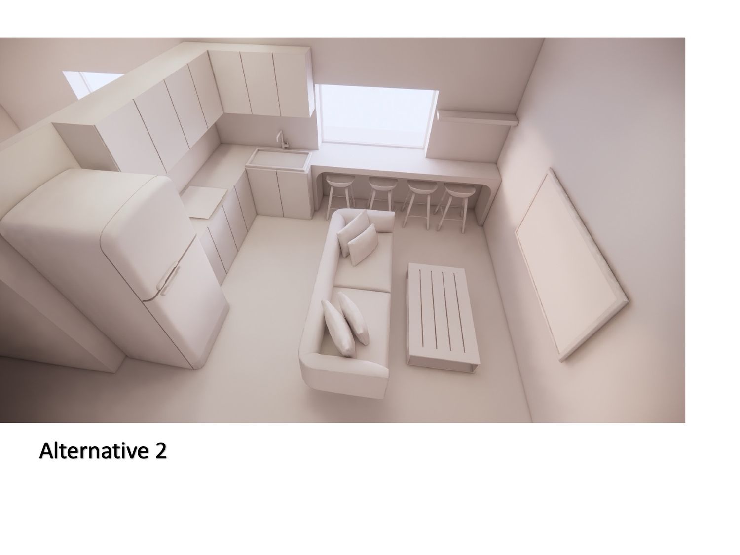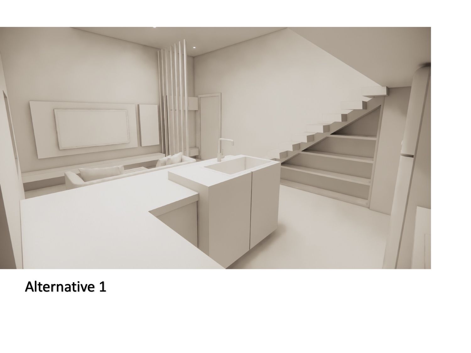 In the first option, I used stairs, placing the kitchen and island on the lower level — this layout fully meets the design standards.