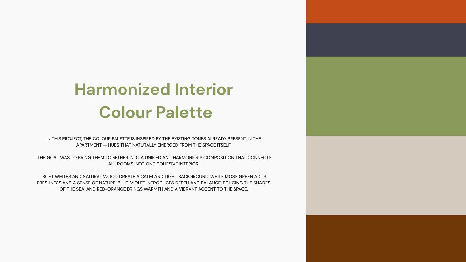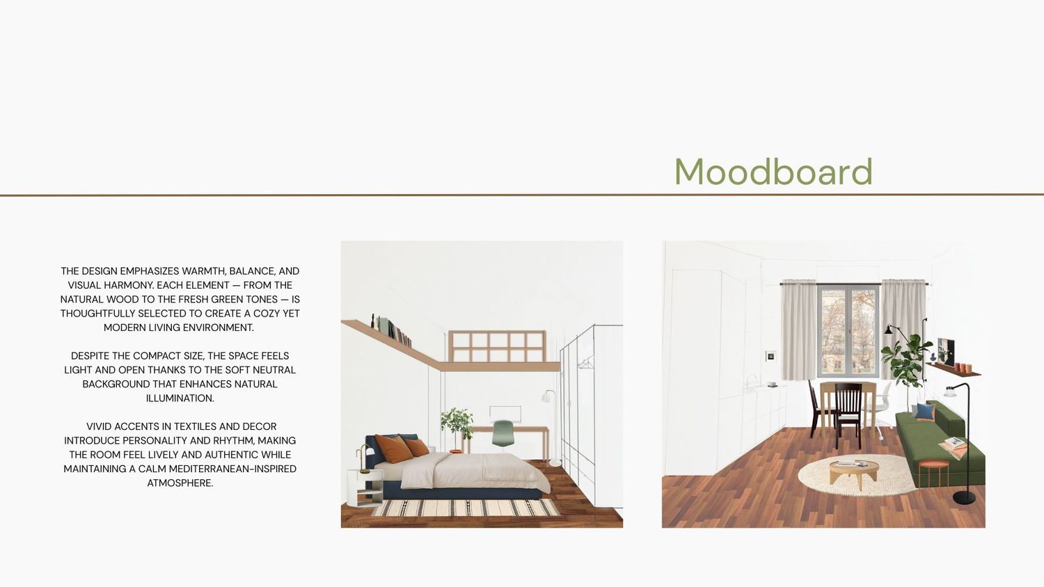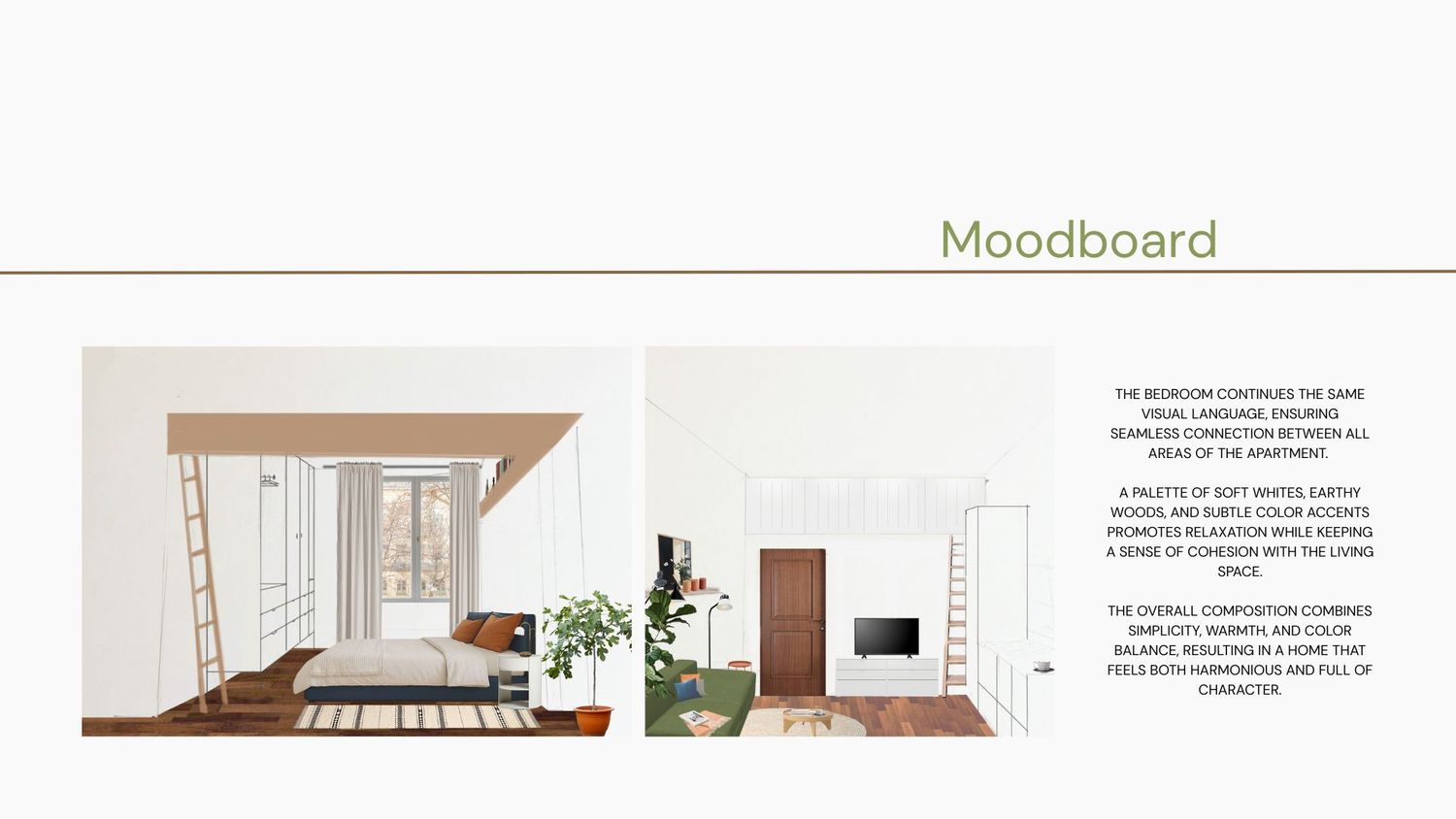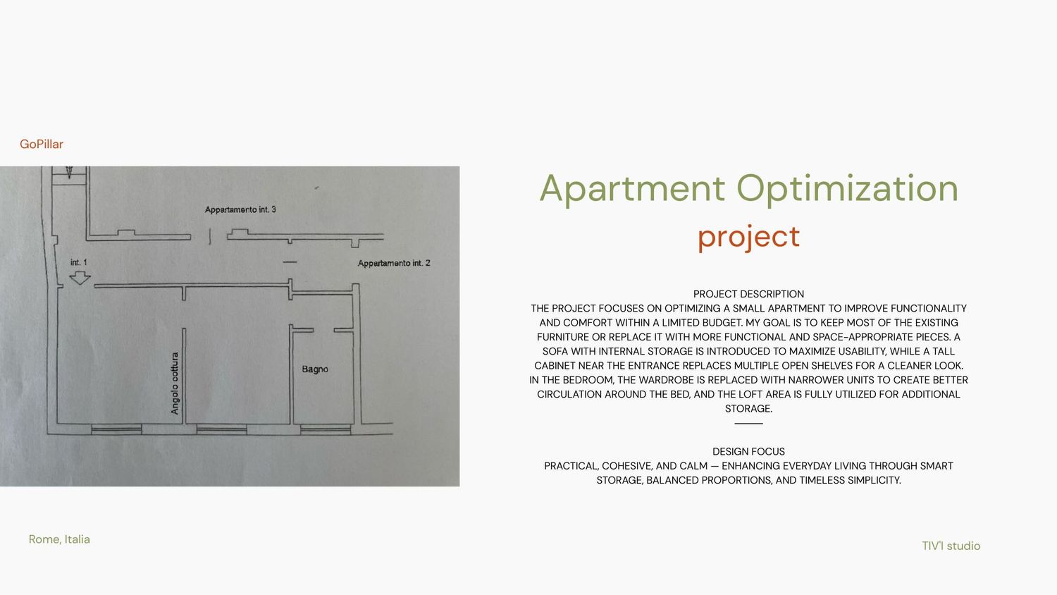 A compact apartment redesign focused on functionality, light, and harmony. The project enhances everyday comfort by reusing existing furniture, optimizing storage, and connecting spaces through a cohesive color palette of warm neutrals and natural tones. The result is a calm, modern, and inviting home that feels both practical and timeless.