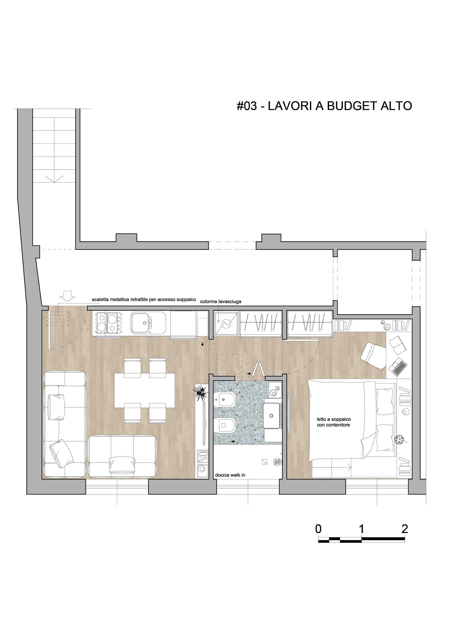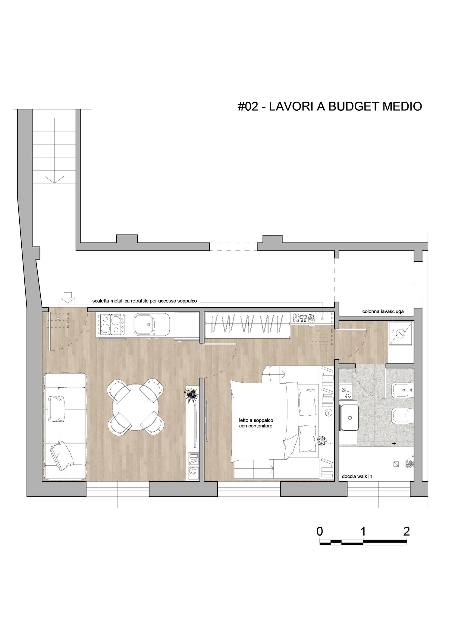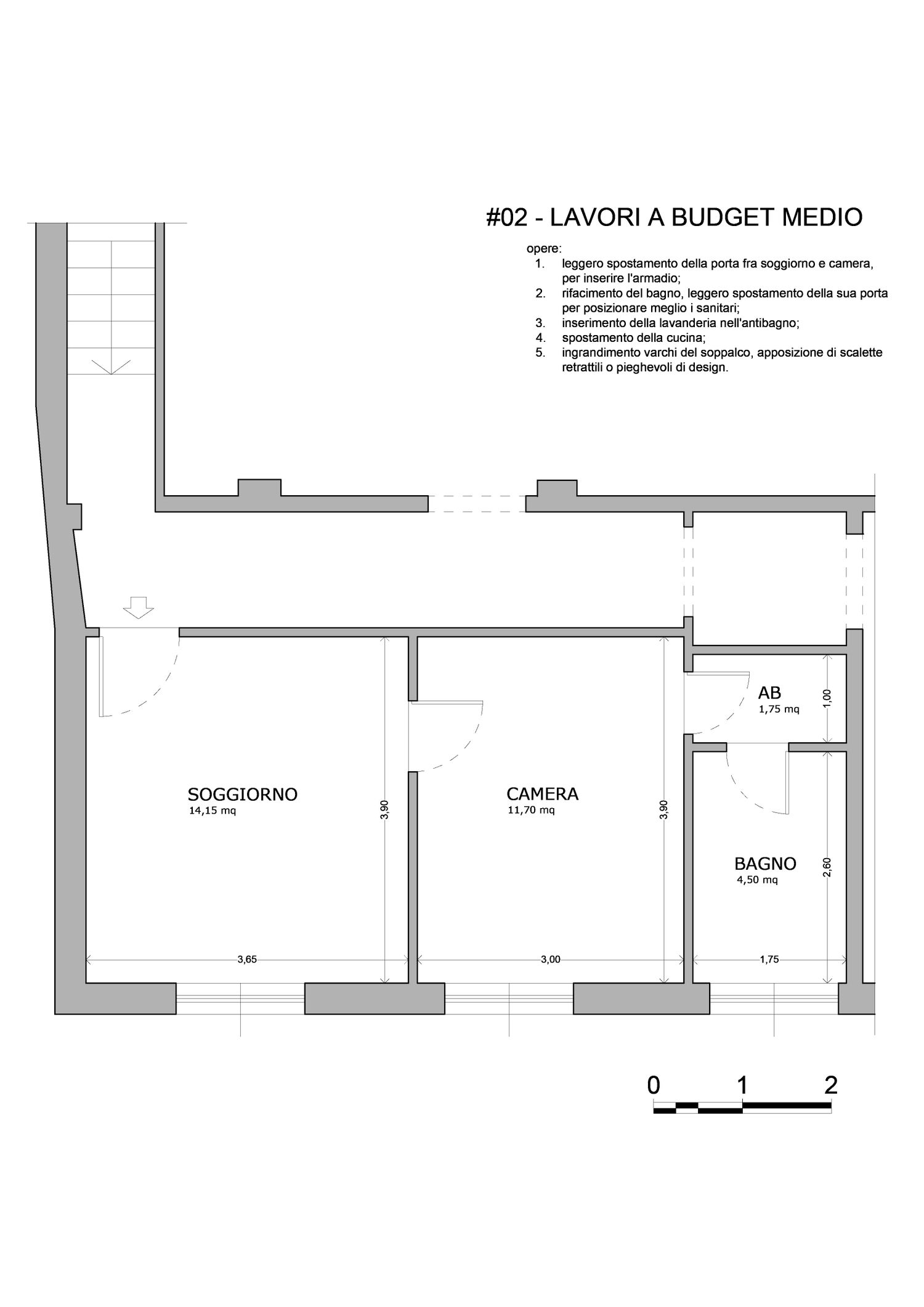 Abbiamo formulato tre proposte progettuali, pensate rispettivamente in previsione di una ristrutturazione con budget limitato, medio o più alto, con diverse tipologie di opere.