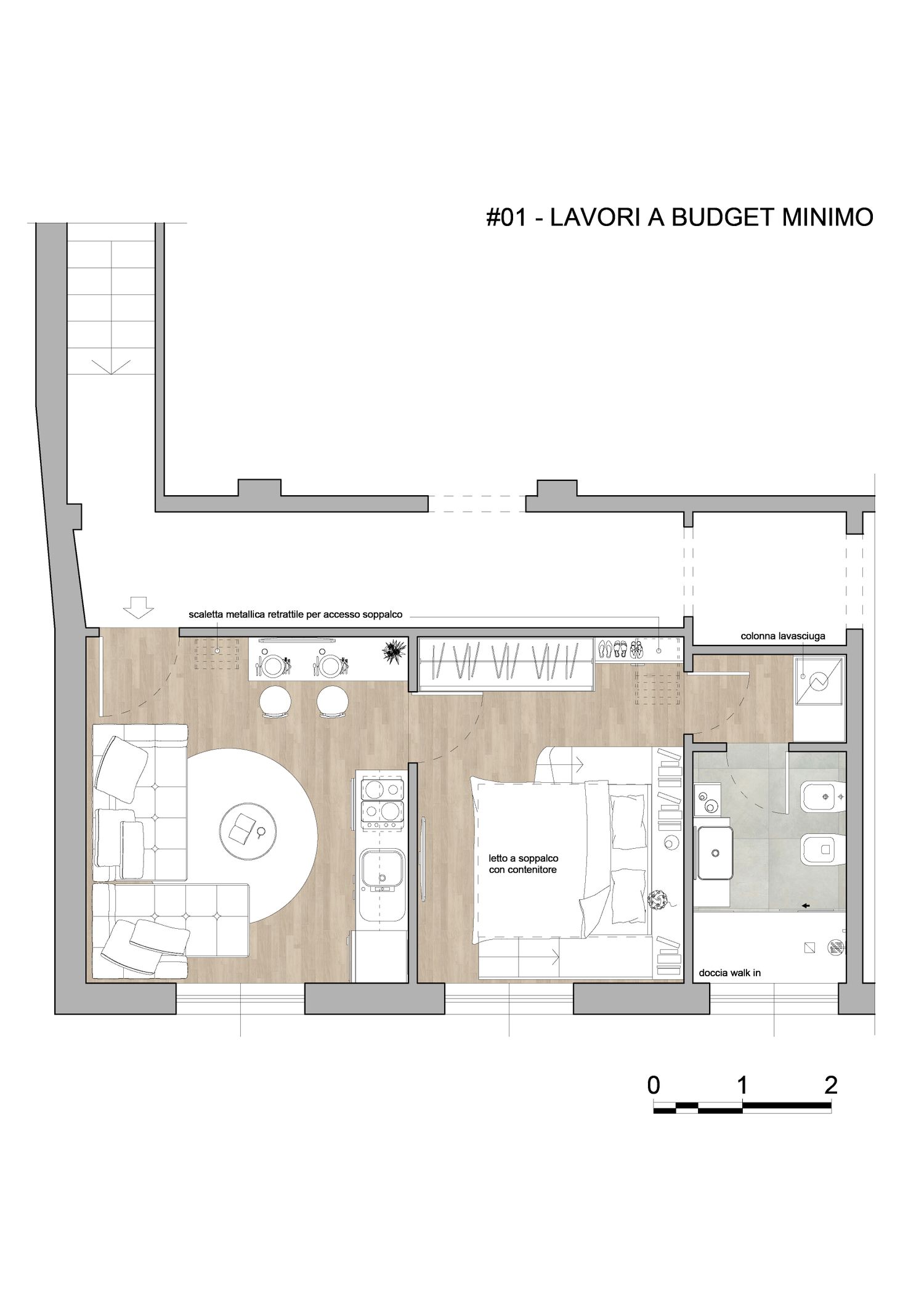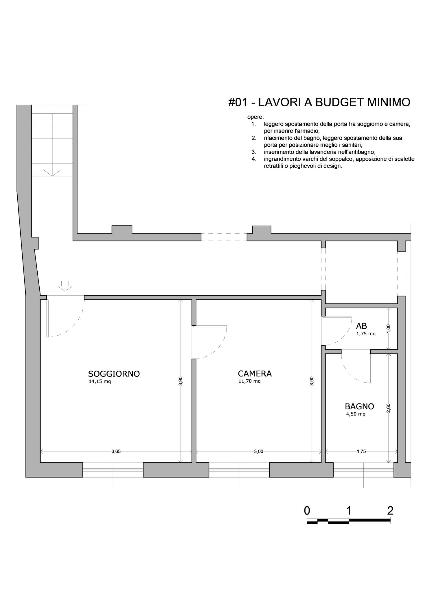 PROPOSTA 1 - lavori con l'uso di un budget basso/limitato, che prevede le opere minime necessarie per garantire la fruibilità richiesta degli spazi dell'appartamento: