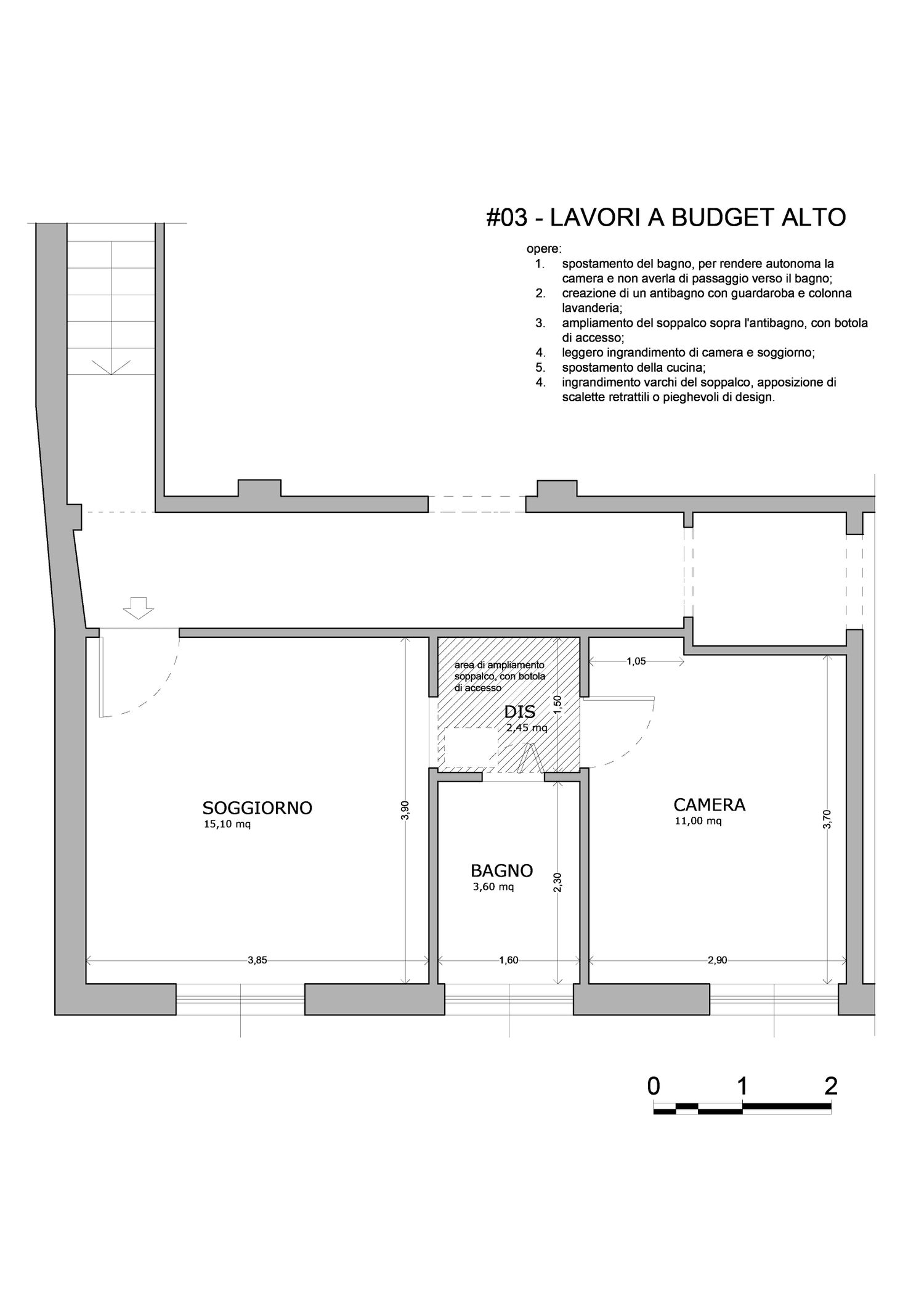 PROPOSTA 3 - lavori più radicali, con un uso di budget più alto e modifiche consistenti all'assetto distributivo dell'appartamento. In questo caso, le posizioni di bagno e camera verranno invertire, in modo da evitare il passaggio attraverso la camera per raggiungere il bagno. Inoltre, le opere prevedono: