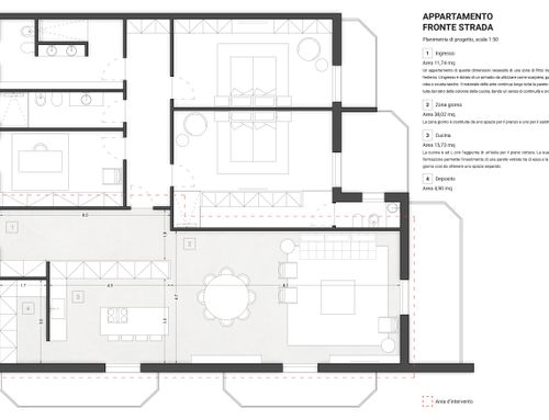 N.B.  L'aria interessata è quella che in foto planimetria è tratteggiata ovvero la zona giorno. Si può notare che allo stato attuale non sono presente le tramezzature da planimetria.