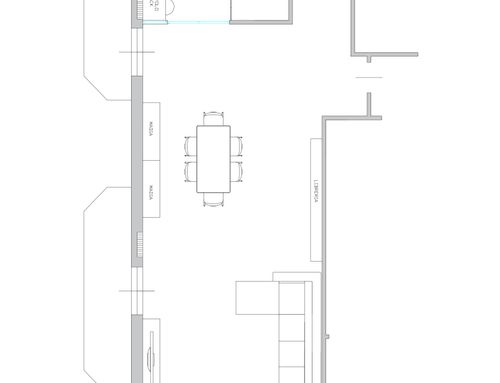 Dado el tamaño, no sé si sería conveniente dividir la zona de la cocina del salón y quizás destinar un espacio de despensa para la cocina, o crear otra estancia.
