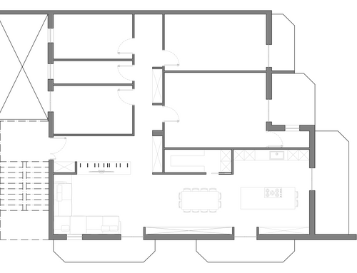 From the sleeping area you can draw from an arched entrance, which could be eliminated by giving light to a load-bearing beam. (visible knife-edge beam)