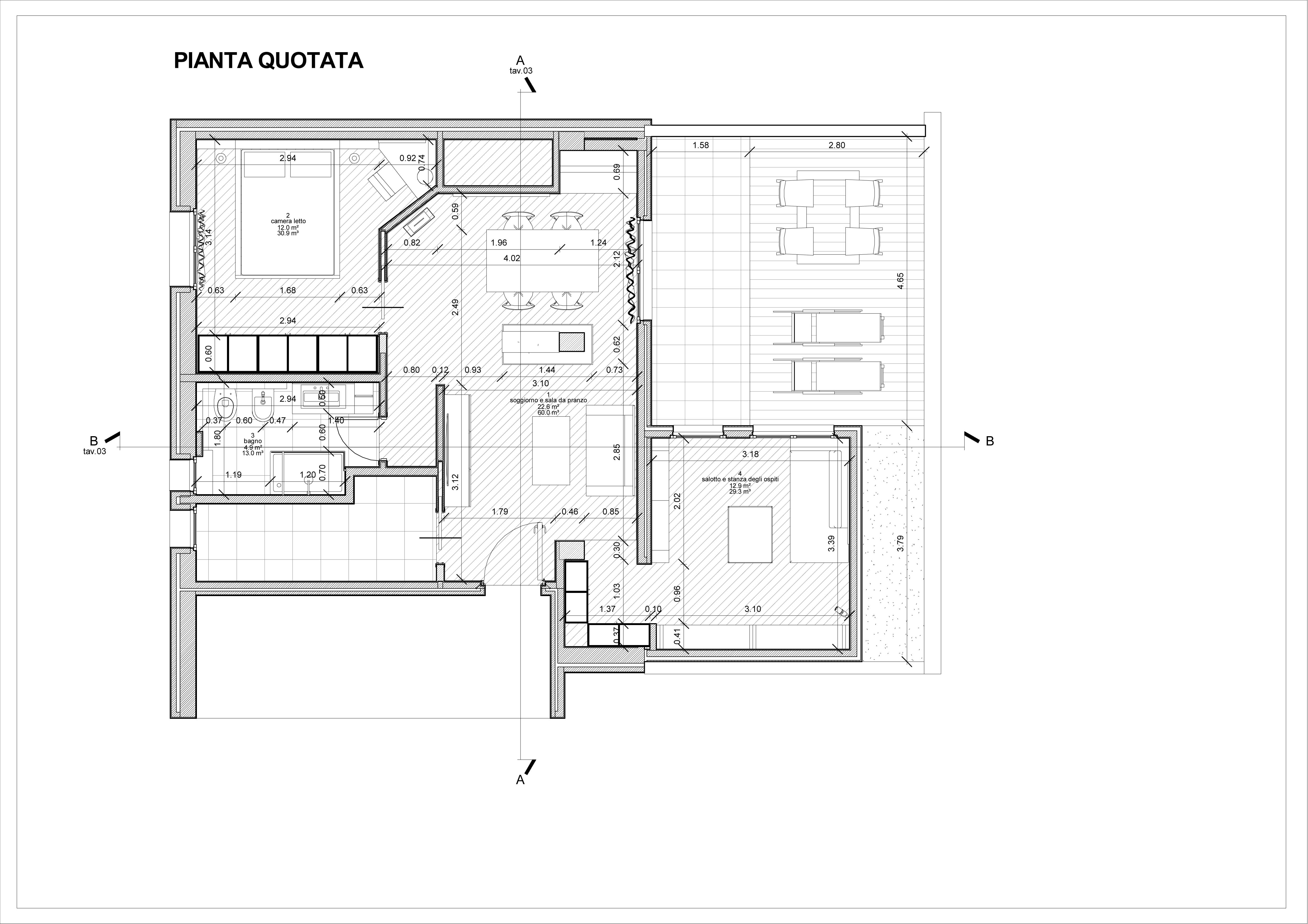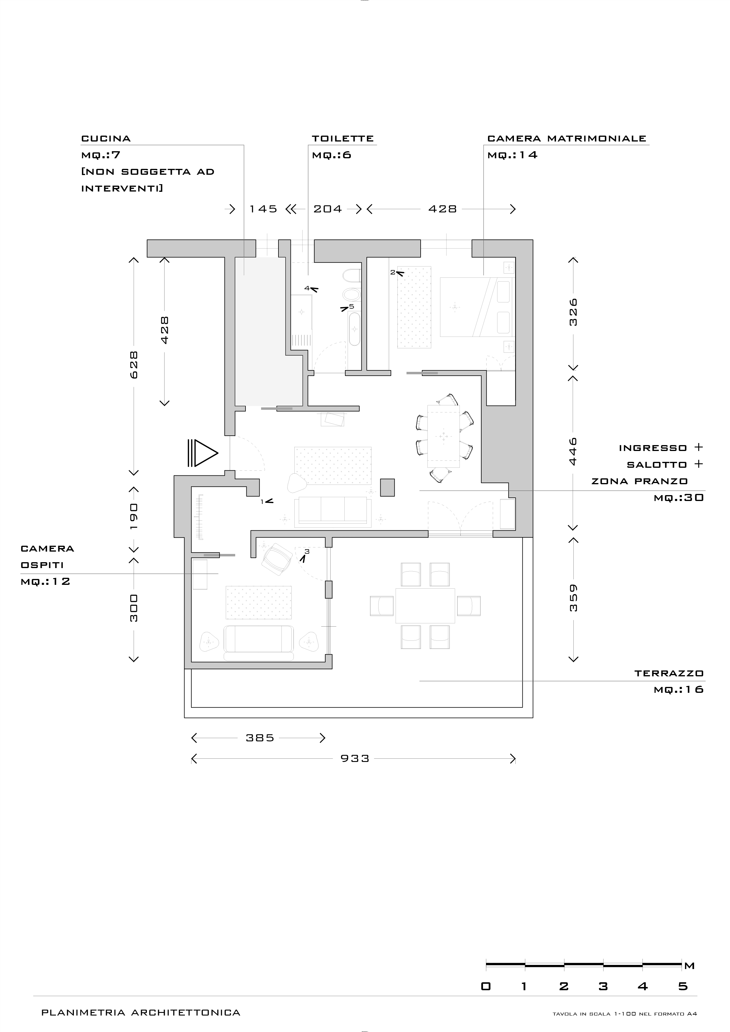 Deve ospitare un divano , una televisione ed un tavolo che possa accogliere fino a 8 persone sedute.