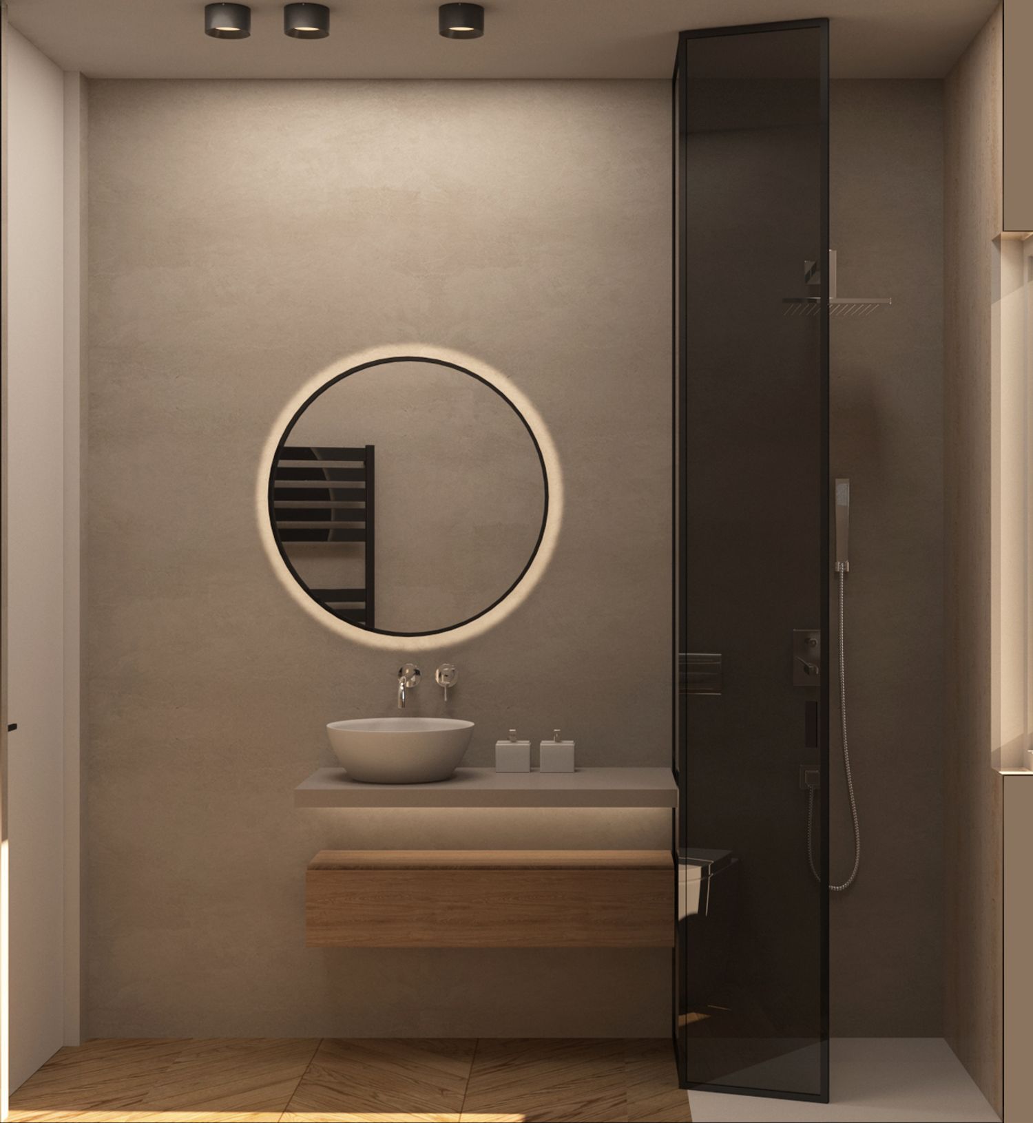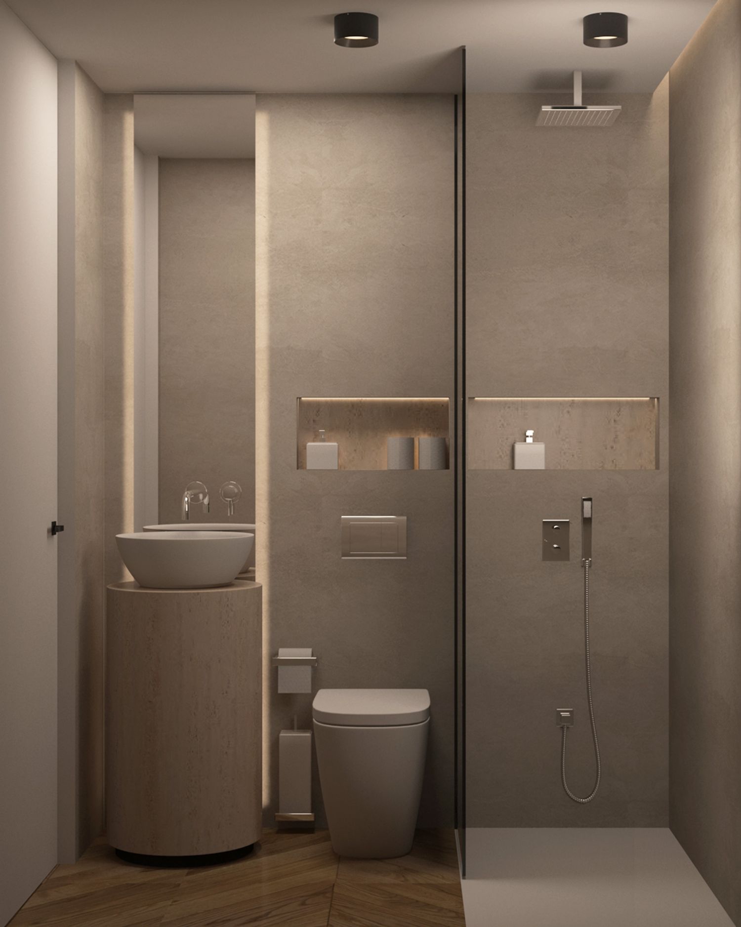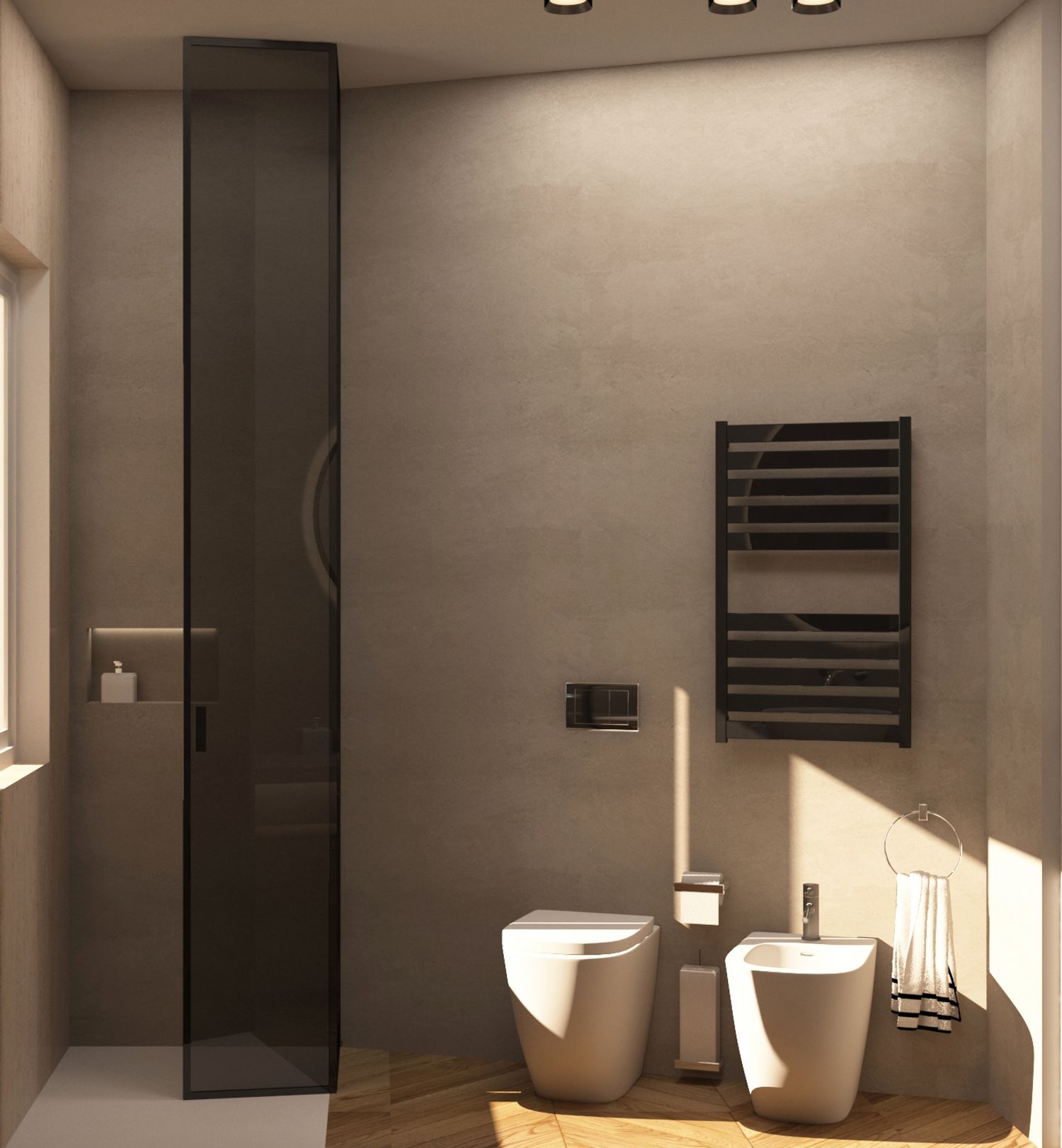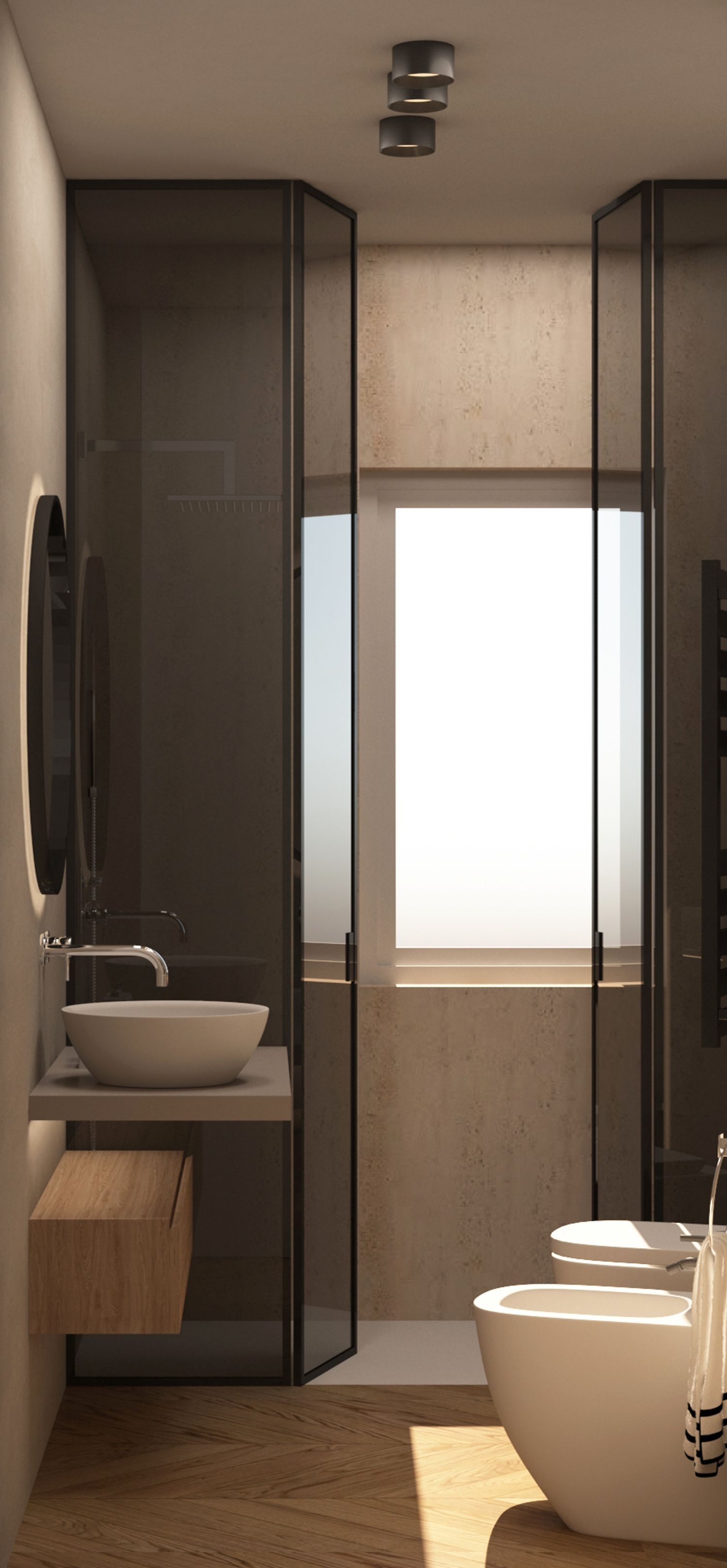 Ho ridotto le dimensioni del bagno di servizio, a cui si può accedere mediante una porta rasomuro, e vi ho inserito il piatto doccia a filo col pavimento con la parete principale rivestita da travertino e nicchia illuminata da led mentre per il rivestimento di tutto l'ambiente ho adottato una pittura effetto resina, come da Lei richiesto.