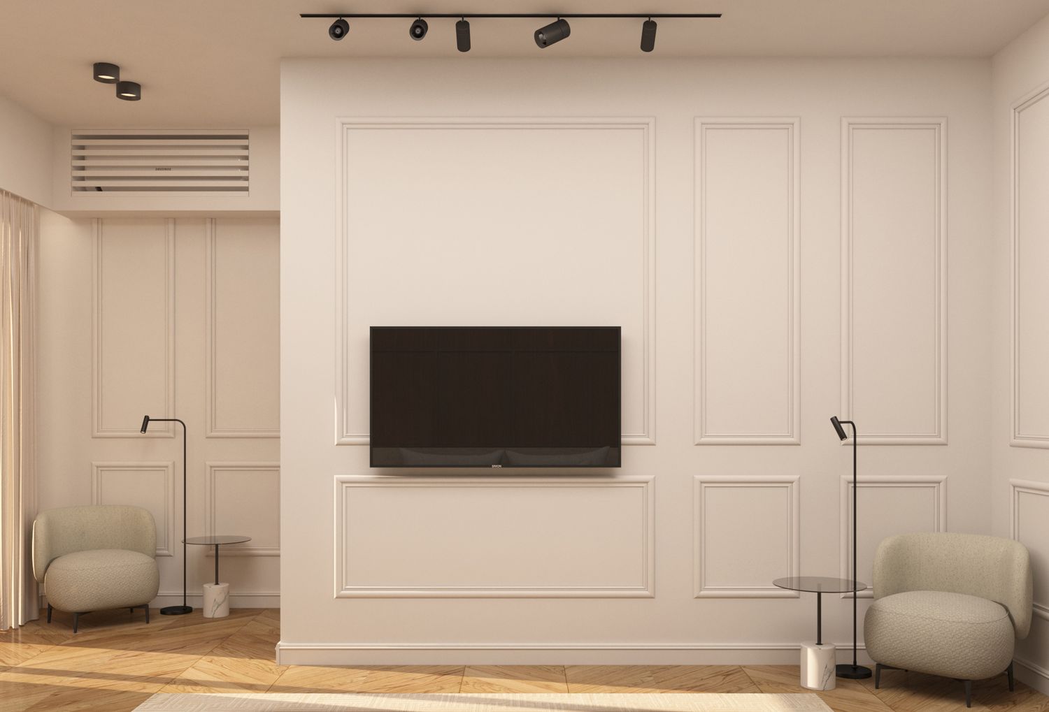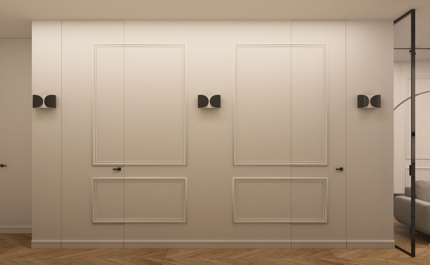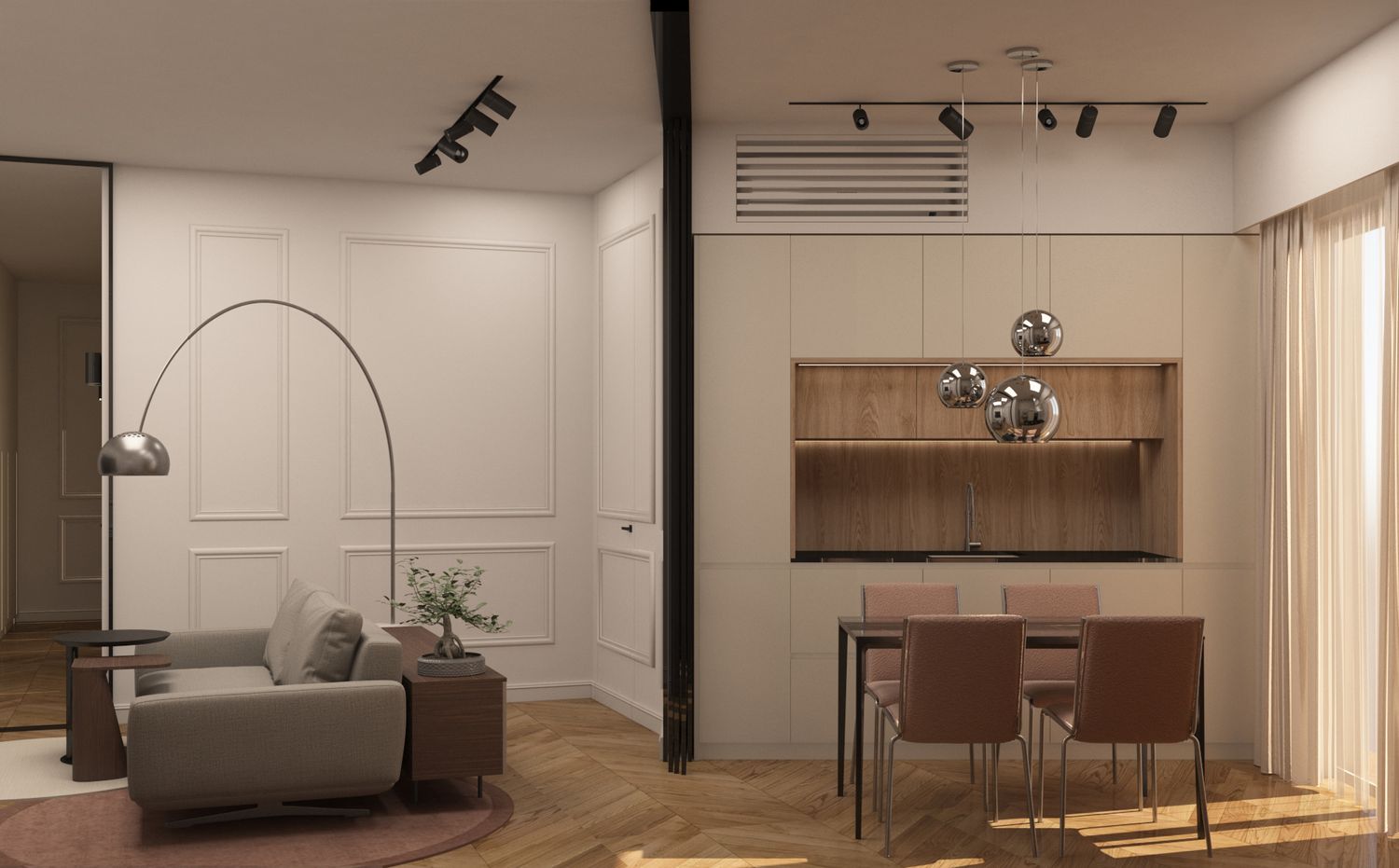 Come primo step ho realizzato gli scorrevoli vetrati per dividere soggiorno e cucina, ma all'occorrenza avere un unico ambiente. Per la cucina ho disposto una serie di colonne con frigorifero all'americana a libera istallazione nella nicchia a destra, mentre sulla parete di fronte ho lasciato la zona lavaggio per mantenere la posizione degli impianti, ma rivisitata inserendola tra due colonne, pensili e sovrapensili, ottenendo l'effetto cornice che richiedeva. Ho posizionato, poi, la penisola di fronte le colonne a destra (purtroppo lo spazio a disposizione non consentiva l'aggiunta dello snack) ed ho inserito un tavolo allungabile in continuità visiva con il living. Il soggiorno, infatti, funge da ingresso alla casa, arredato con ampio divano e tavolini. Le pareti sono state, poi, impreziosite dalla boiserie secondo i riferimenti che ci ha fornito ed ho inserito il condizionatore in cucina, quest'ultimo celato dal cartongesso (il quale fa anche da elemento di chiusura delle colonne per una maggiore pulizia visiva e linearità), con la possibilità di collegarlo all'unità esterna che sarà posta sul balcone facendo correre i tubi al suo interno ed inserendo anche una veletta illuminata in cui alloggiare la tenda.