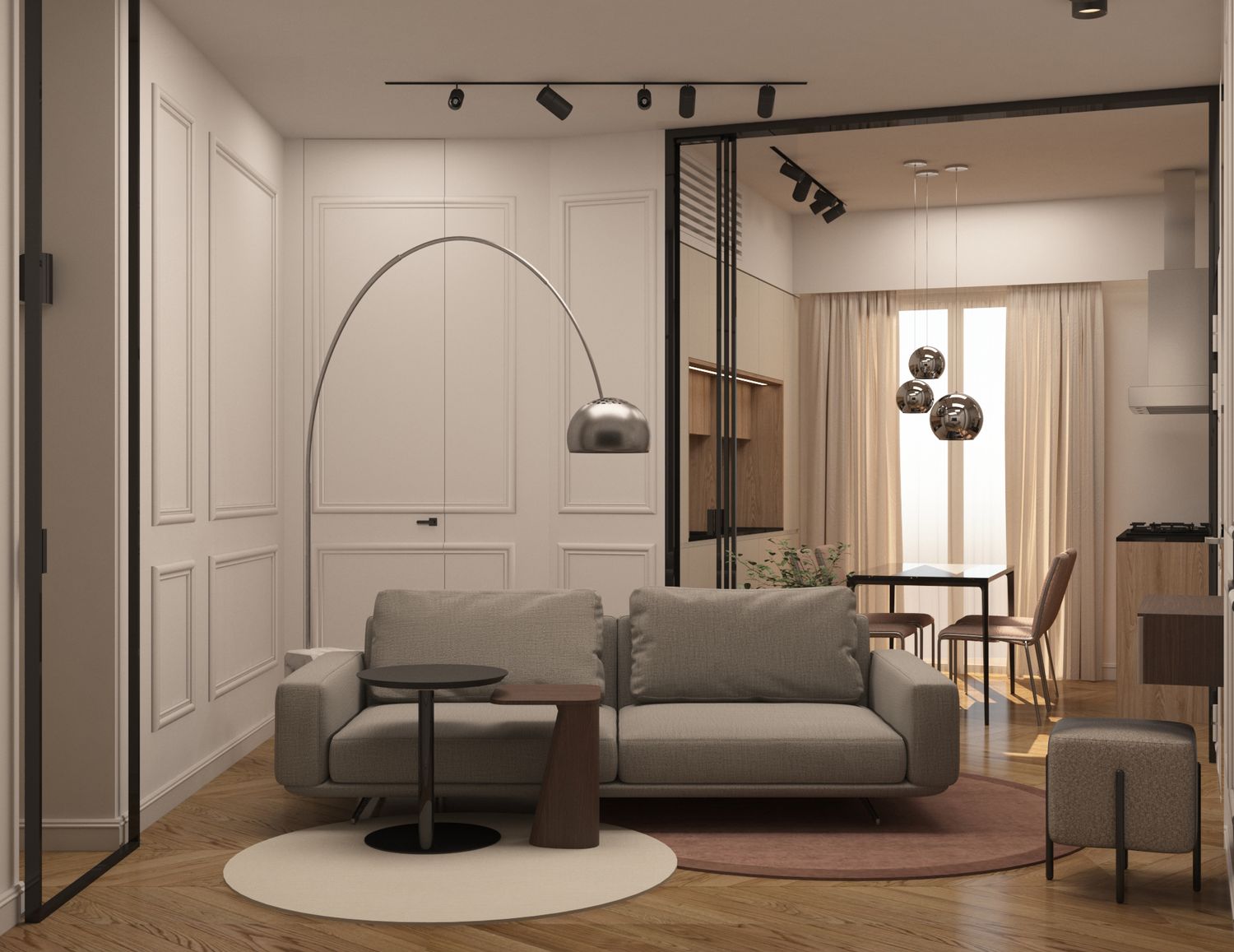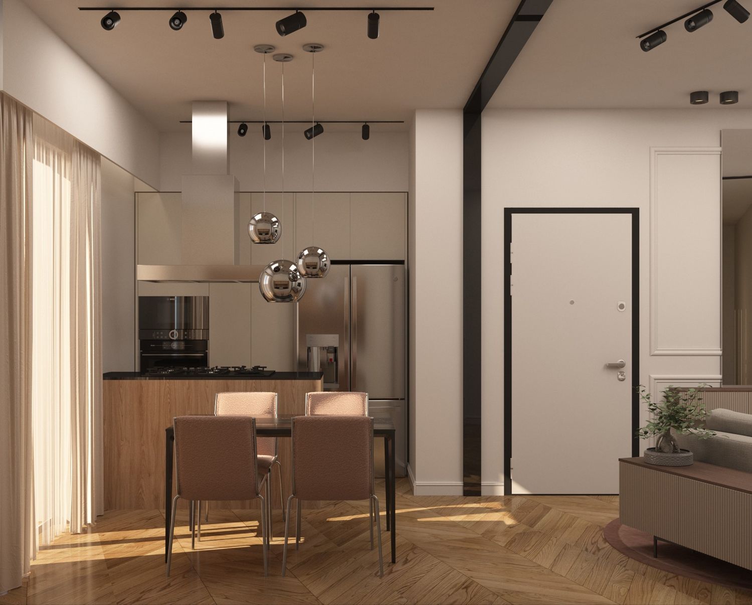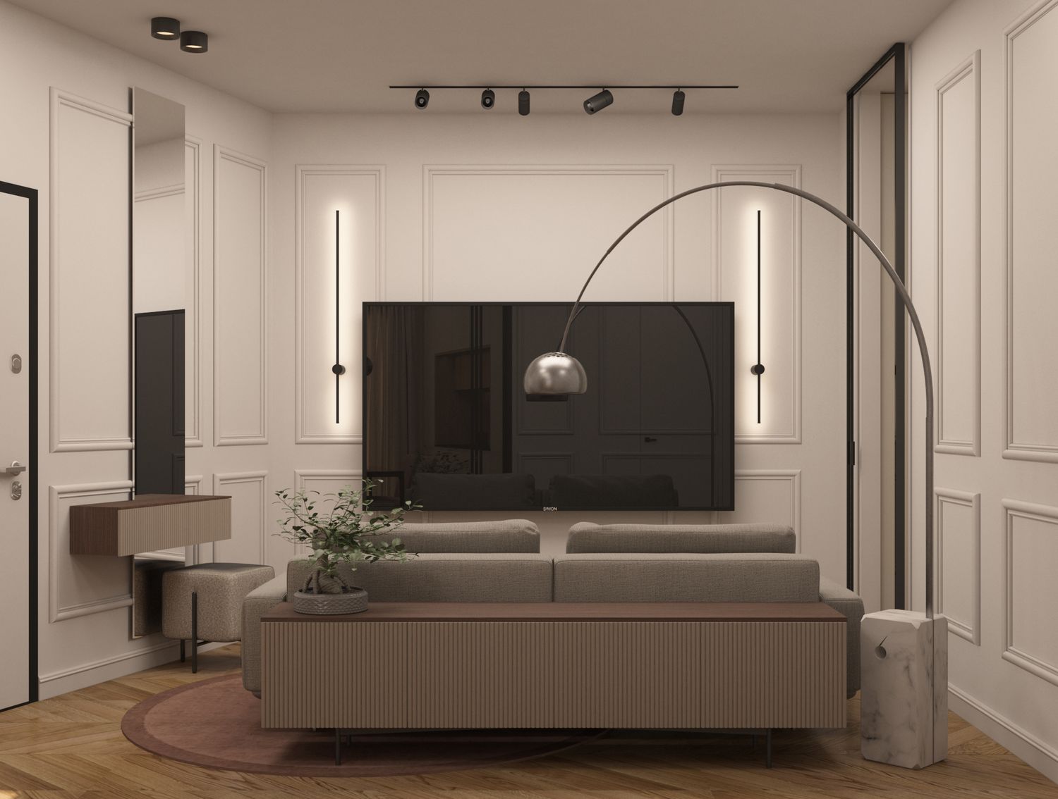 Come primo step ho realizzato gli scorrevoli vetrati per dividere soggiorno e cucina, ma all'occorrenza avere un unico ambiente. Per la cucina ho disposto una serie di colonne con frigorifero all'americana a libera istallazione nella nicchia a destra, mentre sulla parete di fronte ho lasciato la zona lavaggio per mantenere la posizione degli impianti, ma rivisitata inserendola tra due colonne, pensili e sovrapensili, ottenendo l'effetto cornice che richiedeva. Ho posizionato, poi, la penisola di fronte le colonne a destra (purtroppo lo spazio a disposizione non consentiva l'aggiunta dello snack) ed ho inserito un tavolo allungabile in continuità visiva con il living. Il soggiorno, infatti, funge da ingresso alla casa, arredato con ampio divano e tavolini. Le pareti sono state, poi, impreziosite dalla boiserie secondo i riferimenti che ci ha fornito ed ho inserito il condizionatore in cucina, quest'ultimo celato dal cartongesso (il quale fa anche da elemento di chiusura delle colonne per una maggiore pulizia visiva e linearità), con la possibilità di collegarlo all'unità esterna che sarà posta sul balcone facendo correre i tubi al suo interno ed inserendo anche una veletta illuminata in cui alloggiare la tenda.
