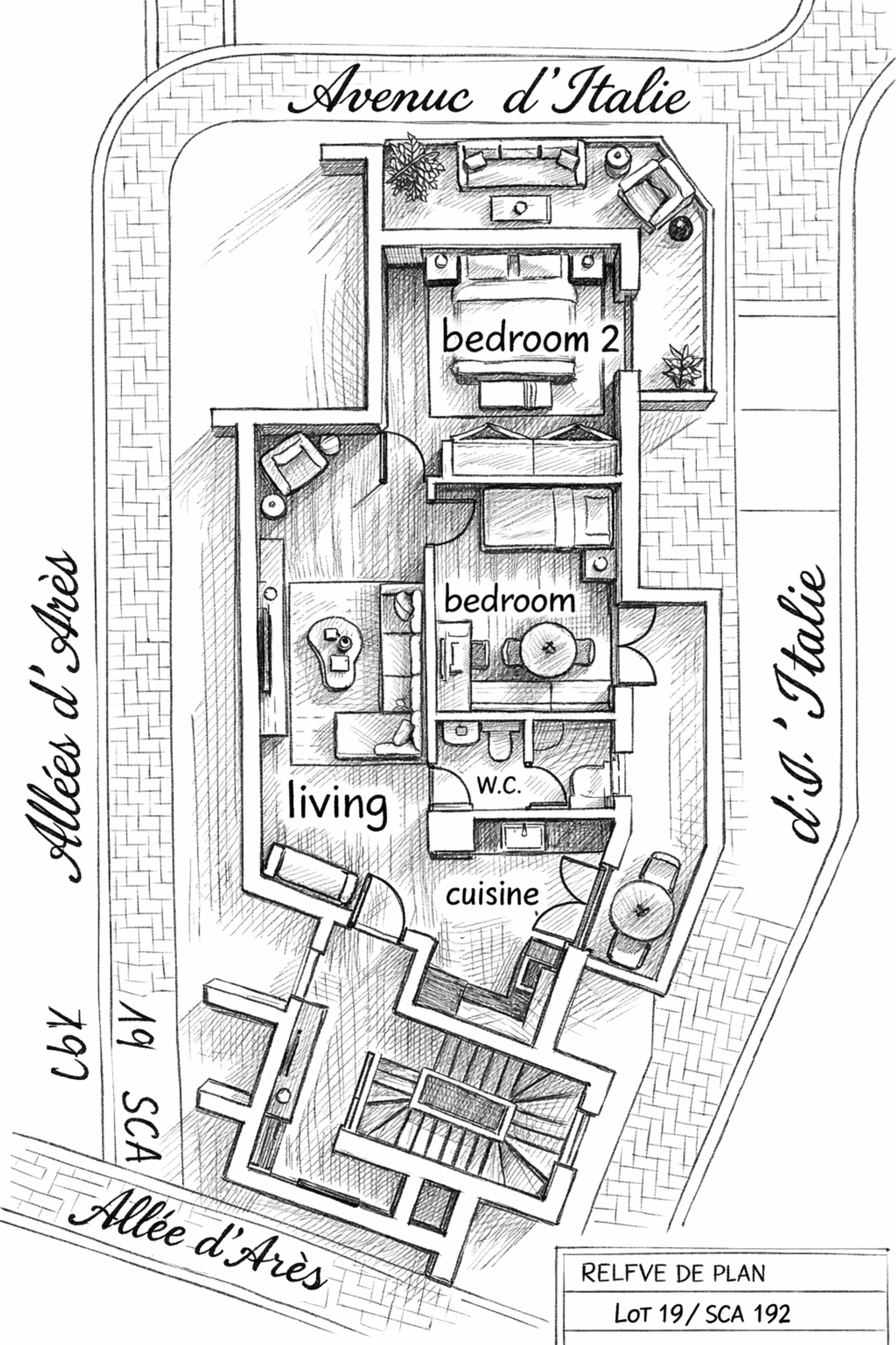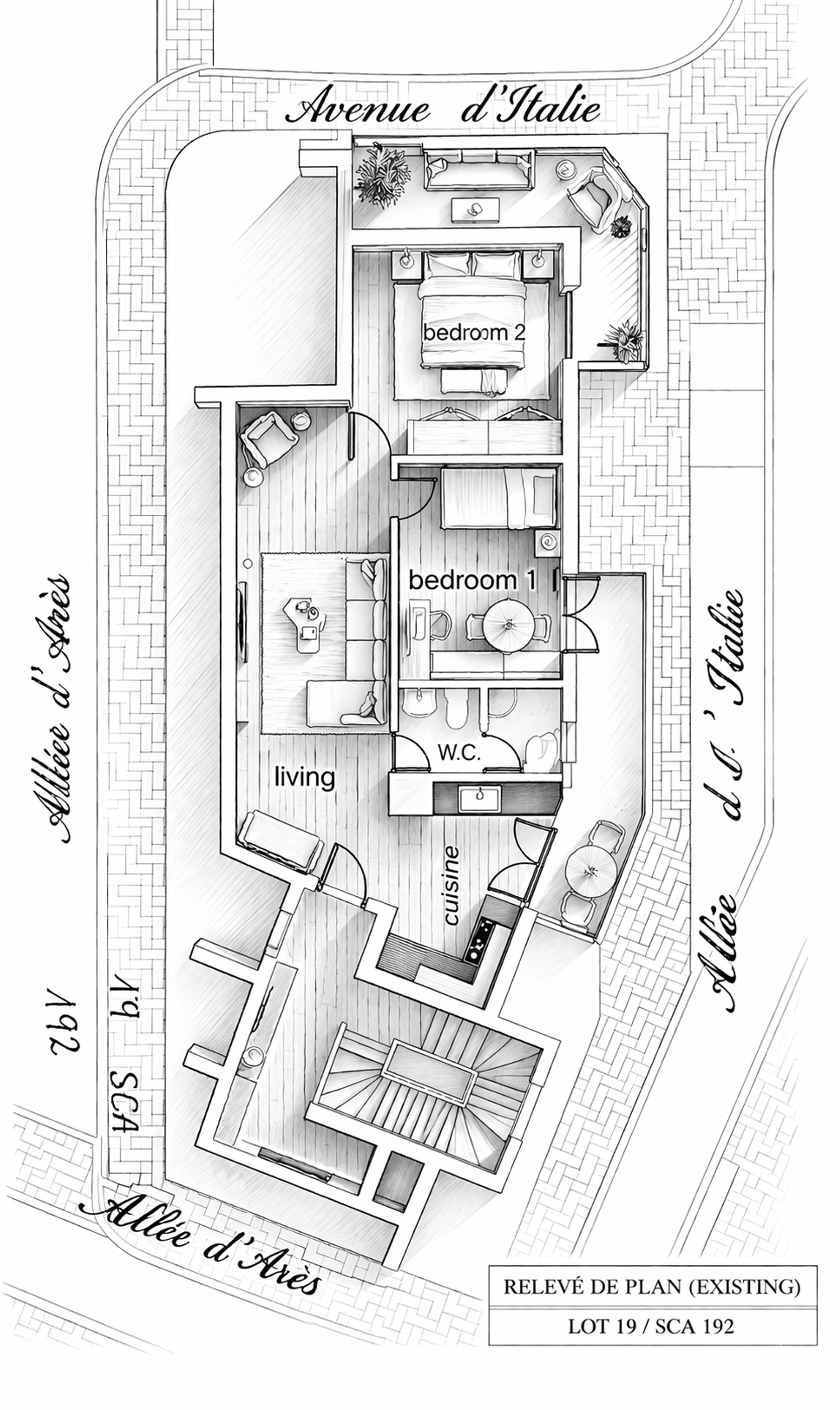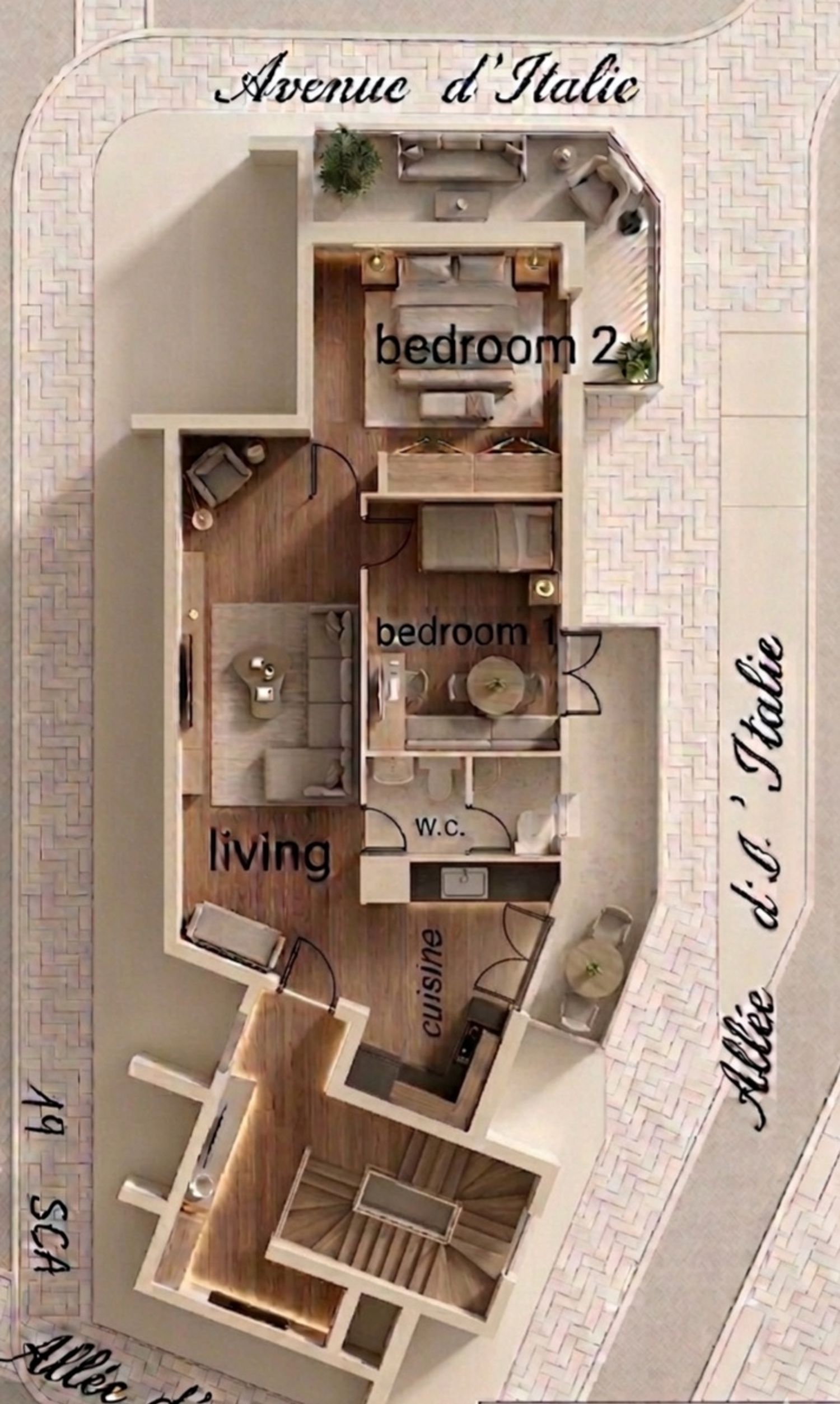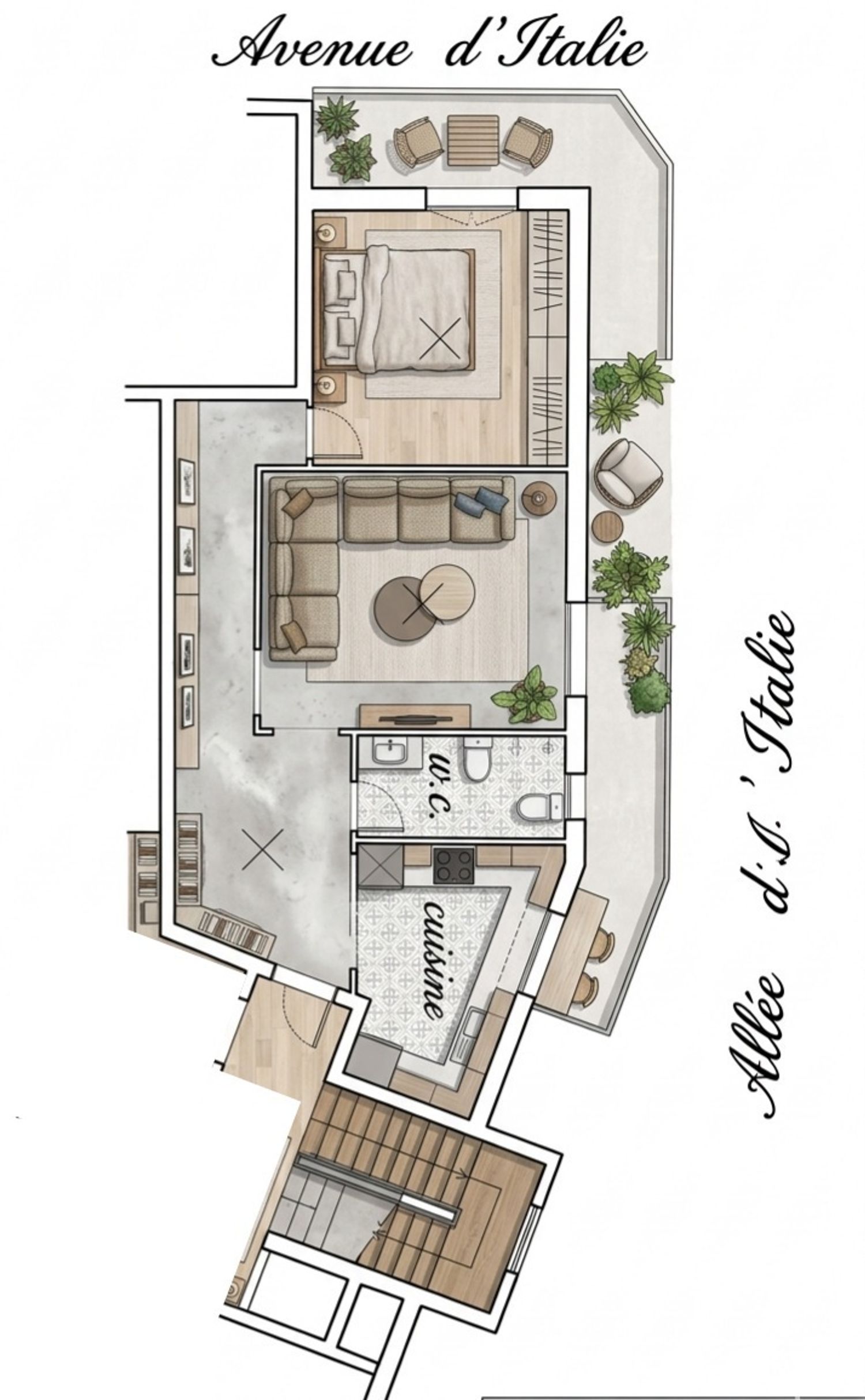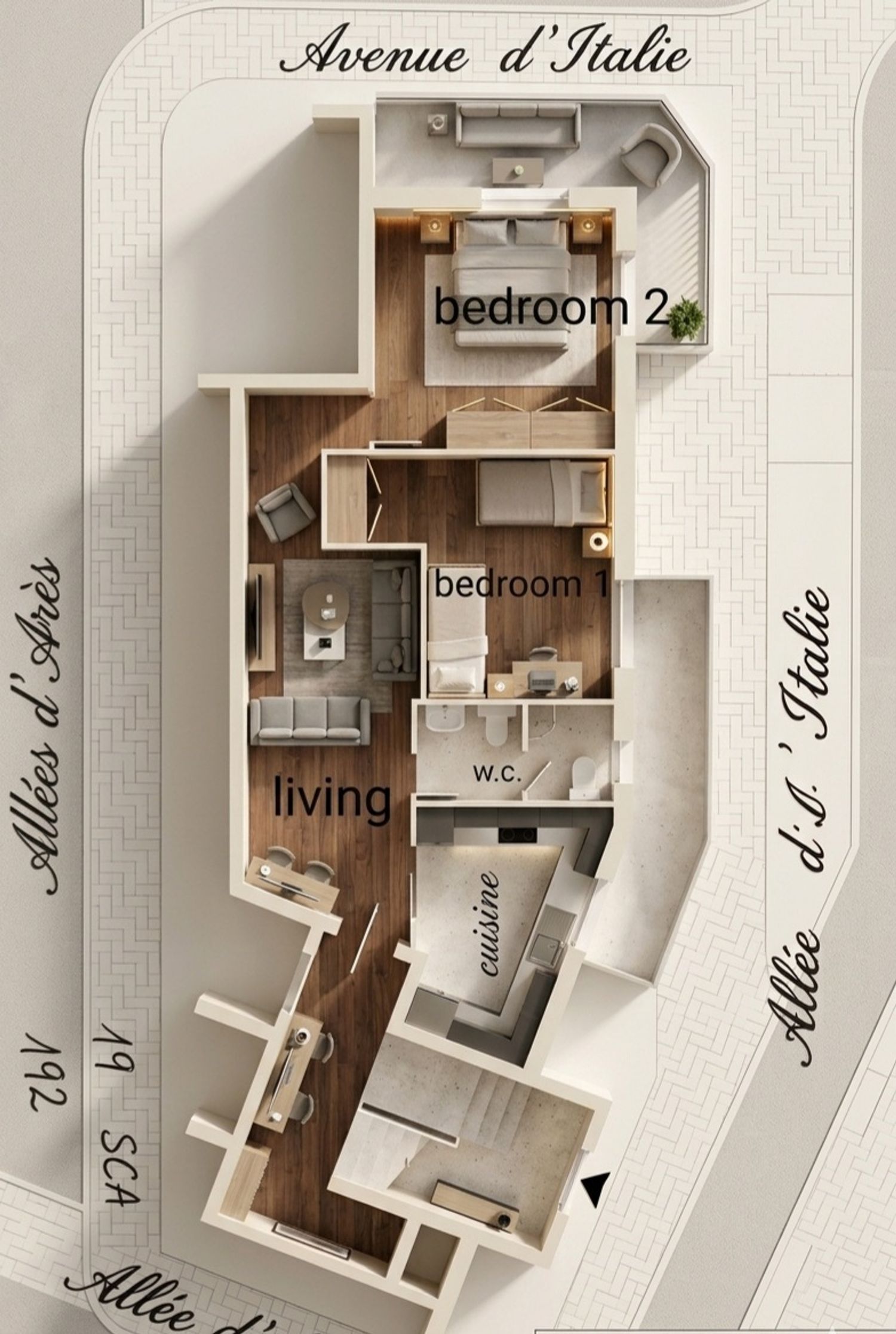 This plan effectively reconfigures the apartment to meet your needs, moving the living area to a new open-plan space with the kitchen, and dedicating the quieter, rear areas for a new master suite and second bedroom. A key focus was maximizing every square meter while maintaining a cohesive, minimal aesthetic throughout.