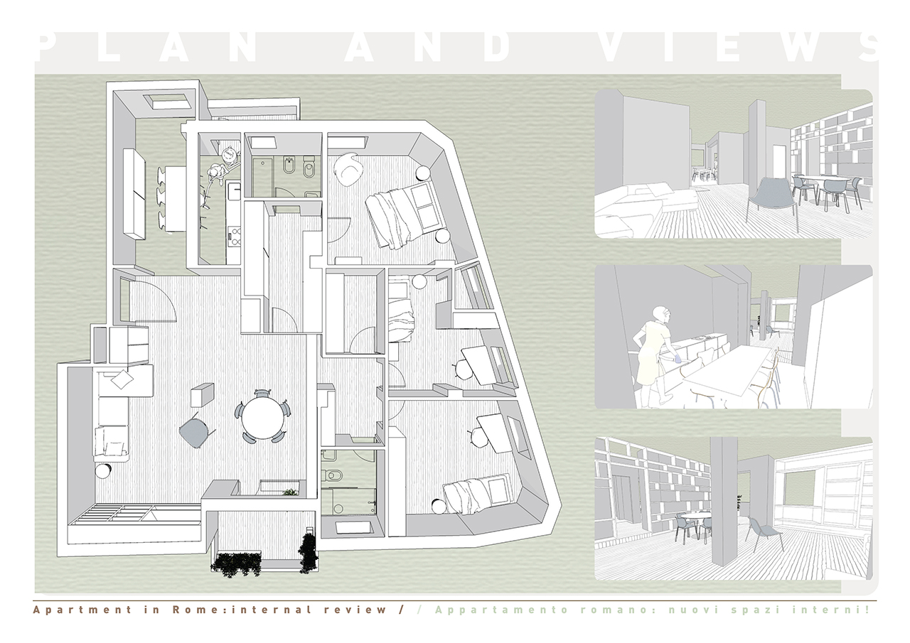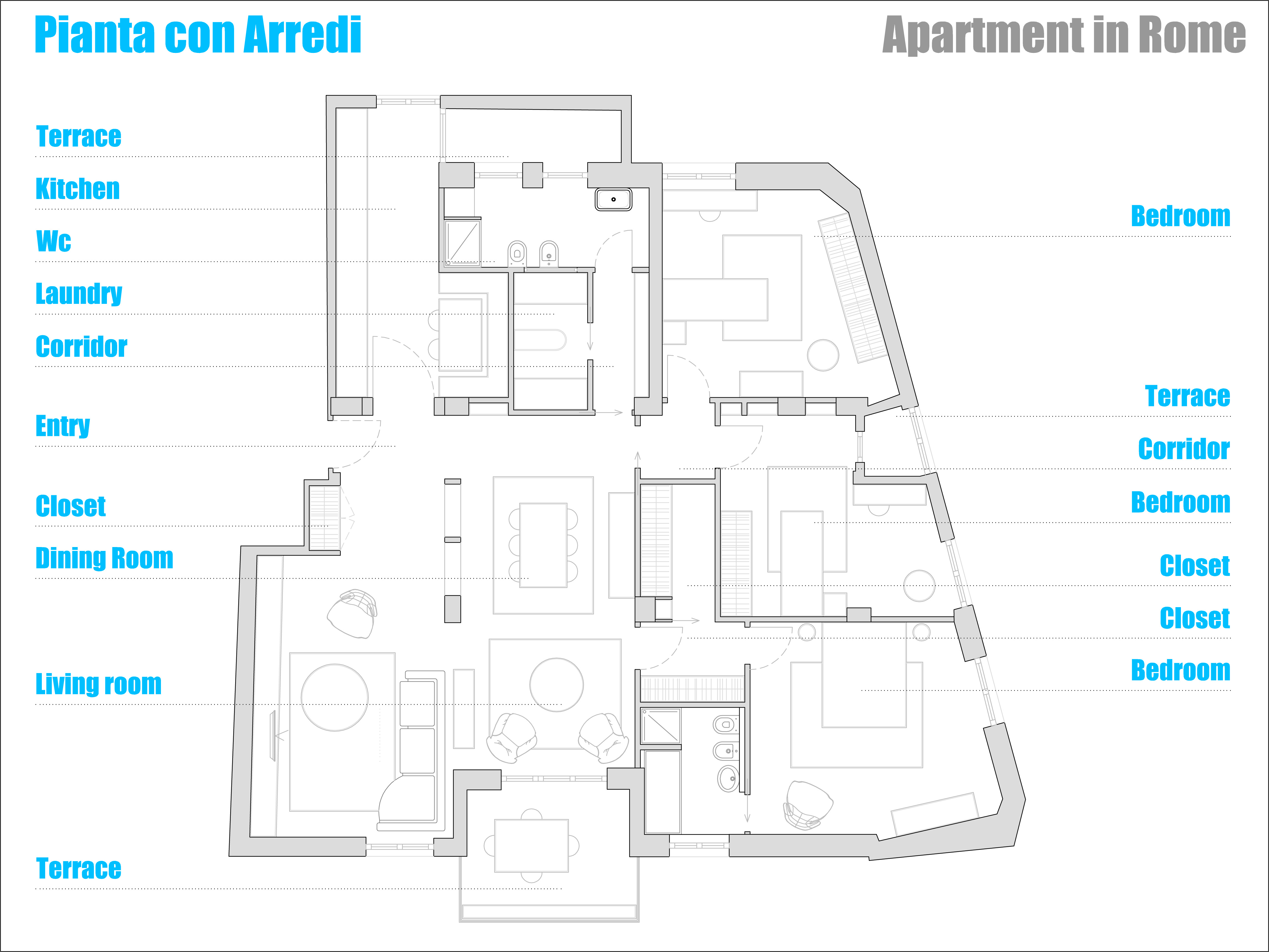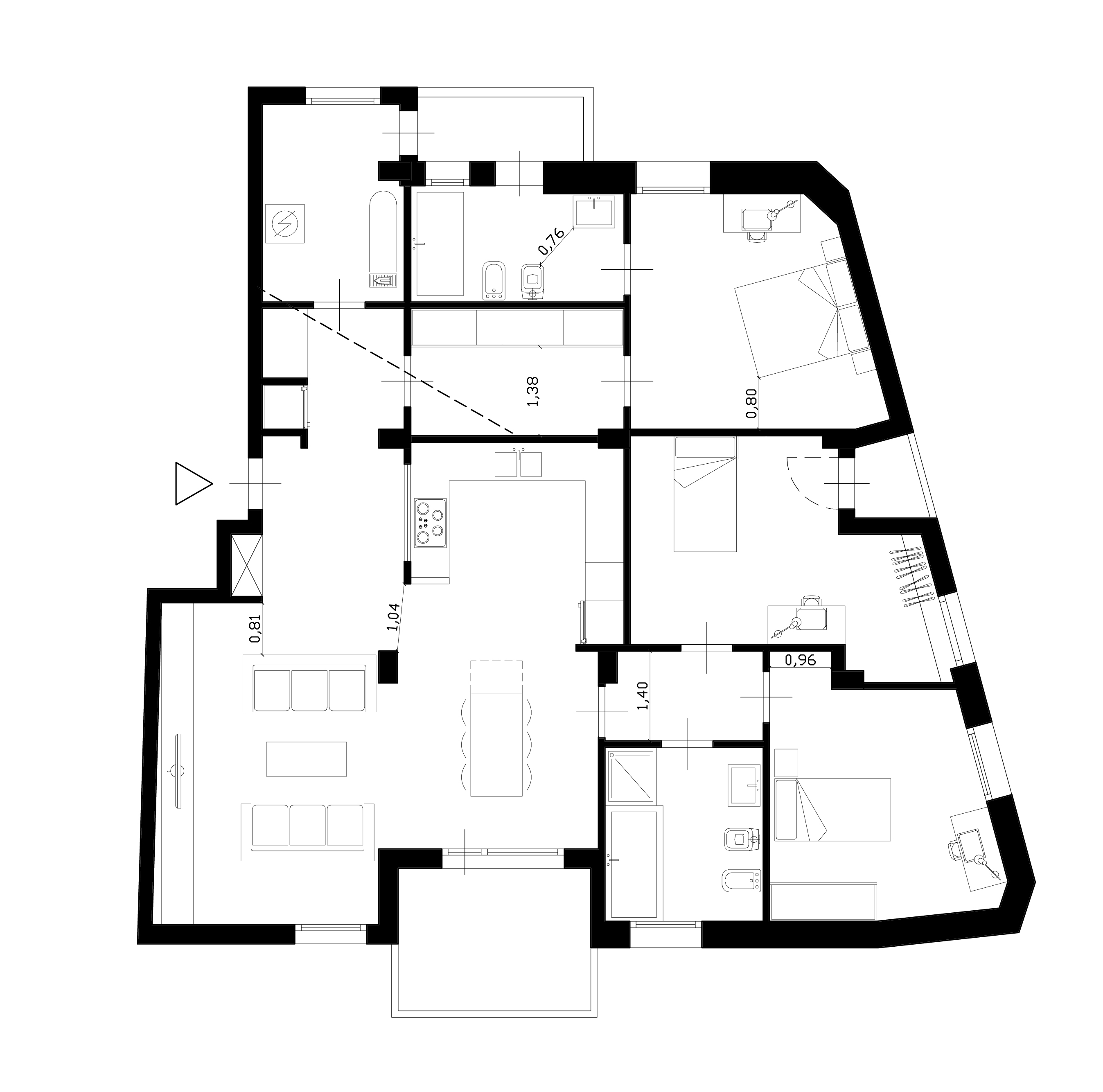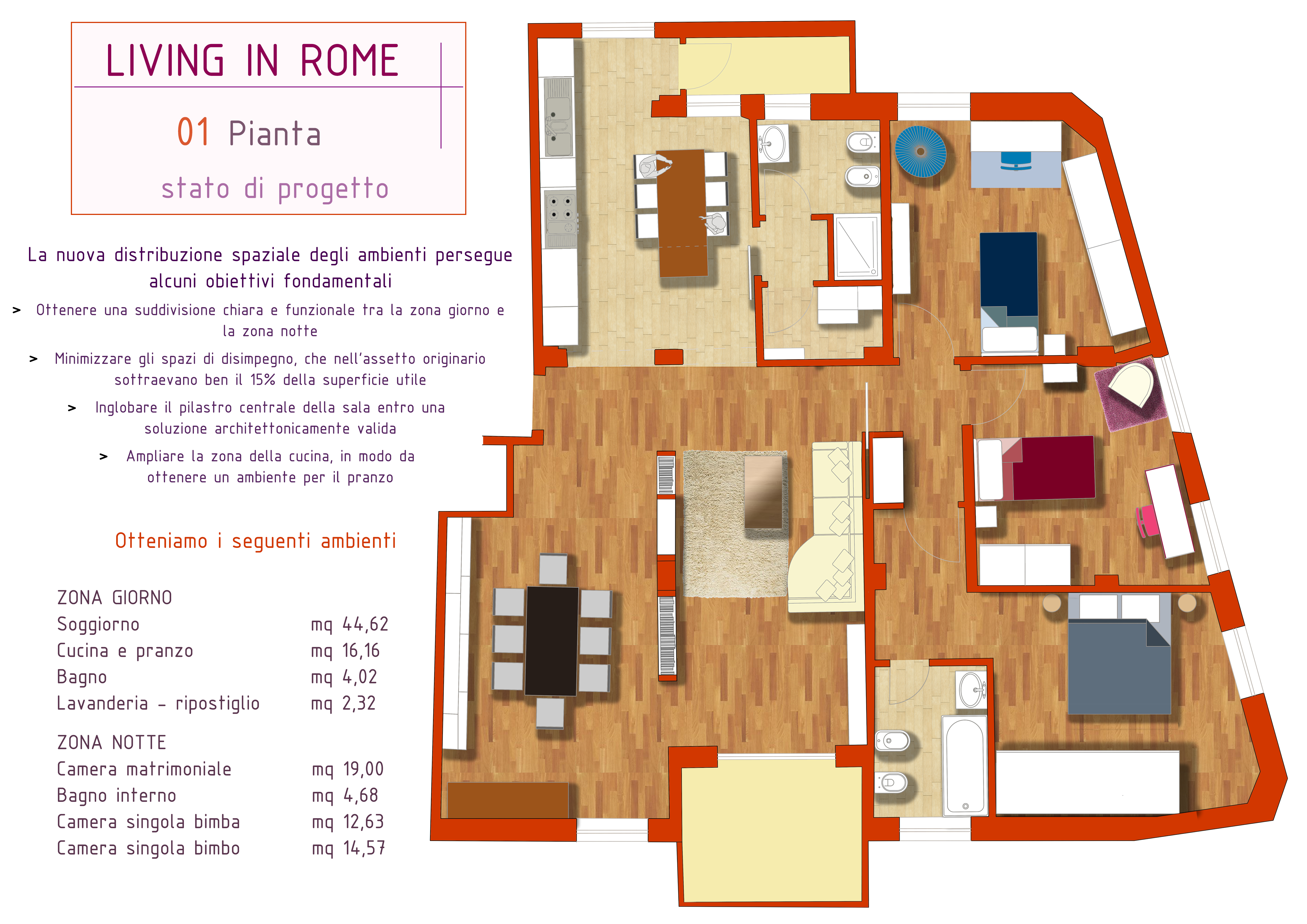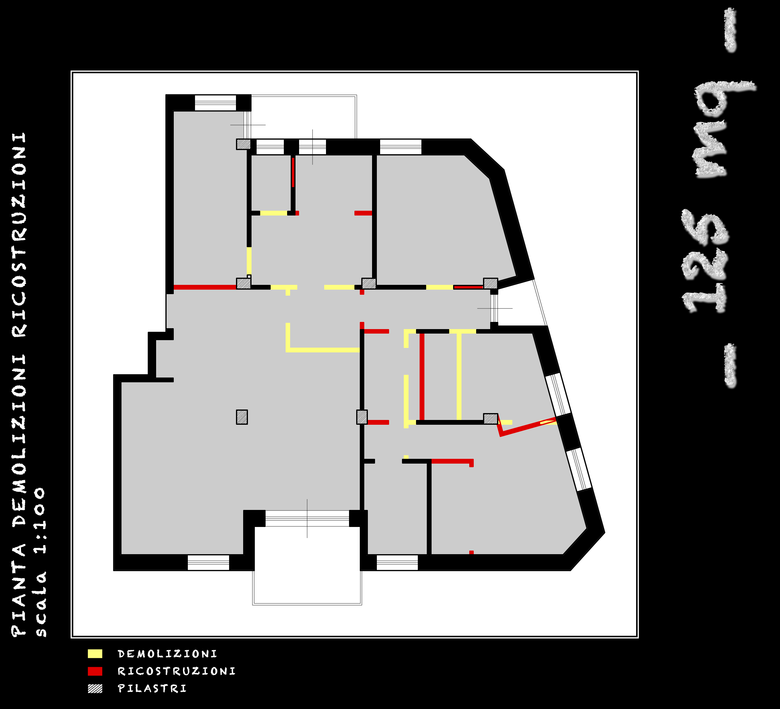 Devo ristrutturare un appartamento di circa 125 mq calpestabili. Fermo restando le posizioni attuali (ma non le dimensioni) di cucina e bagni, vorrei ottenere una netta divisione tra zona giorno e zona notte che includa: