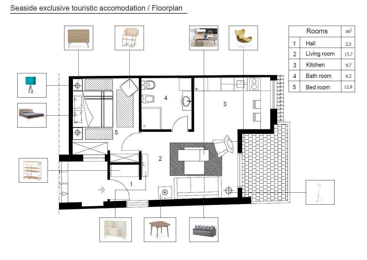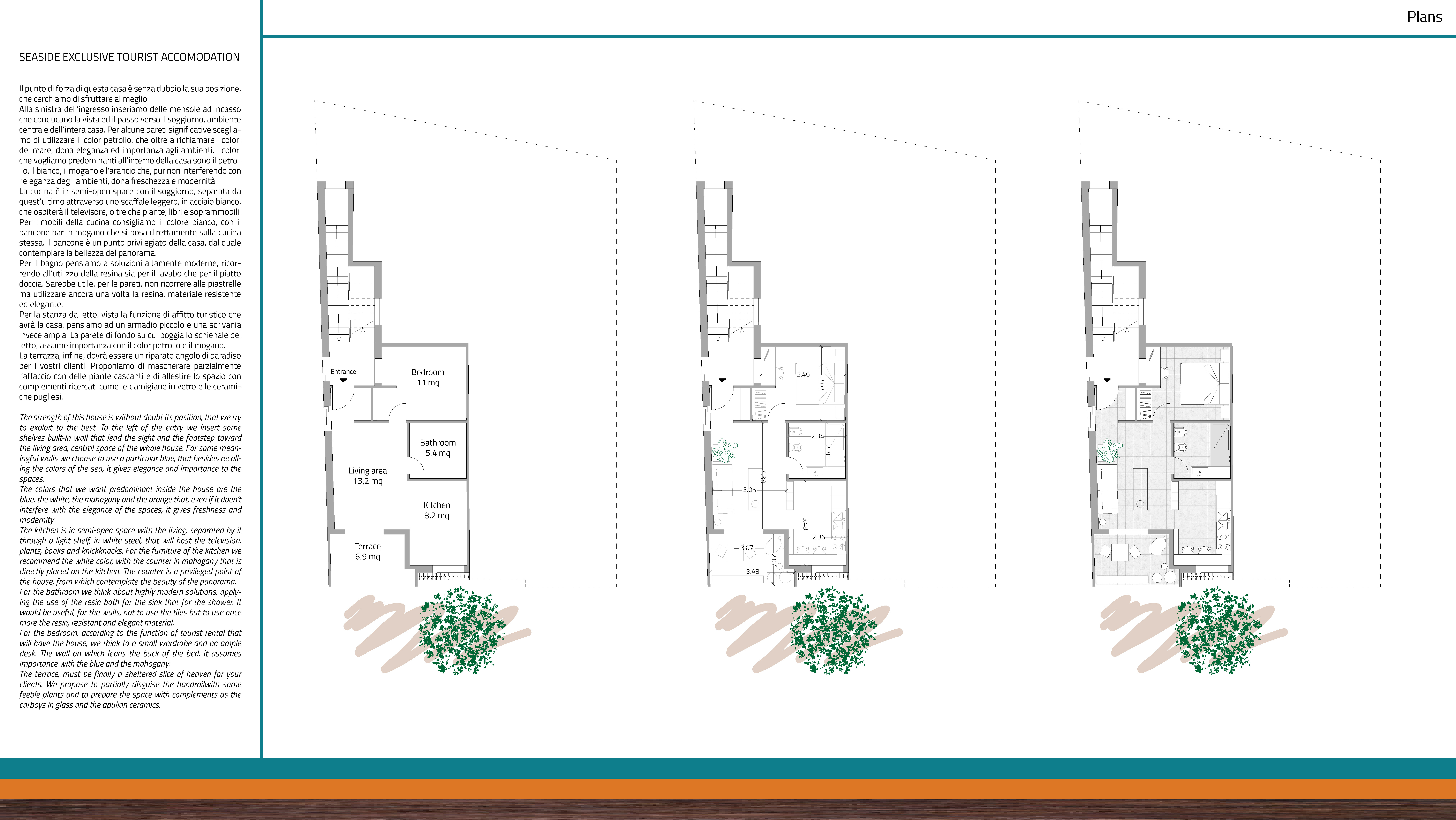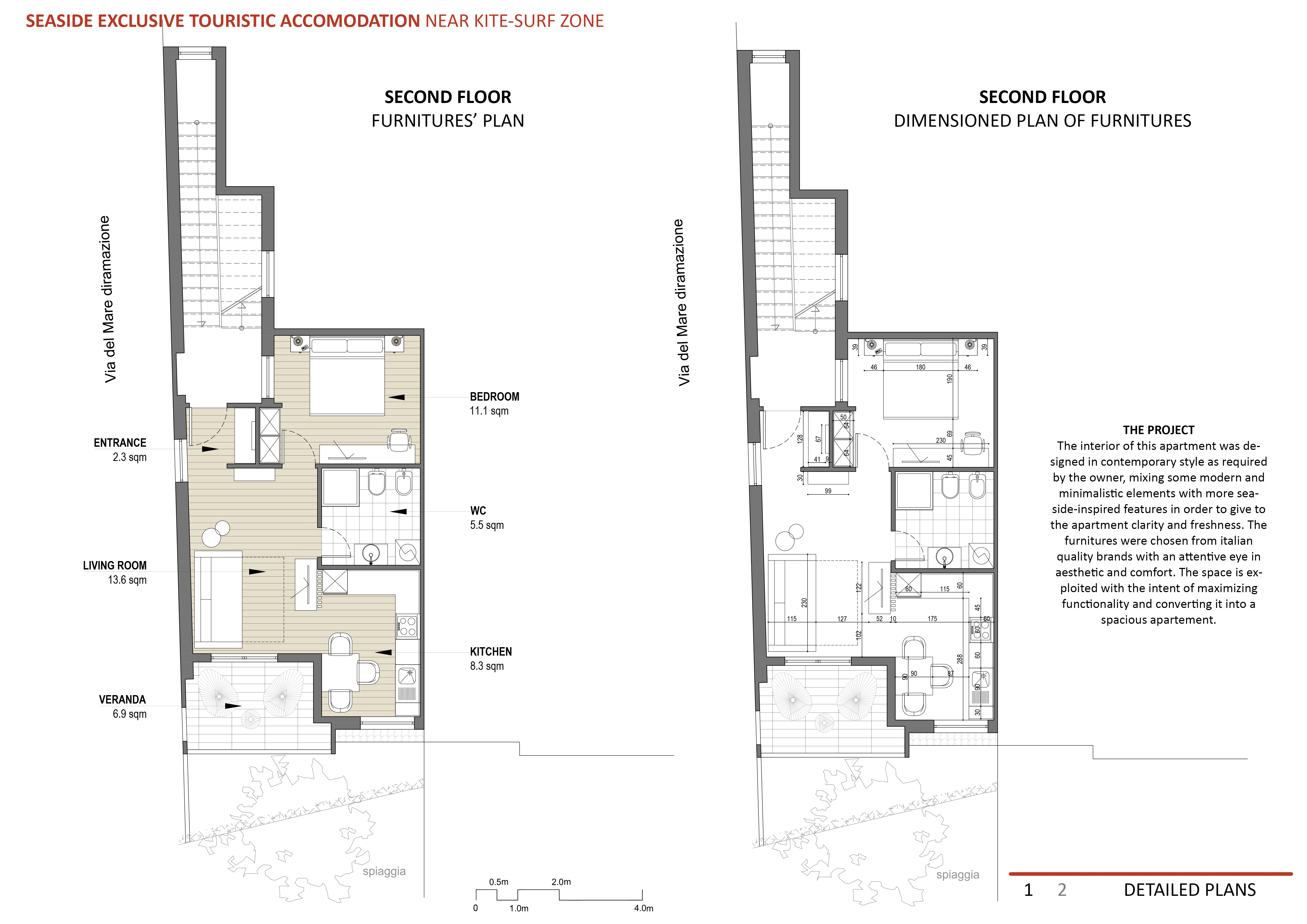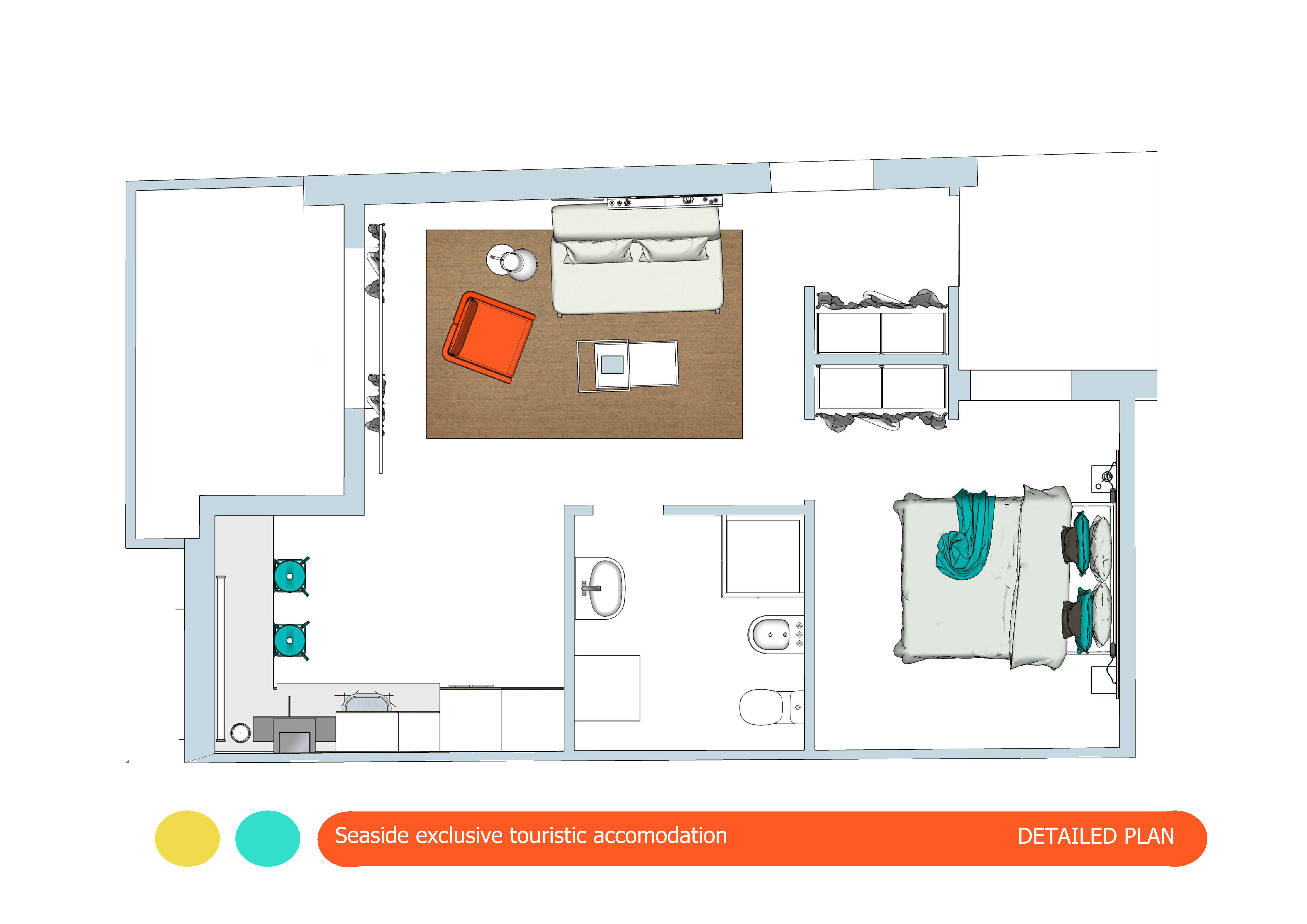 L'obiettivo è quello di arredare e attrezzare un appartamento esclusivo (con comfort elevato e livello qualitativo medio-alto) da utilizzare a fini turistici in una località balneare, situata in prossimità di impianti per il kite-surf. Il numero di persone da ospitare è da 2 a massimo 4 (utilizzando il divano-letto previsto). Le immagini di riferimento non sono vincolanti, mentre sono allegate insieme alle planimetrie anche le predisposizioni degli impianti della cucina, già realizzate.
