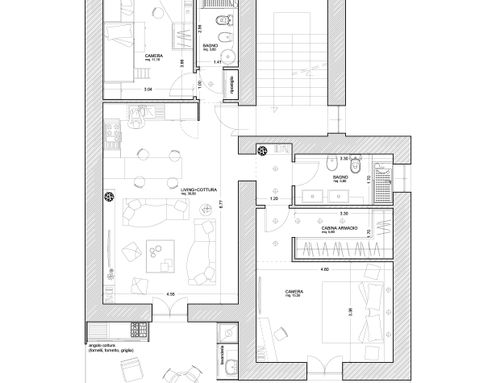 Io e la mia futura moglie vorremmo ristrutturare il nostro nuovo appartamento di circa 80 mq al fine di ridistribuire gli spazi ed ottenere una casa con uno stile moderno e funzionale. Apprezziamo le linee pulite e amiamo l’ottimizzazione degli spazi.