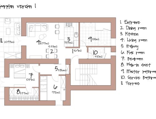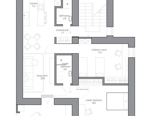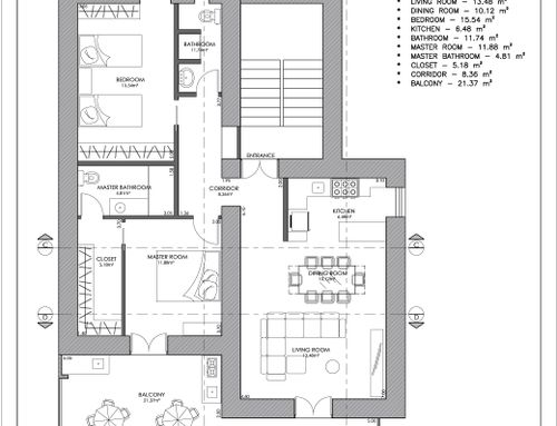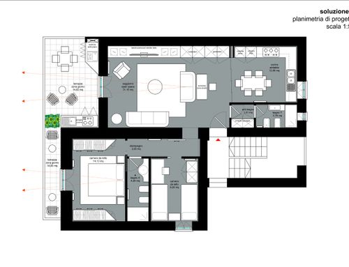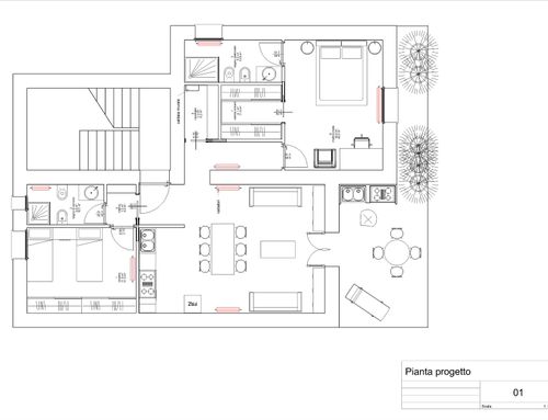 - Inserire nel corpo di fabbrica di sinistra la zona giorno e nel corpo di fabbrica di destra la zona notte padronale con bagno;