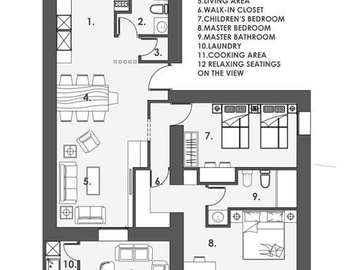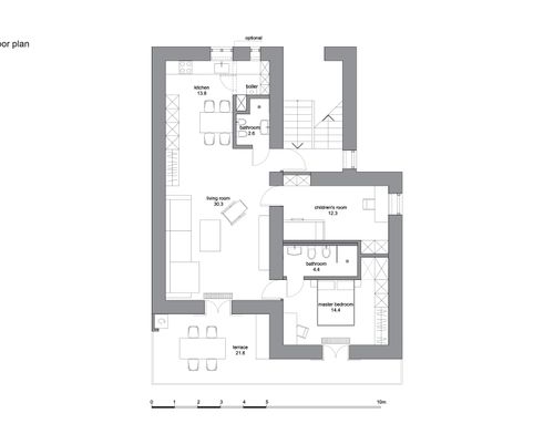 - Enter the living area in the left-hand side of the building and the master bedroom with bathroom in the right-hand building;