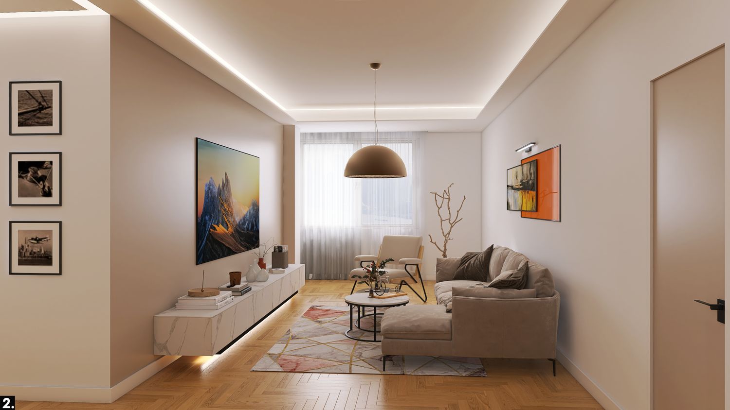 Entrambi i bagni saranno dotati di eleganti docce walk-in, per un tocco contemporaneo e pratico. Per visualizzare meglio le scelte estetiche, sono stati realizzati due rendering della zona giorno: uno con parquet rovere a spina di pesce(caldo e raffinato) e l'altro con gres porcellanato effetto sabbia(sobrio e materico), per offrire una chiara visione delle potenzialità del progetto in termini di materiali e finiture.