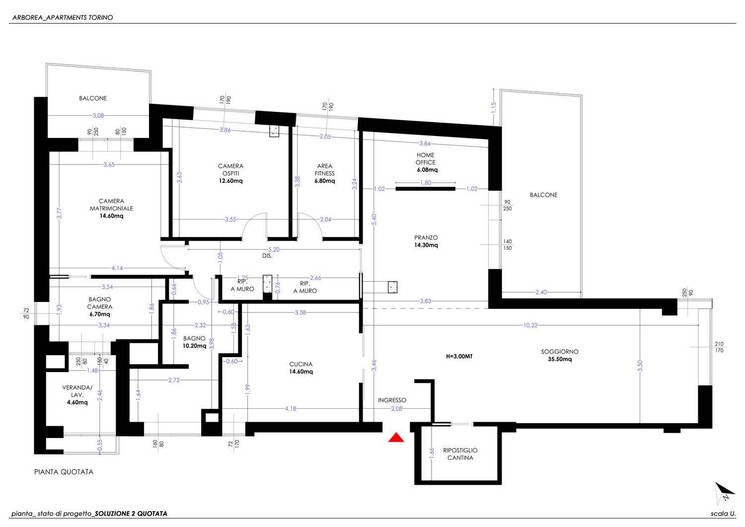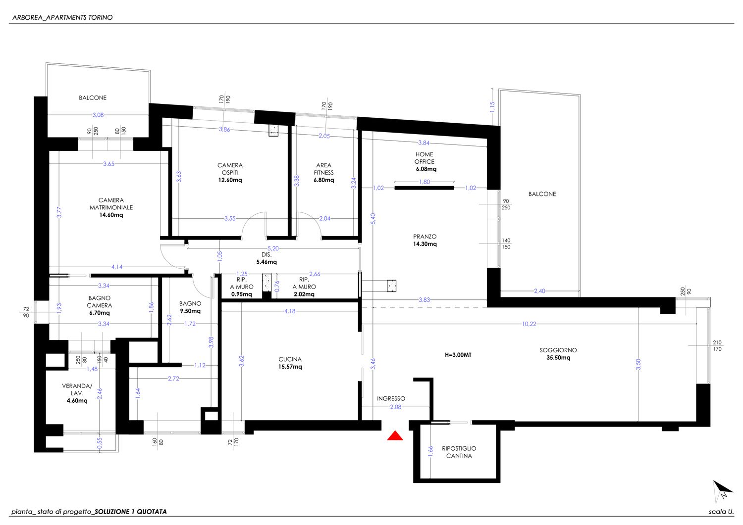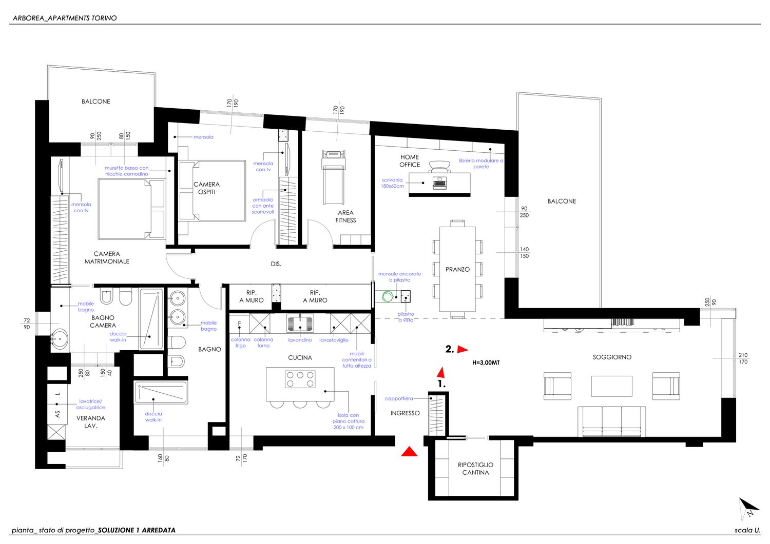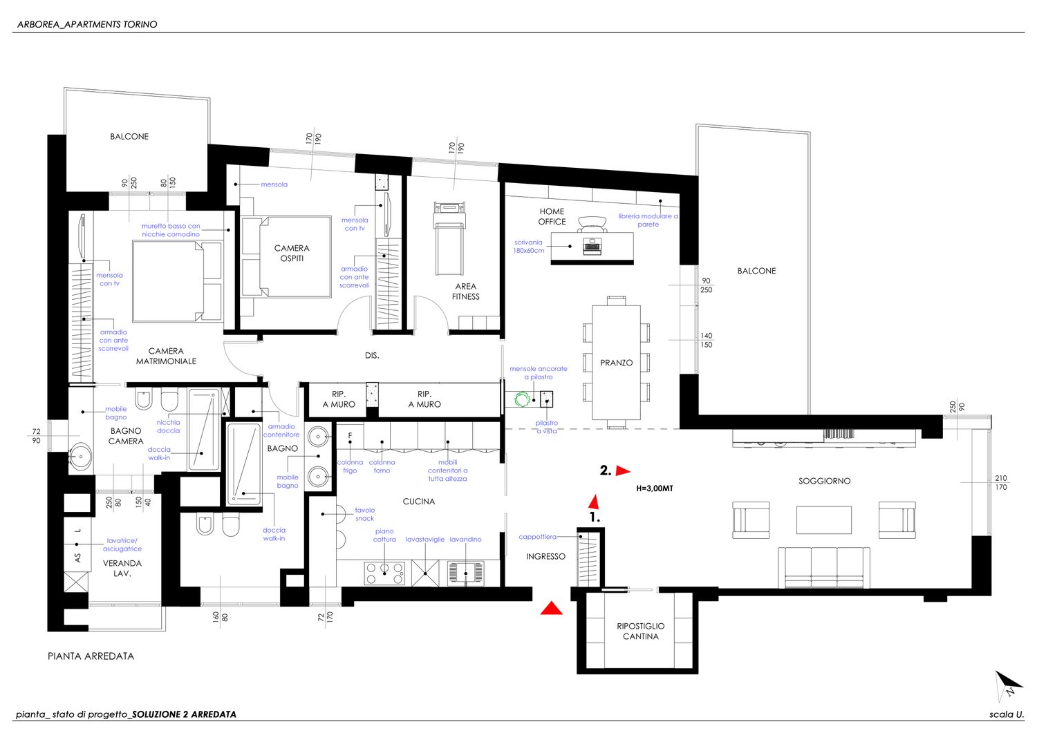 per la ristrutturazione del vostro appartamento ho sviluppato due varianti progettuali, differenziate unicamente nella configurazione del bagno e della cucina, tenendo conto di tutte le vostre richieste ed esigenze.