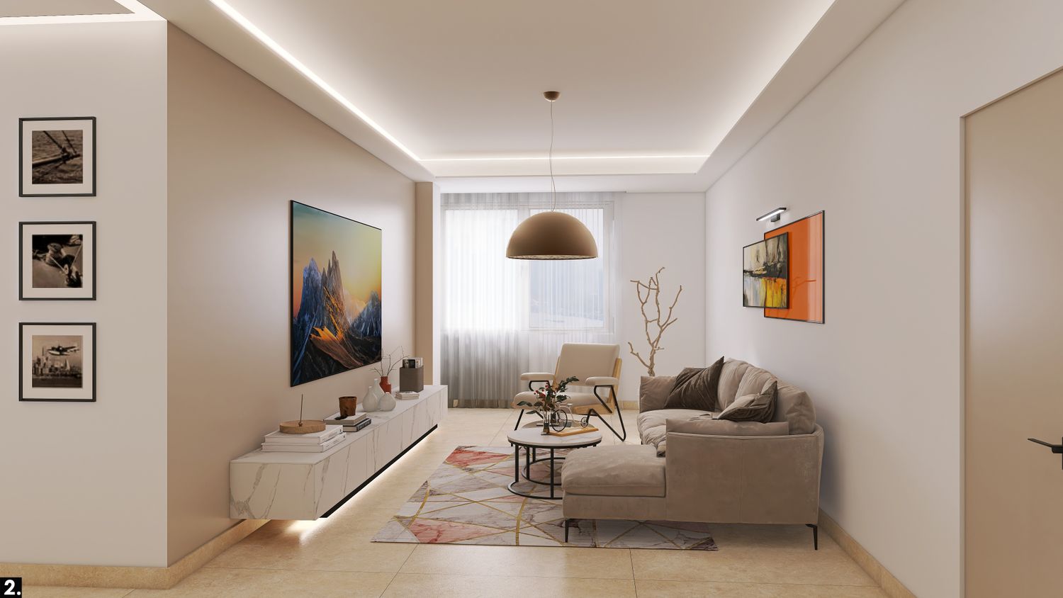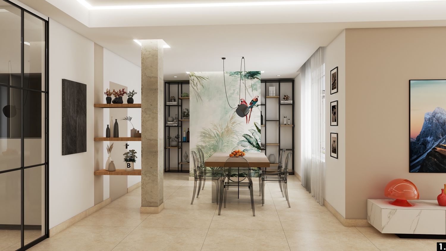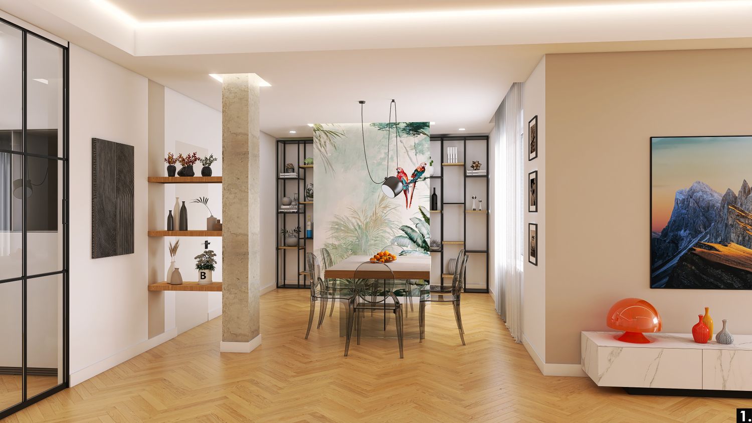 Il pilastro nella zona giorno ,lasciato volutamente grezzo, diventa protagonista e verrà inglobato nella controsoffittatura, con mensole decorative ancorate alla sua superficie.