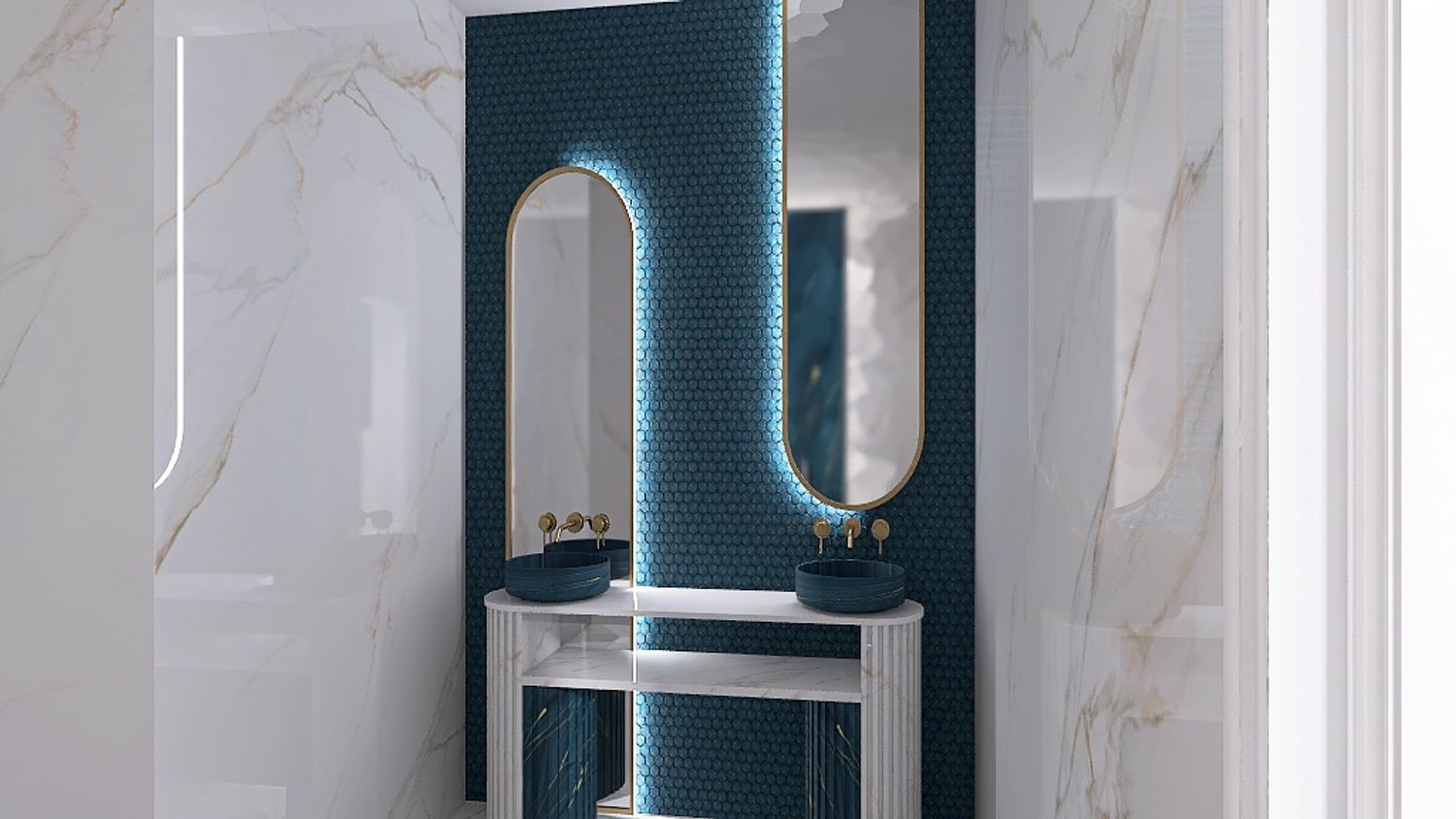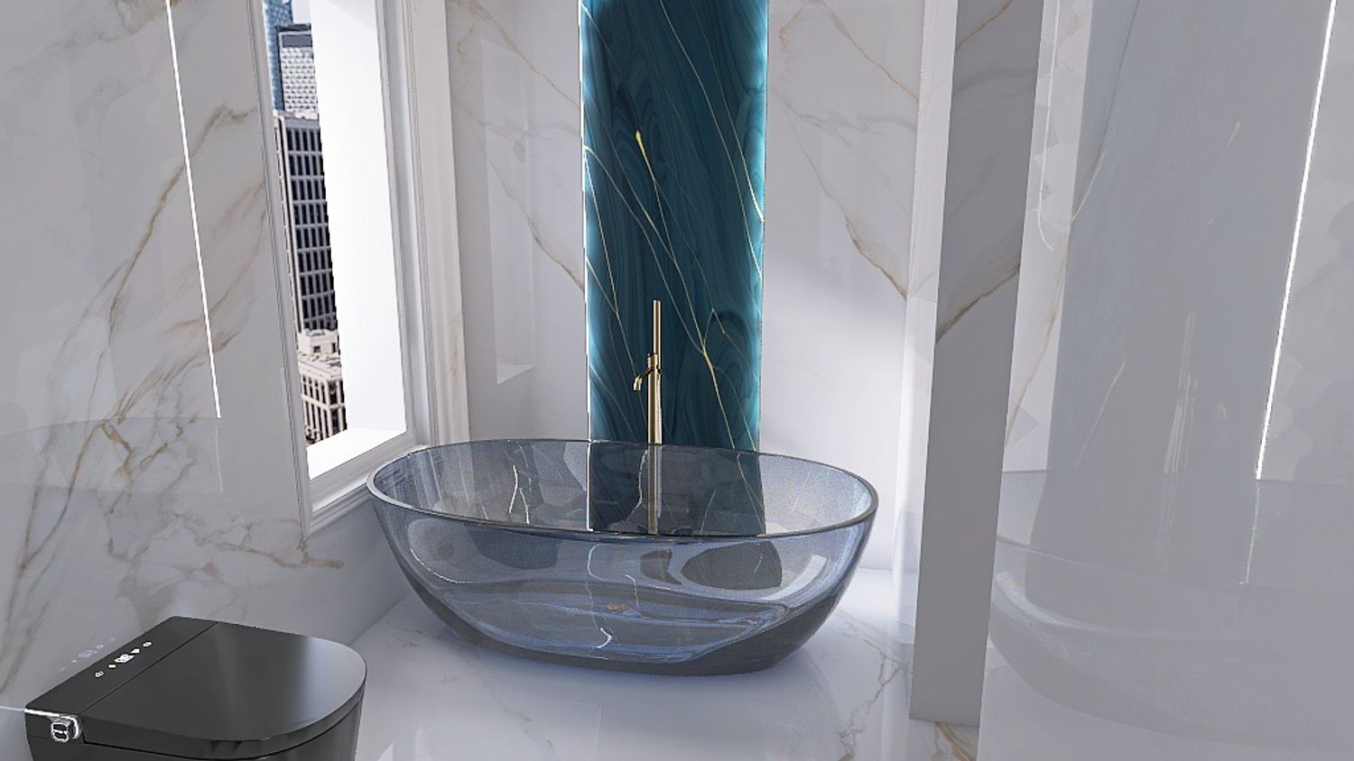 A refined and modern design featuring white marble surfaces with golden veins, enhanced by a striking deep blue decorative column. The transparent glass washbasin adds lightness and elegance, while the golden faucet highlights a luxurious touch.