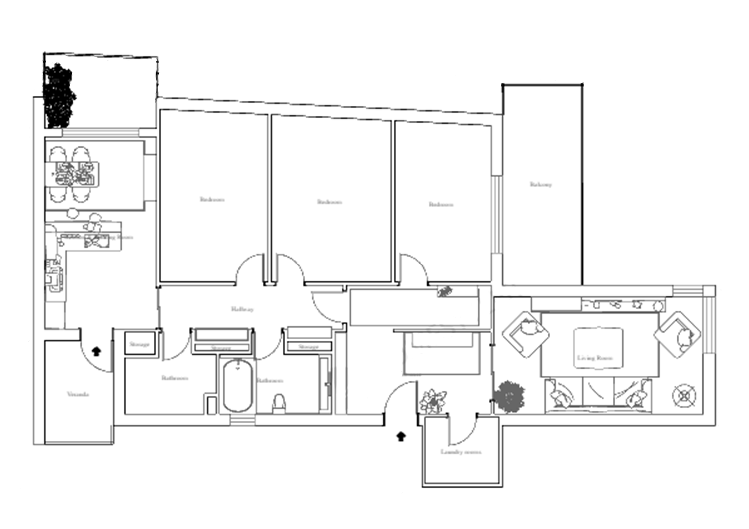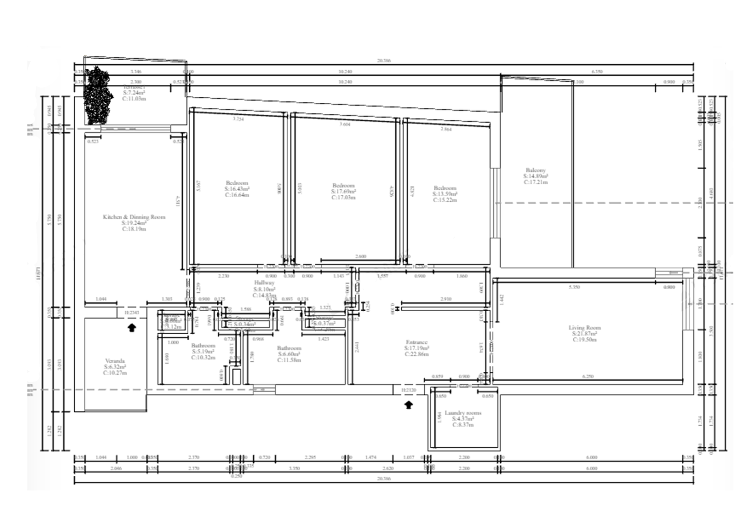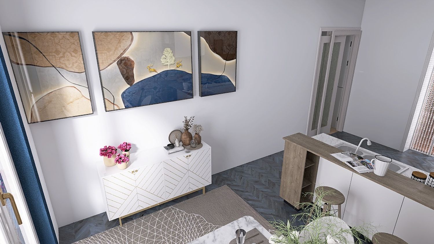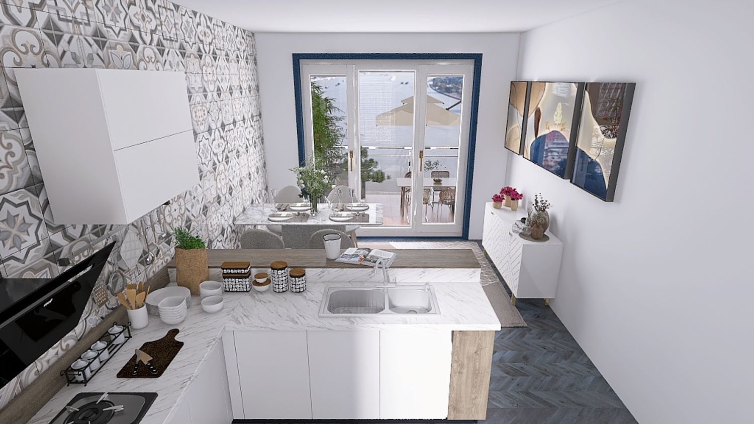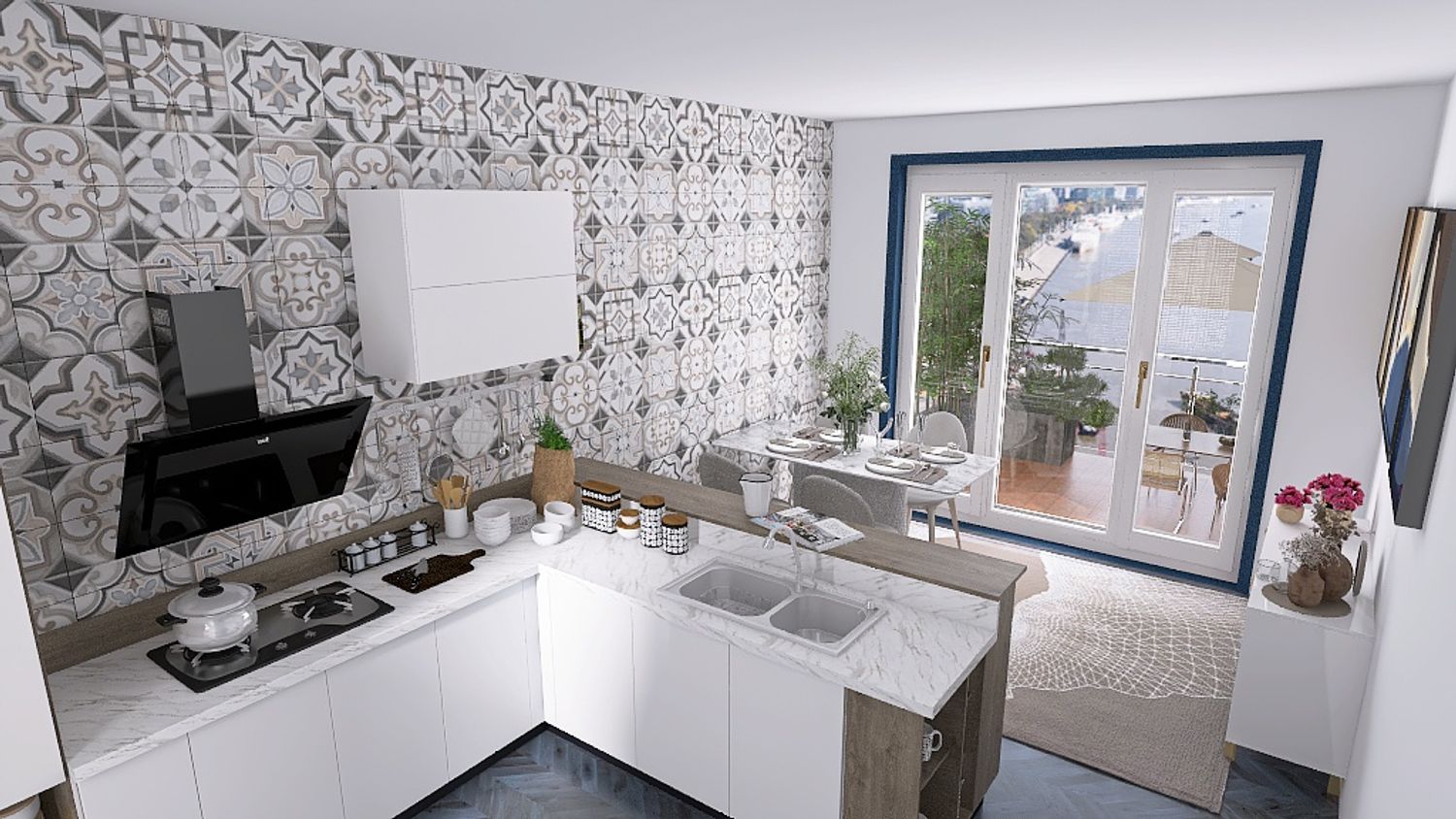 A bright and functional space where white dominates to enhance clarity. The marble countertop and patterned geometric backsplash bring a Mediterranean decorative touch. The open layout towards the dining area and large glass doors promotes conviviality and maximizes natural light.