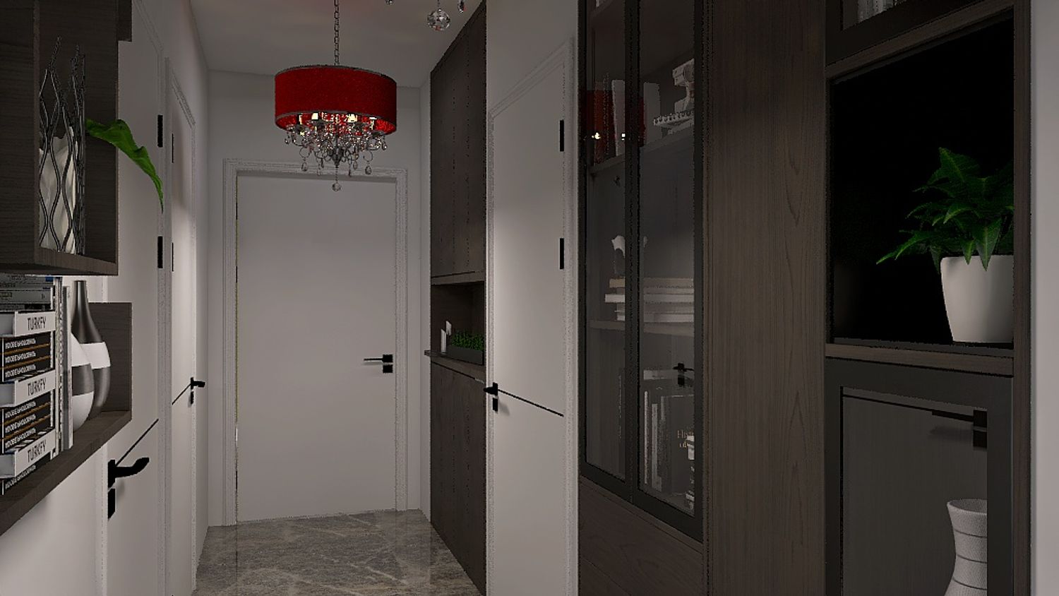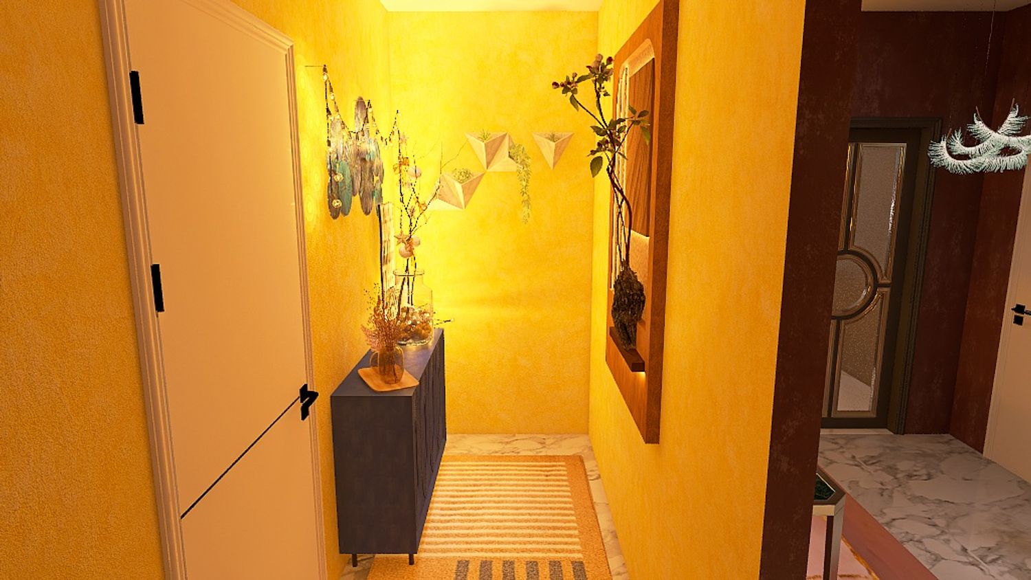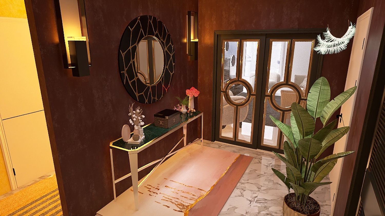A warm and welcoming atmosphere with dark brown walls, elevated by golden wall lighting. The artistic framed mirror and sleek console table add character, while the green plant and golden details on the doors create an elegant and sophisticated ambiance.
