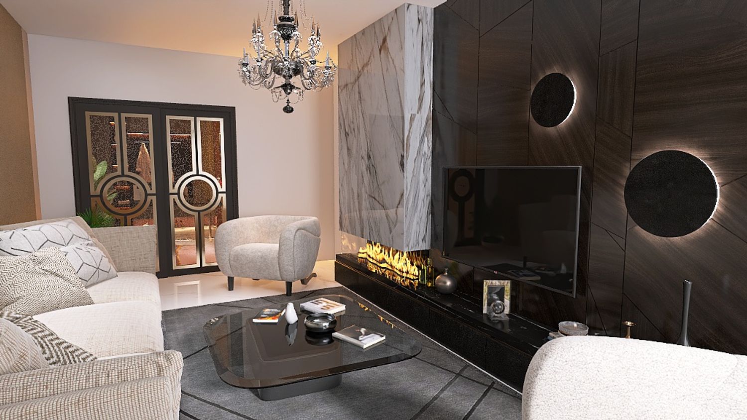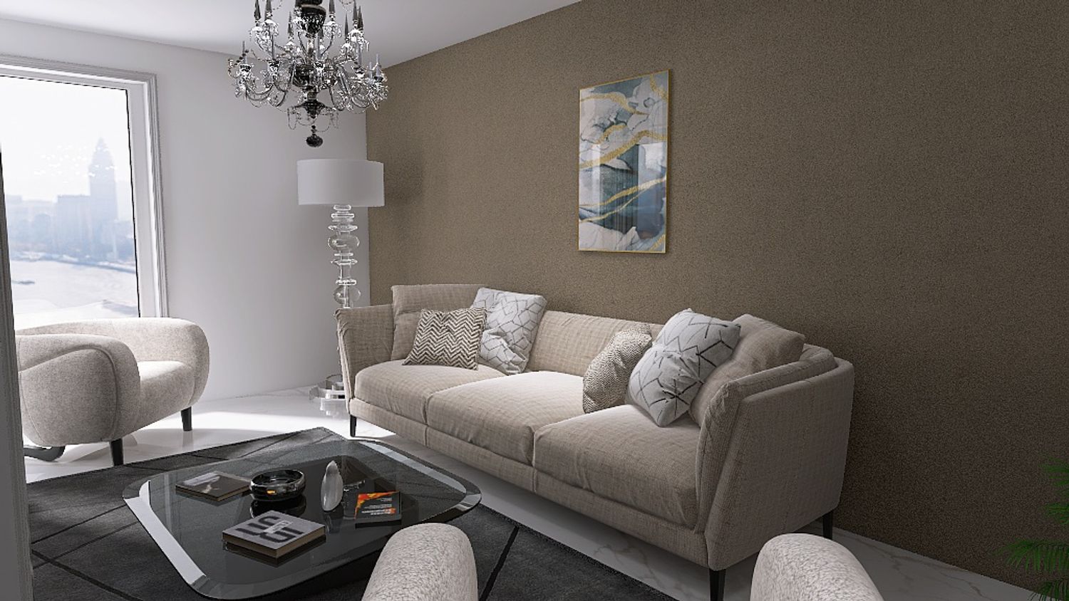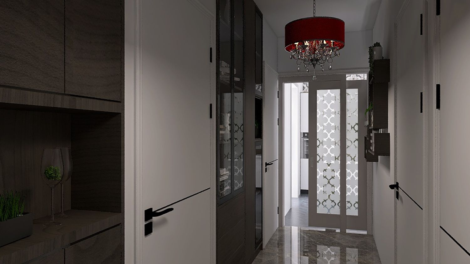 A warm and welcoming atmosphere with dark brown walls, elevated by golden wall lighting. The artistic framed mirror and sleek console table add character, while the green plant and golden details on the doors create an elegant and sophisticated ambiance.