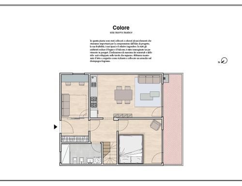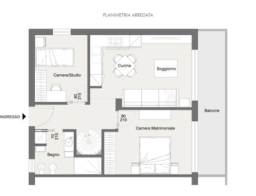 Vogliamo aprire gli spazi ampliando la sala per includere anche l'angolo cucina, utilizzando, per quanto possibile, anche lo spazio dell'ingresso/disimpegno. Parte della cucina costituirà una piccola stanza/studio; nell'attuale sgabuzzino (eventualmente eliminandolo come spazio chiuso a se stante) vorremmo mettere una scala interna fissa per accedere al terrazzo soprastante.