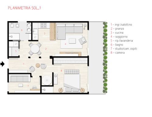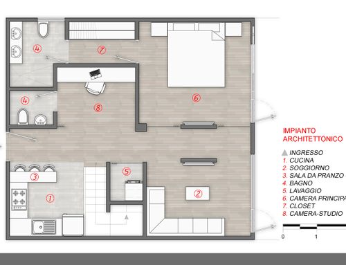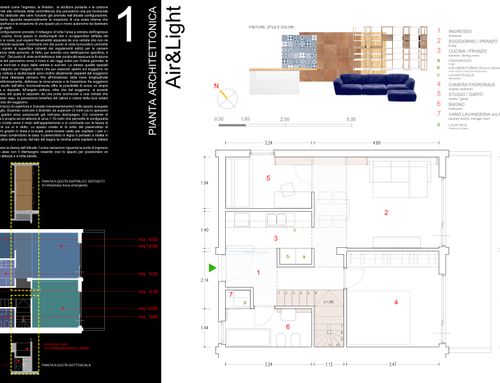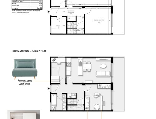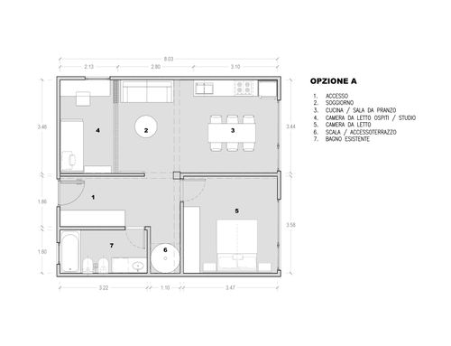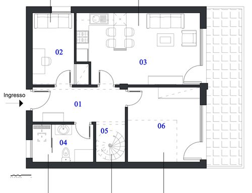 We want to open up the spaces by expanding the living room in order to include the kitchen corner, using, as far as possible, also the vestibule.