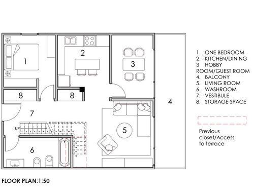 * utilizar el espacio de almacenamiento para una escalera fija para acceder a la terraza de arriba (el trastero puede eliminarse y la escalera visible)