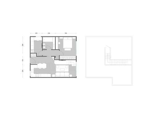 The house faces south east; the walls of the living room and bedroom are entirely covered by windows that lead to the balcony.