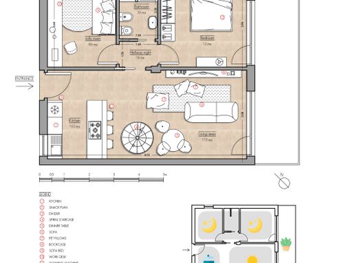 Los espacios y materiales deben tener en cuenta la presencia de 4 perros y 4 gatos. Dada la ubicación del apartamento, el estilo que nos parece más apropiado es el mediterráneo.