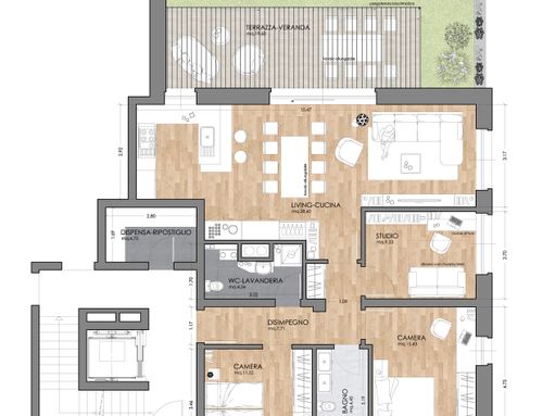 - Sulla terrazza potrebbe essere possibile fare una veranda chiusa e riscaldata per un utilizzo anche d'inverno Questo deve essere ancora confermato dal costruttore.